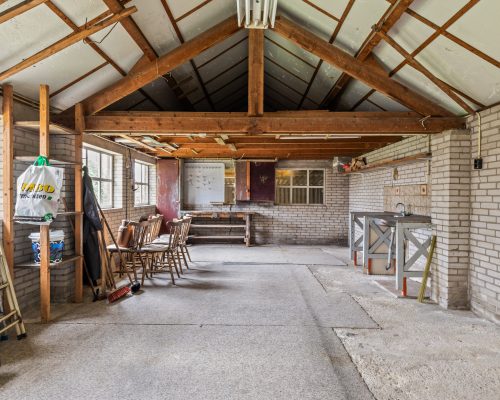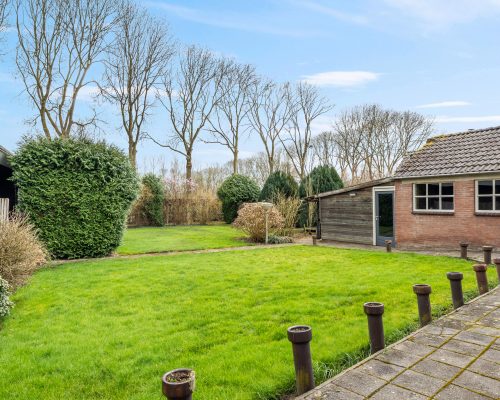 De ruime achtertuin ligt op het zuiden. Hier ben je altijd verzekerd van een plekje in de zon. De tuin is eenvoudig aangelegd. In het seizoen geniet je volop van het buitenleven omgeven door groen van de volwassen bomen op het achterliggende terrein en met ruimte om bijvoorbeeld je eigen groentetuin aan te leggen. Je geniet hier volop van je privacy. Achter op het perceel staat een open schuur voor opslag. Een grote garage maakt het plaatje af. Deze biedt veel mogelijkheden met 37m2 aan ruimte. Om te klussen, spullen op te bergen, ook op de vliering, of om je auto te stallen. Er is water, elektra en er zijn aansluitingen voor witgoed aanwezig. Achter de garage is een houten schuurtje aangebouwd voor extra opslag.