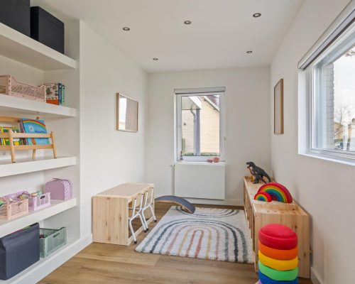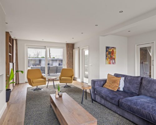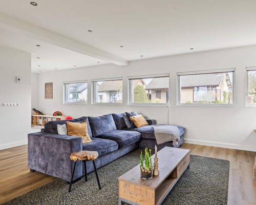 De Woonkamer Geeft Ruimte Aan Een Speelhoekje Voor De Kinderen Maar Evengoed Is Deze Ruimte Bijvoorbeeld Prima In Te Richten Als Kantoorruimte. De Woonkamer Heeft Een Moderne, Eigentijdse Afwerking. Op De Vloer Ligt Een Pvc Vloer In Een Licht Eikendesign. De Wanden En Plafonds Zijn Strak Gestuukt. Aan De Tuinzijde Van De Woonkamer Loop Je Via De Schuifpui Het Terras Op.