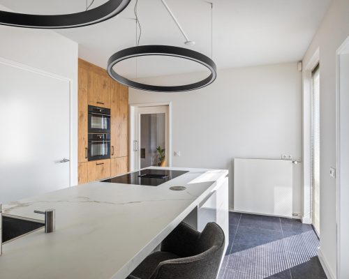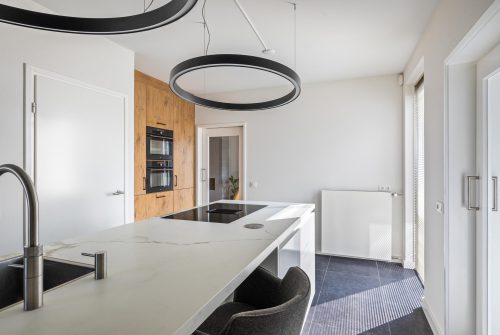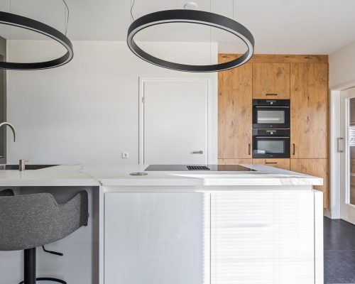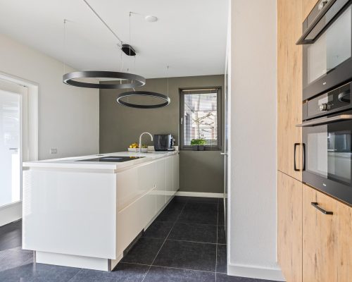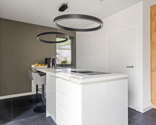Via De Woonkamer Loop Je De Naar De Keuken, Uitgevoerd In Hoogglans Wit (2021), Voorzien Van Kastenwand En Een Schiereiland Met Kook- En Spoelgedeelte.