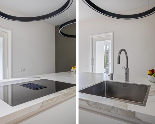 Het Eiland Is Afgewerkt Met Modern Werkblad In Marmer-design. De Voorraadkast In De Keuken Biedt Extra Opberguimte.