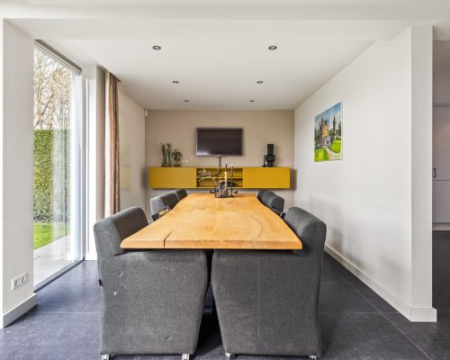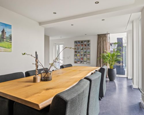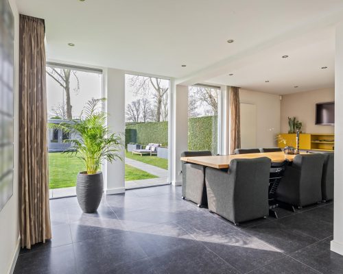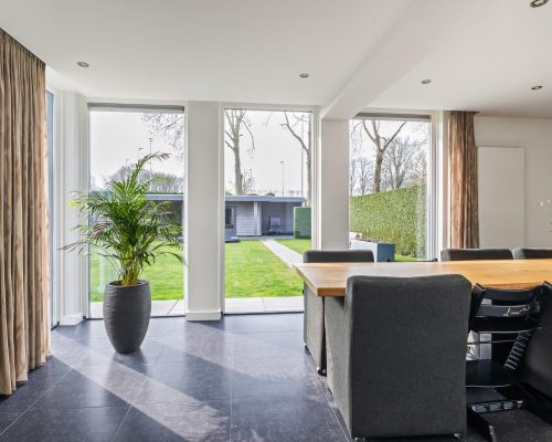 Aan De Achterzijde Van De Woning Ligt De Tuinkamer, Een Heerlijke Ruimte Om Samen Te Eten. Er Is Voldoende Plaats Voor Een Eettafel Van 8-10 Personen. De Tuinkamer Heeft Een Fijne Lichtinval Dankzij De Grote Raampartijen Over De Gehele Breedte. Het Biedt Je Een Prachtig Zicht Op De Achterliggende Tuin. De Vloer Is Afgewerkt Met De Dezelfde Tegel Als In De Keuken En Ook De Wanden Zijn Hier Netjes Glad Gestuukt.