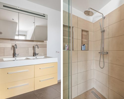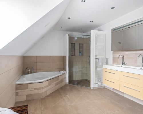– Zeer Ruime Badkamer Met Ligbad, Inloopdouche Met Dubbele Nis, Dubbele Wastafel Met Meubel, Toilet En Designradiator
