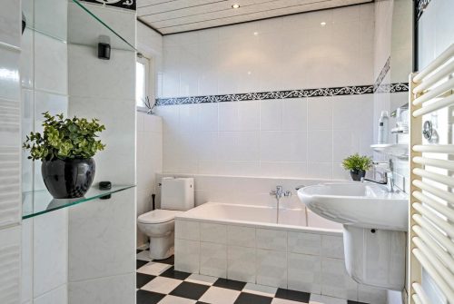 Aan de achterzijde van de woning liggen de slaapkamers en de badkamer. Deze zijn via een gang te bereiken. De grootste slaapkamer heeft een goede afmeting van circa 17m2. Met een raam op het oosten geniet je hier van de ochtendzon. Deze kamer beschikt over een TV aansluiting. De wanden zijn behangen, de plafonds zijn afgewerkt met witte schroten en op de vloer ligt tapijt. Dat geldt ook voor de tweede slaapkamer (circa 14m2). In de gang kun je met een vlizotrap naar de vliering; een grote ruimte, geschikt als bergruimte. De badkamer is ruim van opzet en compleet ingericht. Hier vind je een ligbad, wastafel, douchecabine en toilet. De badkamer wordt verwarmd door middel van vloerverwarming en een designradiator.