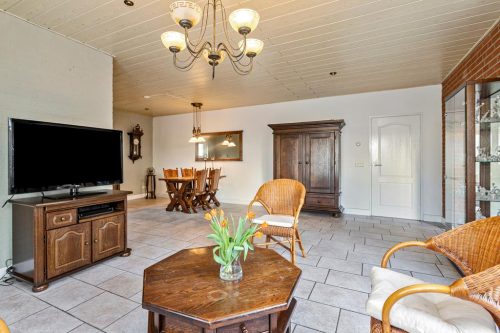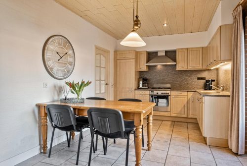 Via de hal lopen we naar de woonkamer, die grotendeels aan de voorzijde van de woning ligt. Een glas in lood raam en twee grote raampartijen aan de voorzijde en zijkant van de woning zorgen voor een fijne lichtinval. De ramen zijn voorzien van ventilatieroosters en elektrische rolluiken. De woonkamer is ruim van opzet. Er is voldoende ruimte voor een royale zit- en eethoek. In de zithoek vind je een sfeervolle openhaardopstelling met een elektrische haard. Er ligt hier een gasaansluiting dus het aansluiten van een gashaard is mogelijk. De muren zijn deels afgewerkt met fijne spachtelputz en deels zijn de stenen wanden geschilderd. De plafonds zijn voorzien van houten panelen met inbouwspots. De woonkamer beschikt over airco. Naast de woonkamer ligt de ruime woonkeuken die in een hoek is opgesteld en is uitgevoerd in lichte houtkleur met kunststof werkblad.