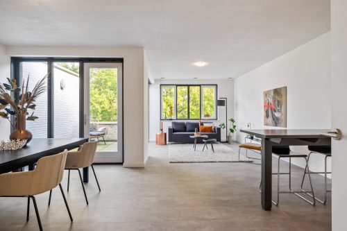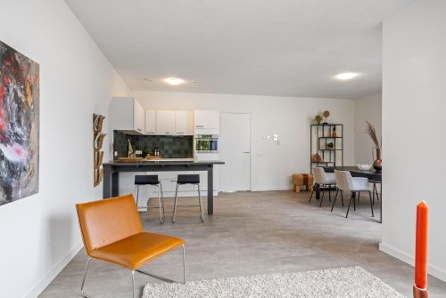De woon-eetkamer strekt zich uit over de volledige breedte van het appartement en profiteert van grote raampartijen in stijlvol zwarte uitvoering. Hierdoor geniet je van een fijne lichtinval. Dankzij de praktische indeling heb je in deze ruimte meerdere mogelijkheden om een gezellige eet- en zithoek te realiseren. De loopdeur in de pui geeft je toegang tot het balkon, die dankzij de beschutte ligging tussen twee appartementen in, volop privacy biedt. Het uitzicht vanaf de loggia is gericht op een groen speelpleintje en de omliggende straten, en door het open karakter geniet je hier optimaal van de ochtend- en avondzon.