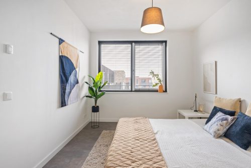 Vanuit de hal heb je toegang tot de moderne badkamer, die voorzien is van een ruime inloopdouche, een stijlvol badkamermeubel, een elektrische radiator, mechanische ventilatie en vloerverwarming. De vloer is afgewerkt met een lichtgrijze tegel, de wanden zijn geheel betegeld. De hoofdslaapkamer bevindt zich aan de achterzijde van het appartement en biedt met zijn royale afmetingen veel comfort. De tweede slaapkamer is veelzijdig te gebruiken: ideaal als logeerkamer, walk-in closet, thuiskantoor of hobbyruimte.