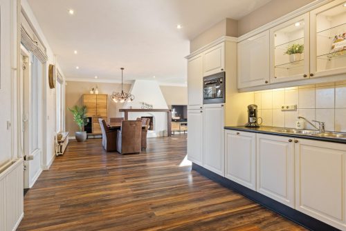 Aansluitend vind je de ruim opgezette keuken in massief eiken en in een lichte kleurstelling.