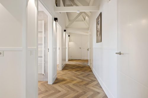 De afwerking is van hoog niveau. Over de gehele verdieping ligt een moderne vinylvloer in een eiken visgraatmotief. De wanden zijn strak gestuukt waarbij de houten kapconstructie in zicht is gebleven. Alle ruimtes beschikken over een TV aansluiting en nagenoeg alle ramen zijn voorzien van screens. Tot slot is gekozen voor een mooie kwaliteit deuren in een strak design.