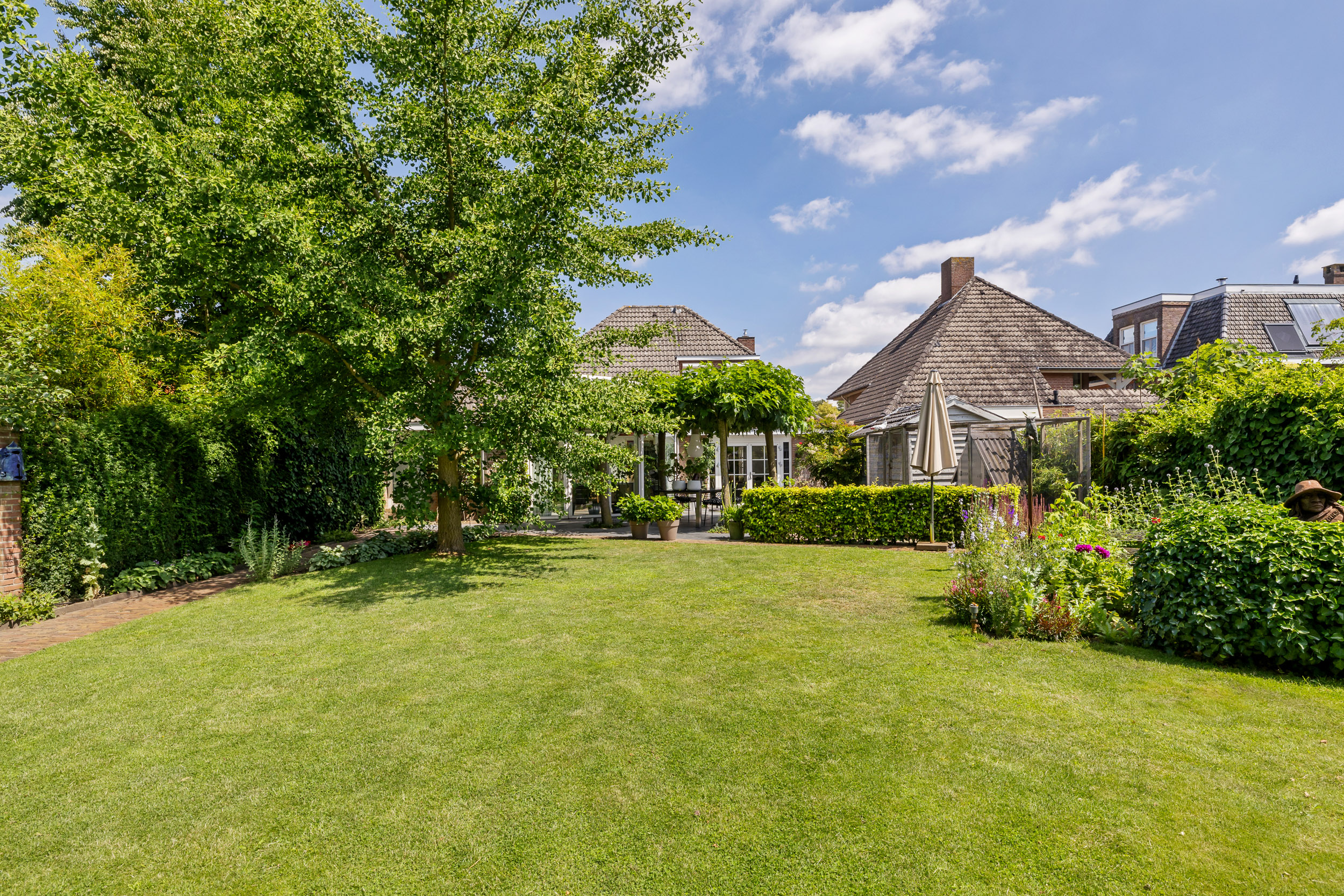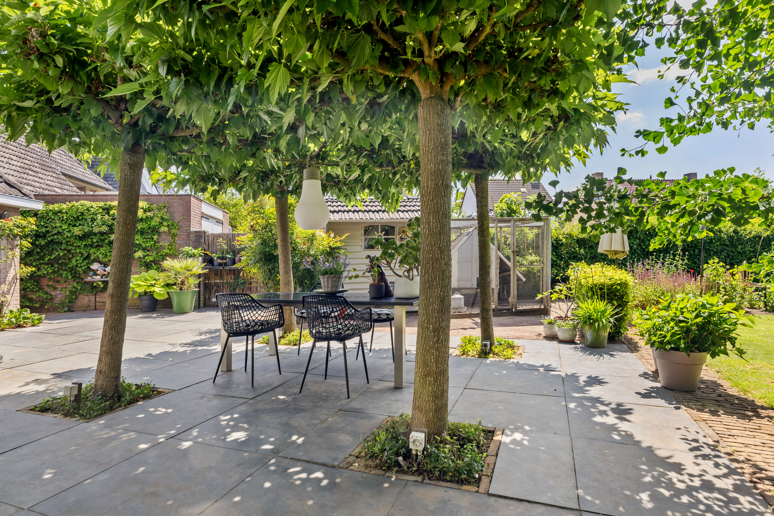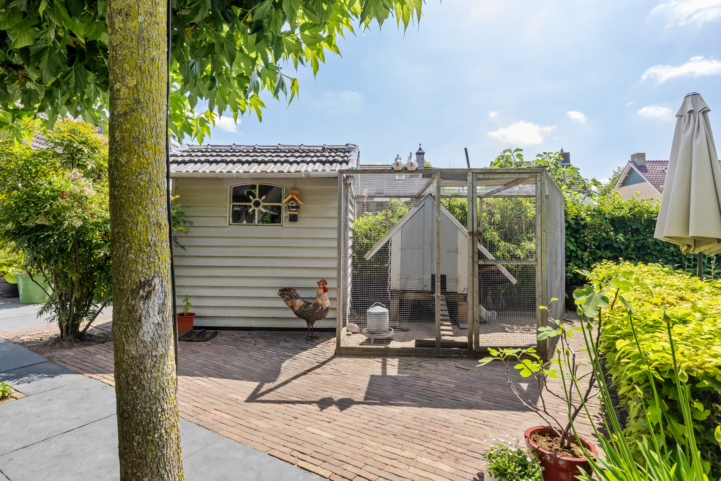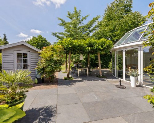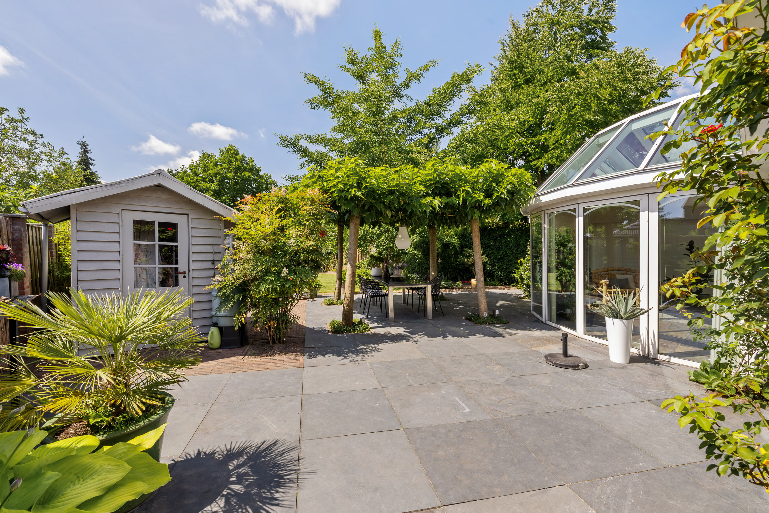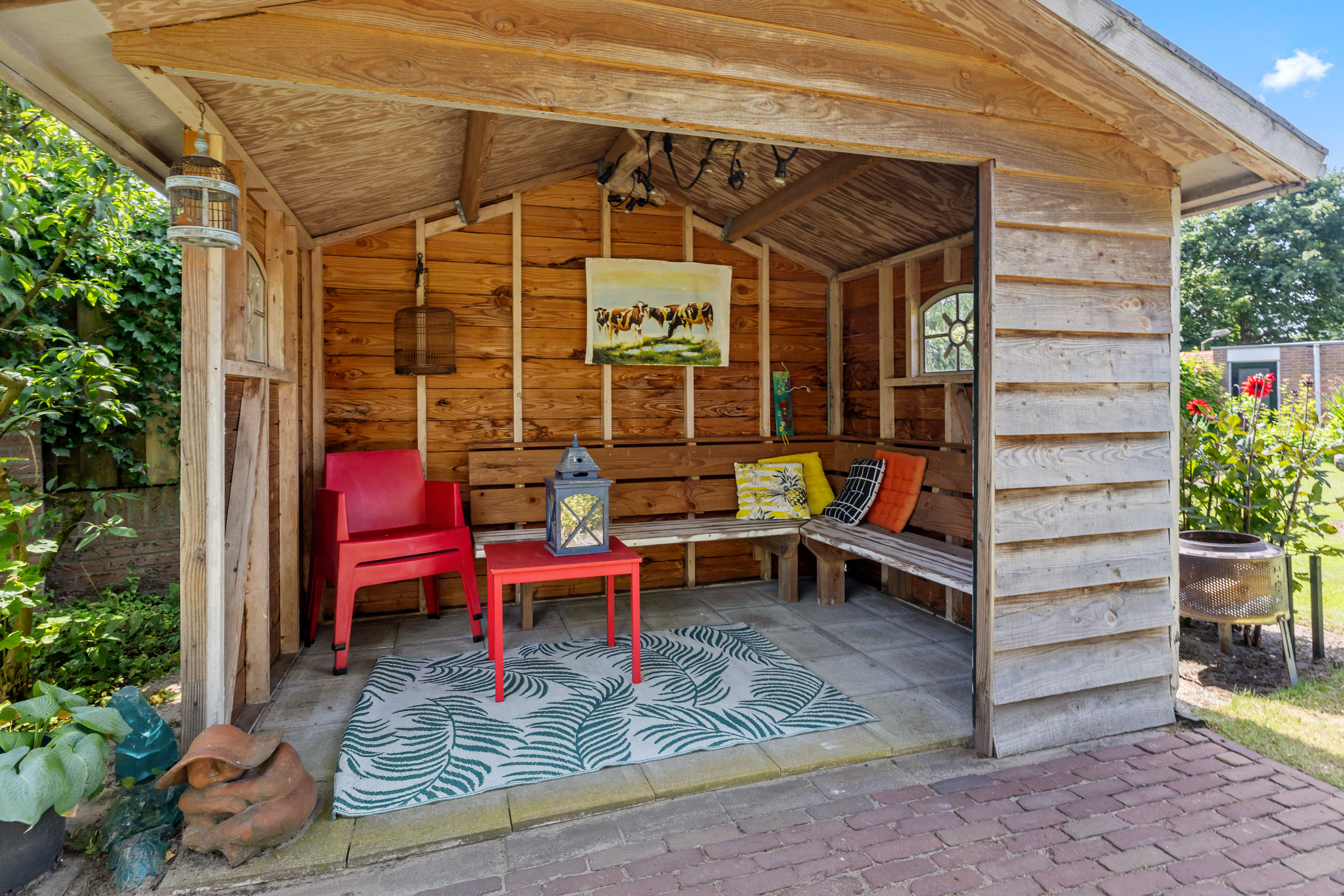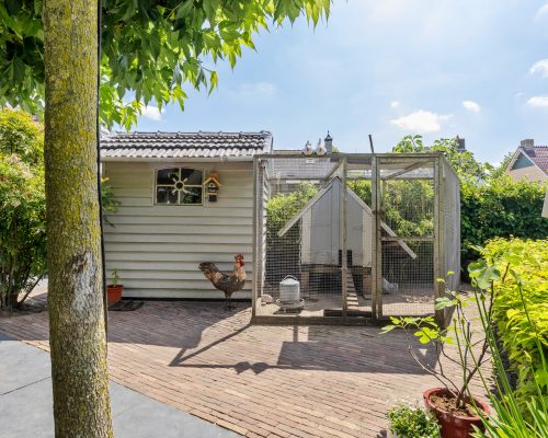 De woning ligt op een mooi perceel van 766m2, dat op het zuidwesten is georiënteerd. Je wandelt de tuin in vanuit de eetkamer/serre en ook vanuit de tuinkamer loop je naar buiten. Via de poort links van de woning kun je achterom. De tuin is netjes aangelegd en ziet er verzorgd uit. Grenzend aan de woning is een royaal terras aangelegd waar volwassen bomen heerlijke verkoeling bieden. Dankzij de volwassen beplanting en het gazon geniet je hier volop het buitenleven. Naast het terras bevindt zich een schuurtje om tuinspullen op te bergen. Aansluitend is een kippenren gebouwd. Verderop in de tuin staat een veranda, een heerlijke plek om te genieten van het buitenleven. Leuk detail zijn de authentieke gietijzeren stalraampjes, die zorgen voor een karakteristieke en landelijke uitstraling. Het gazon blijft in goede conditie mede dankzij de robotmaaier en de sproei-installatie.