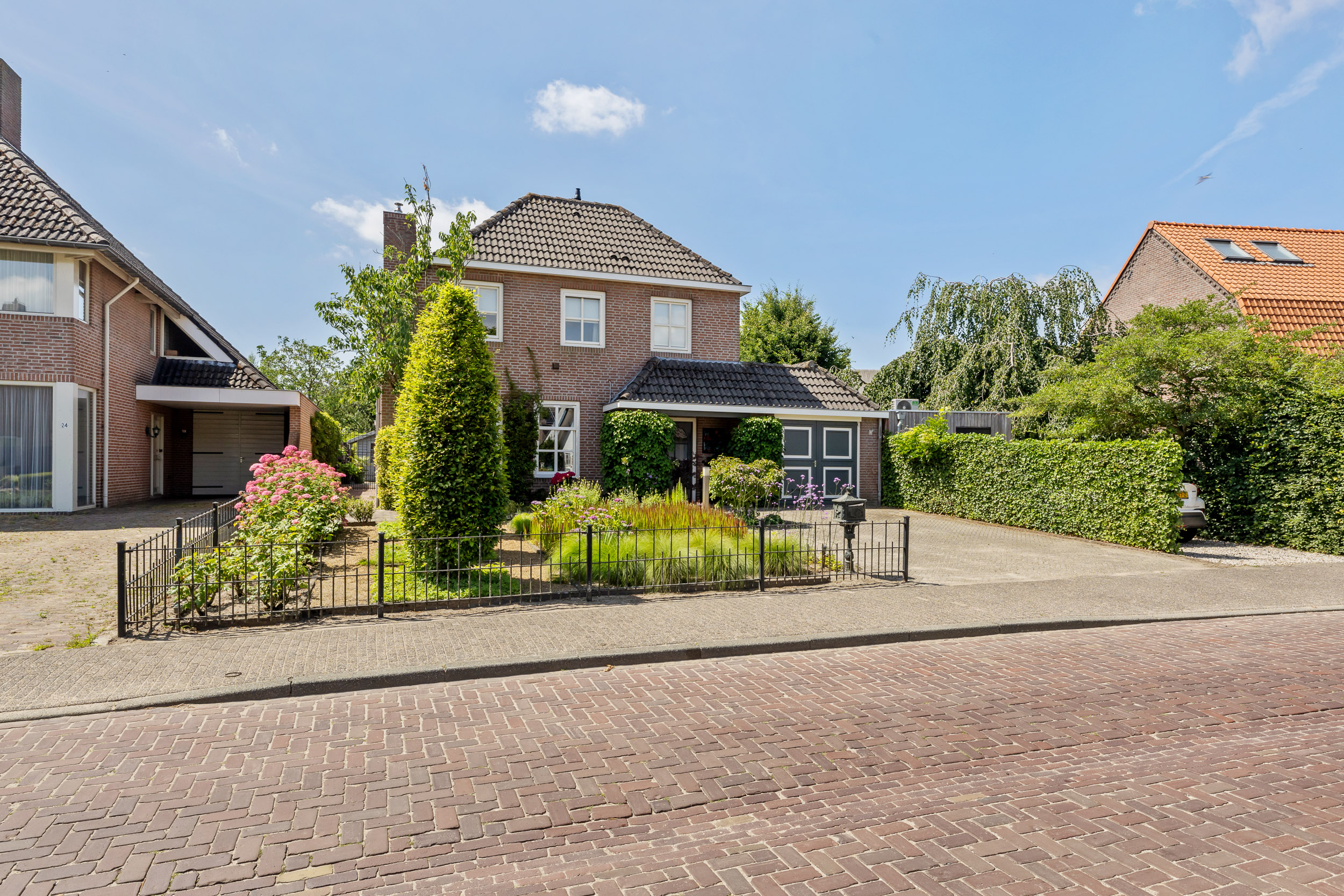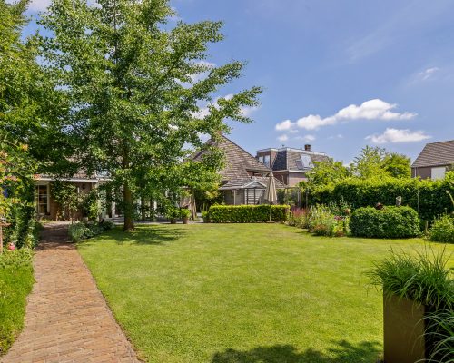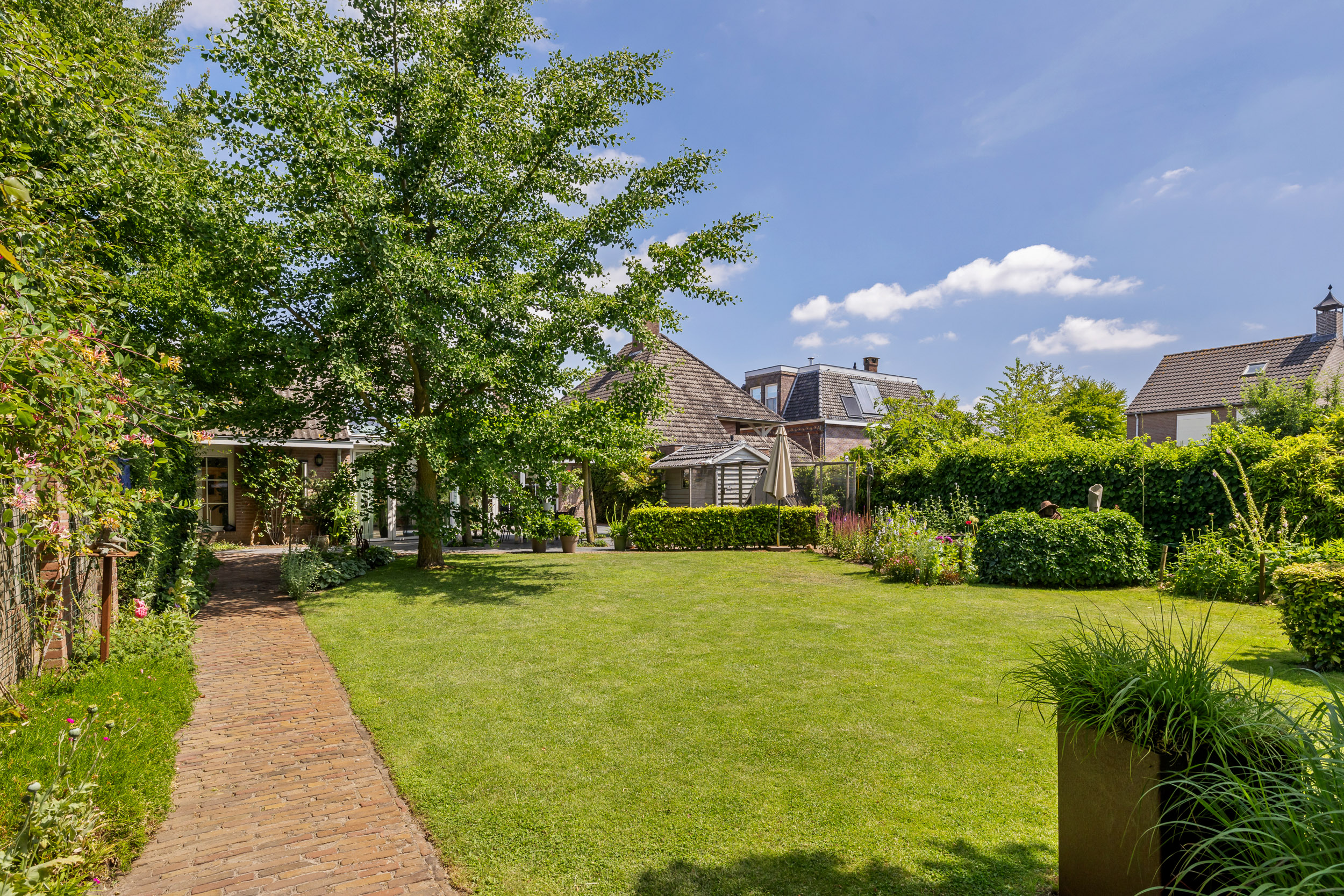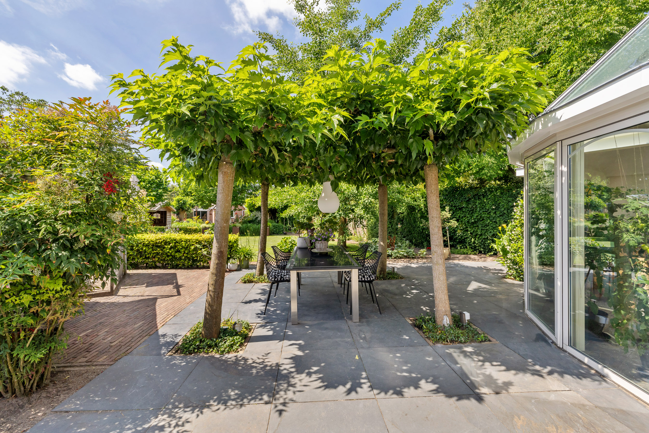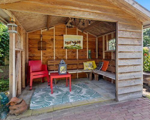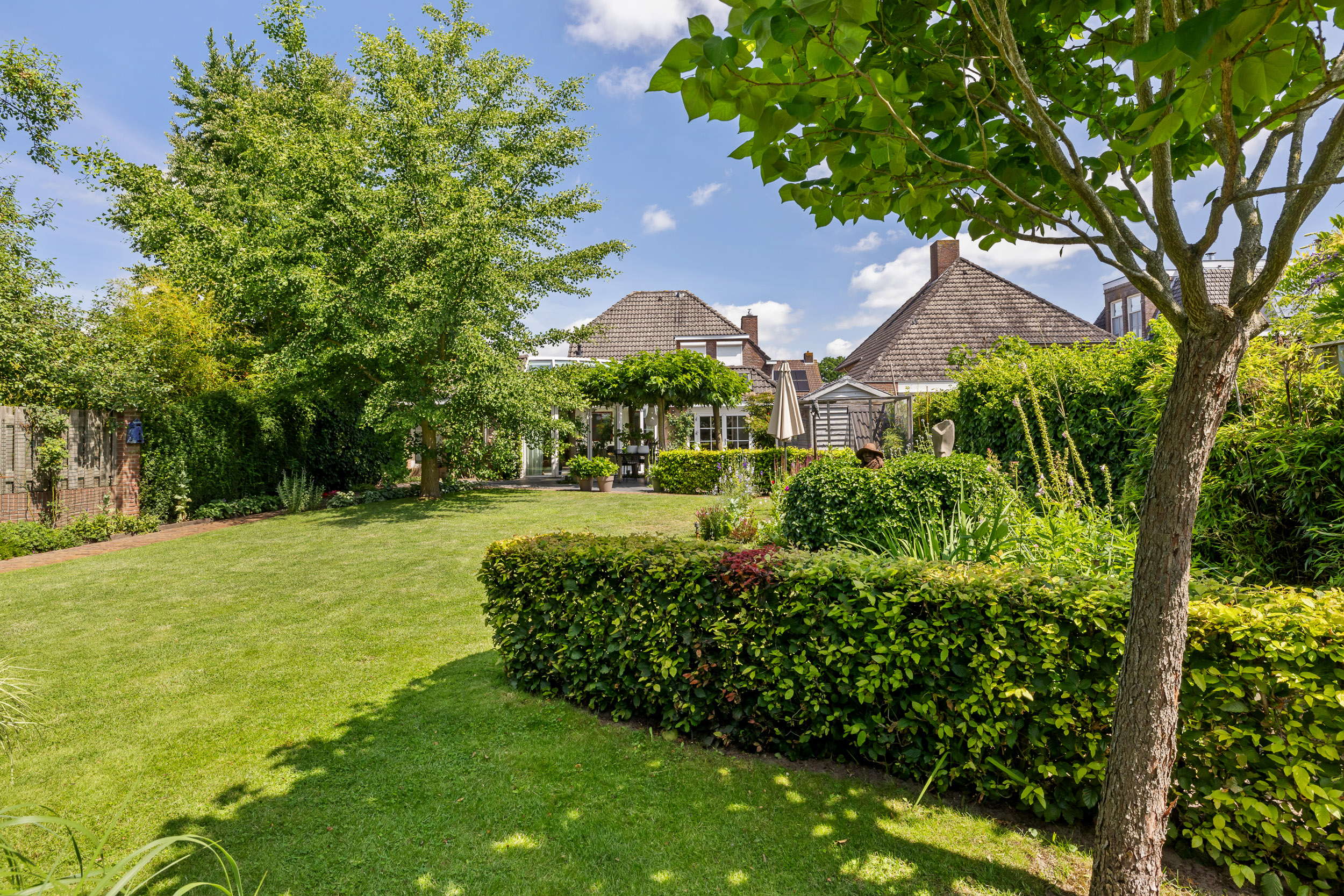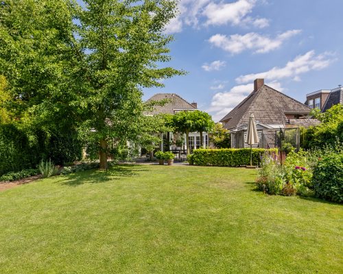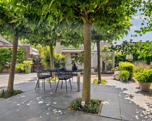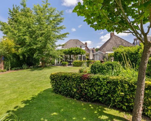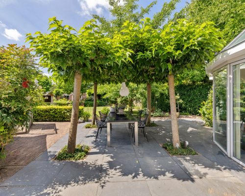 De woning ligt op een mooi perceel van 766m2, dat op het zuidwesten is georiënteerd. Je wandelt de tuin in vanuit de eetkamer/serre en ook vanuit de tuinkamer loop je naar buiten. Via de poort links van de woning kun je achterom. De tuin is netjes aangelegd en ziet er verzorgd uit. Grenzend aan de woning is een royaal terras aangelegd waar volwassen bomen heerlijke verkoeling bieden. Dankzij de volwassen beplanting en het gazon geniet je hier volop het buitenleven. Naast het terras bevindt zich een schuurtje om tuinspullen op te bergen. Aansluitend is een kippenren gebouwd. Verderop in de tuin staat een veranda, een heerlijke plek om te genieten van het buitenleven. Leuk detail zijn de authentieke gietijzeren stalraampjes, die zorgen voor een karakteristieke en landelijke uitstraling. Het gazon blijft in goede conditie mede dankzij de robotmaaier en de sproei-installatie.