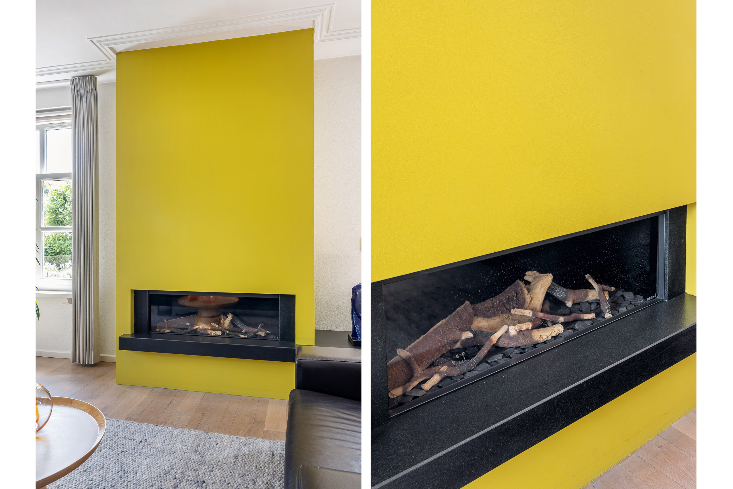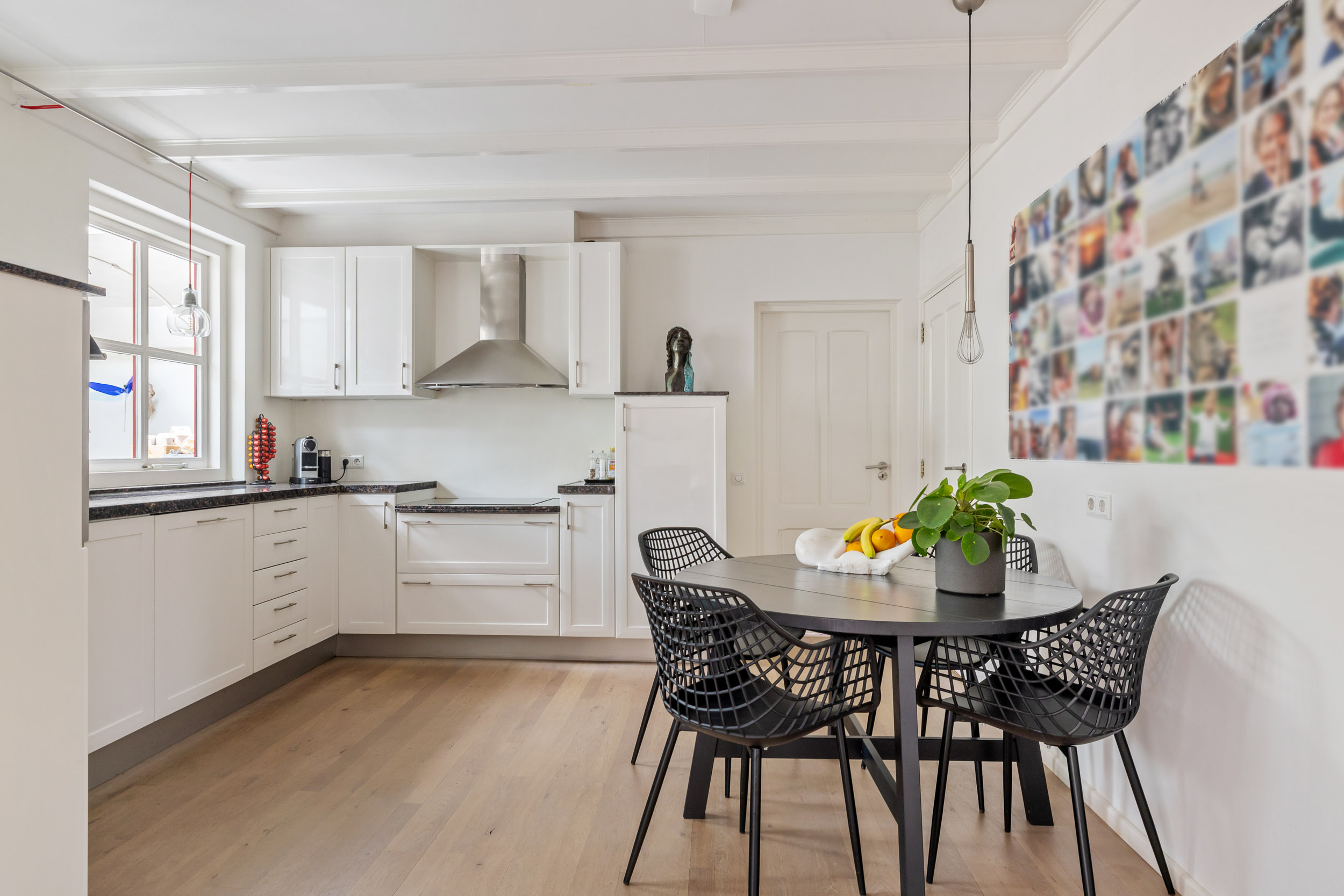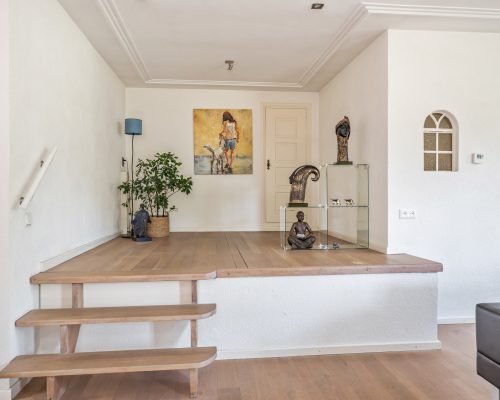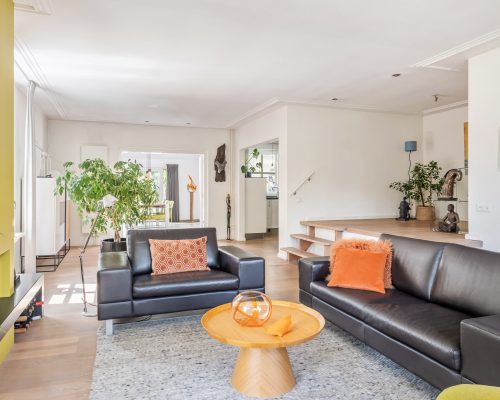 We komen de woning binnen in de ruime hal waar zich het toilet, de trapopgang en de meterkast bevinden. Via de hal lopen we de gezellige woonkamer in. De moderne zithoek met de sfeervolle gashaard nodigen je uit om gezellig plaats te nemen. Heel prettig is het licht in de woonkamer dat van meerdere zijden binnenvalt en de massief eiken vloer is sfeer verhogend. Via een trapje loop je naar het ‘plateau”, een heerlijke plek voor een avondje met een goed boek, uiteraard zijn meerdere functies hier denkbaar. Praktisch is de inbouwkast op het ‘plateau’. Vanuit de woonkamer gaan we naar de halfopen keuken, die in een hoekopstelling onder het raam is geplaatst. De keuken is uitgevoerd in een lichte kleurstelling en afgewerkt met een donkergekleurd granieten werkblad.