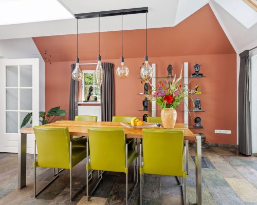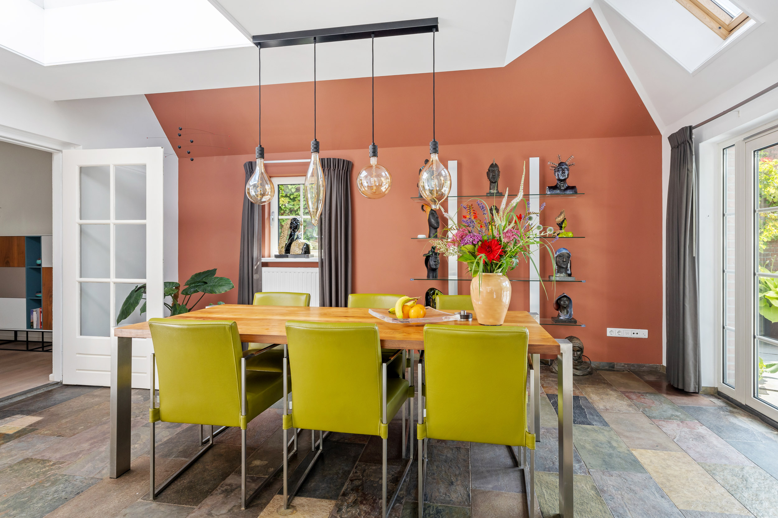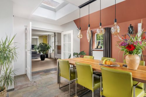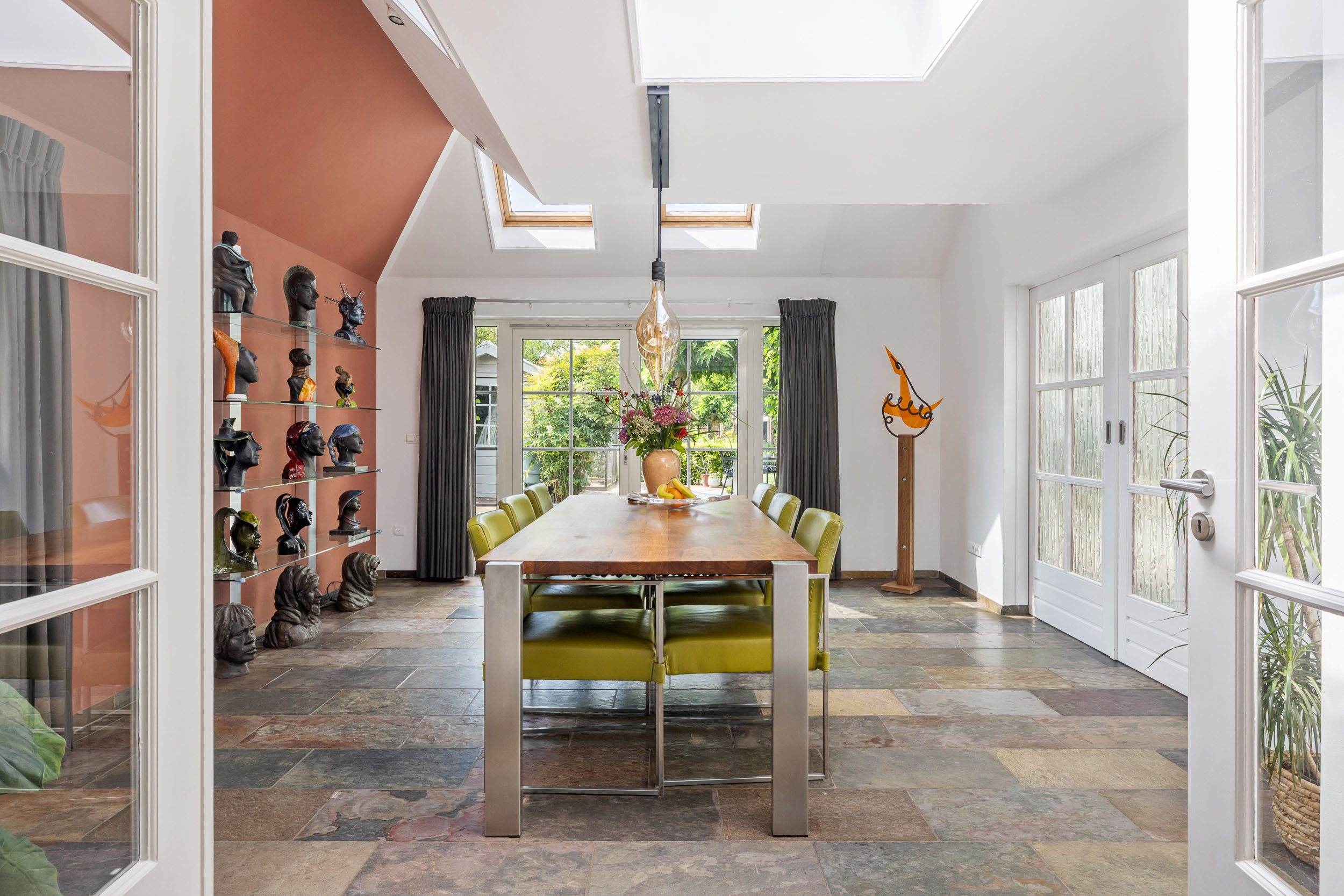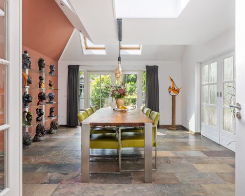 Via de openslaande deuren in de woonkamer loop je naar de eetkamer/serre. Dit is de ideale plek voor gezellige etentjes met gezin, familie en vrienden: een eettafel voor 8 tot 10 personen past hier moeiteloos. Het vele daglicht maakt deze ruimte extra bijzonder. Dankzij de lichtkoepel en de dakramen in het bijzonder vormgegeven plafond, de openslaande tuindeuren én het zijraam geniet je hier de hele dag van een fijne, zonnige sfeer.