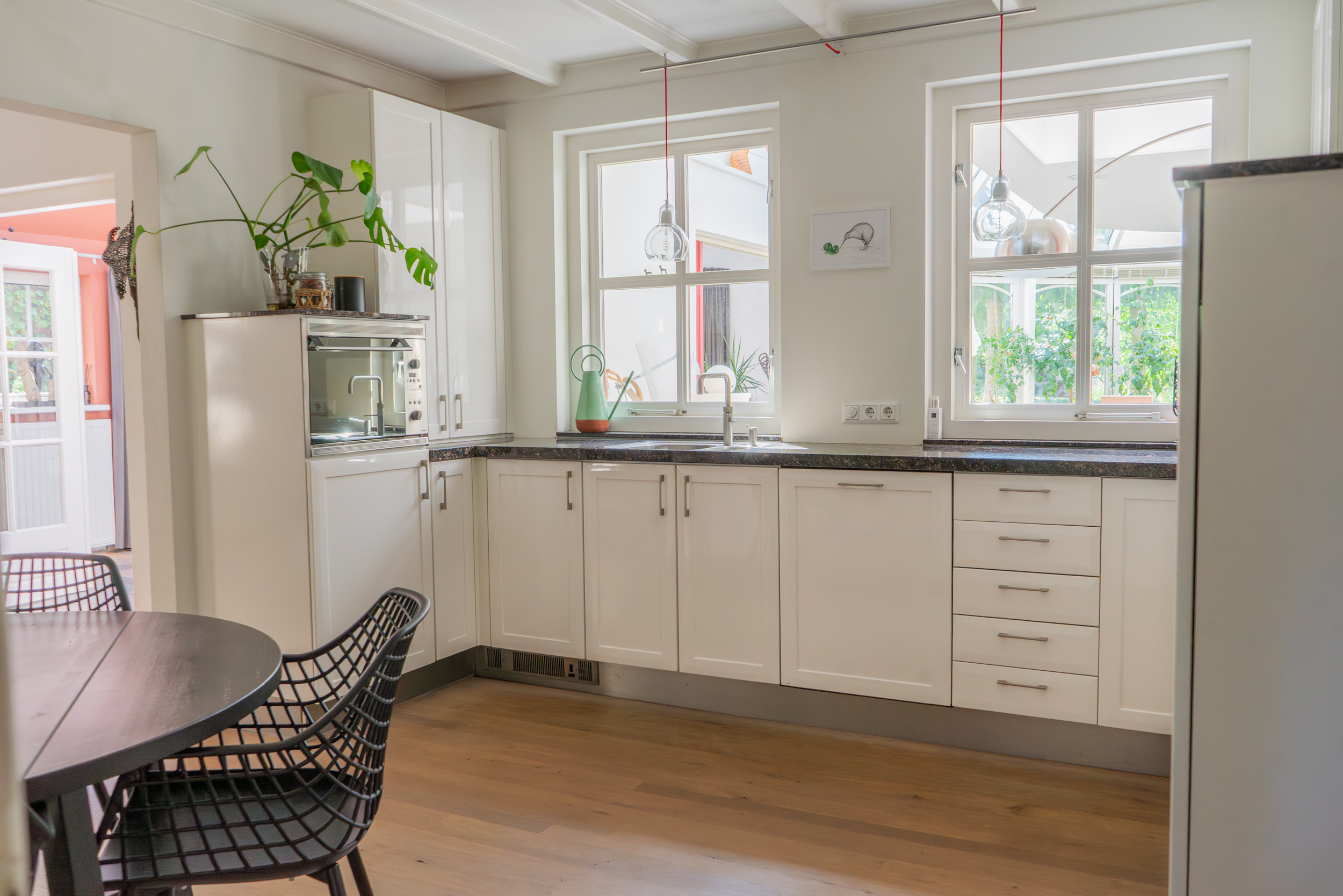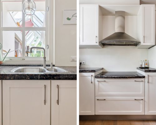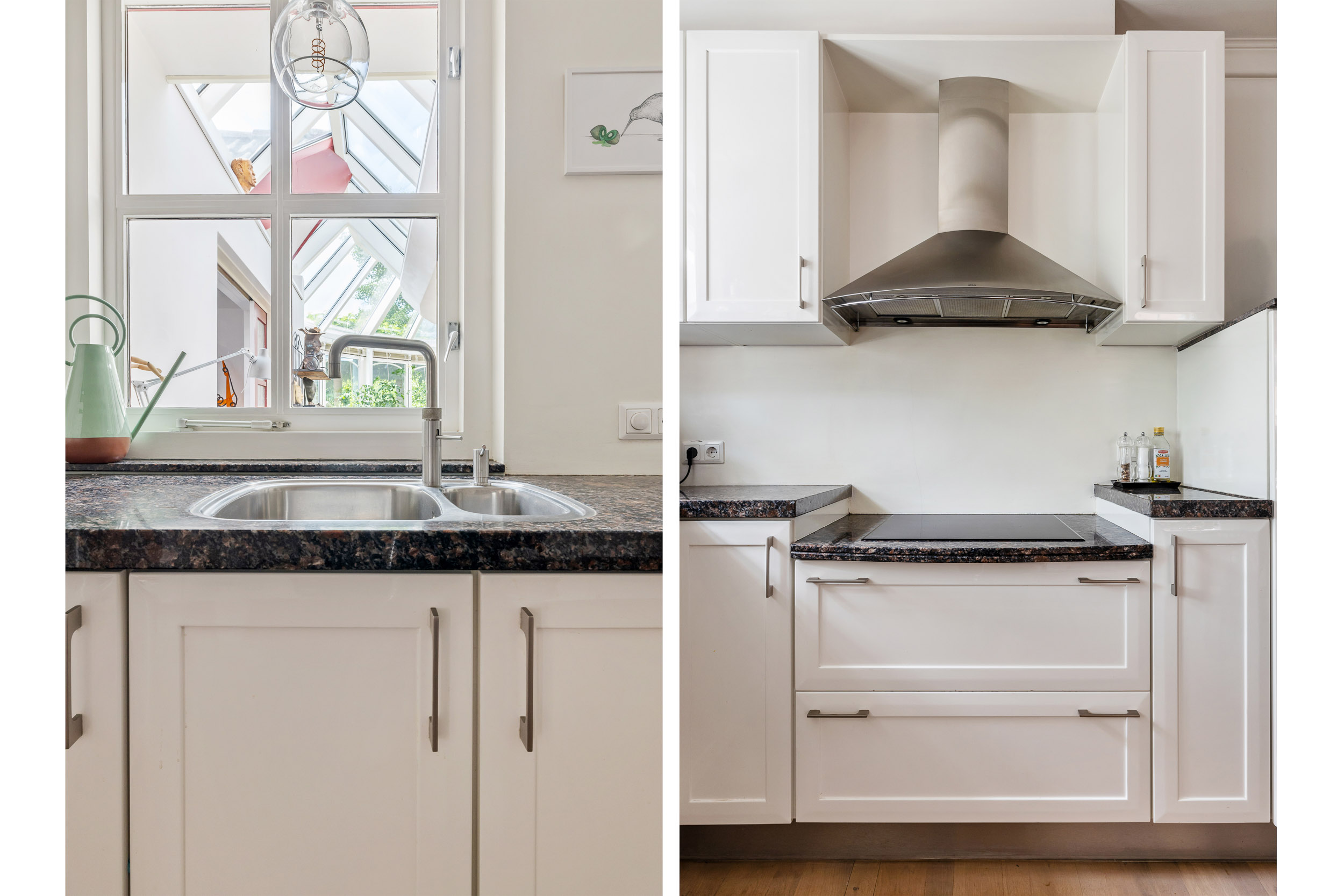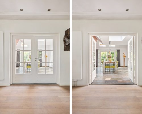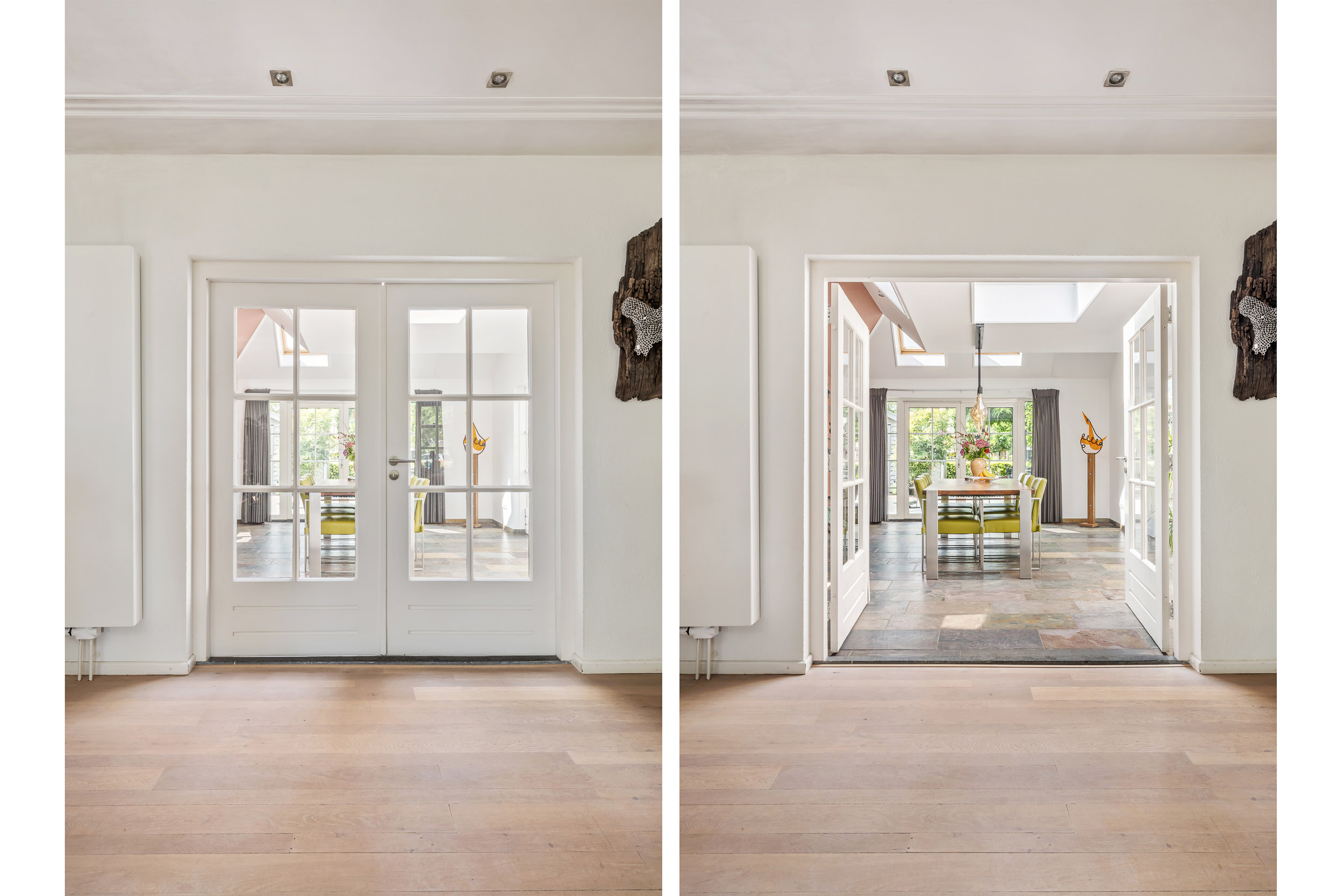 Via de openslaande deuren in de woonkamer loop je naar de eetkamer/serre. Dit is de ideale plek voor gezellige etentjes met gezin, familie en vrienden: een eettafel voor 8 tot 10 personen past hier moeiteloos. Het vele daglicht maakt deze ruimte extra bijzonder. Dankzij de lichtkoepel en de dakramen in het bijzonder vormgegeven plafond, de openslaande tuindeuren én het zijraam geniet je hier de hele dag van een fijne, zonnige sfeer.