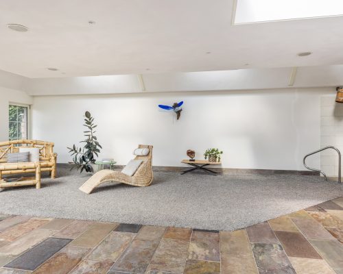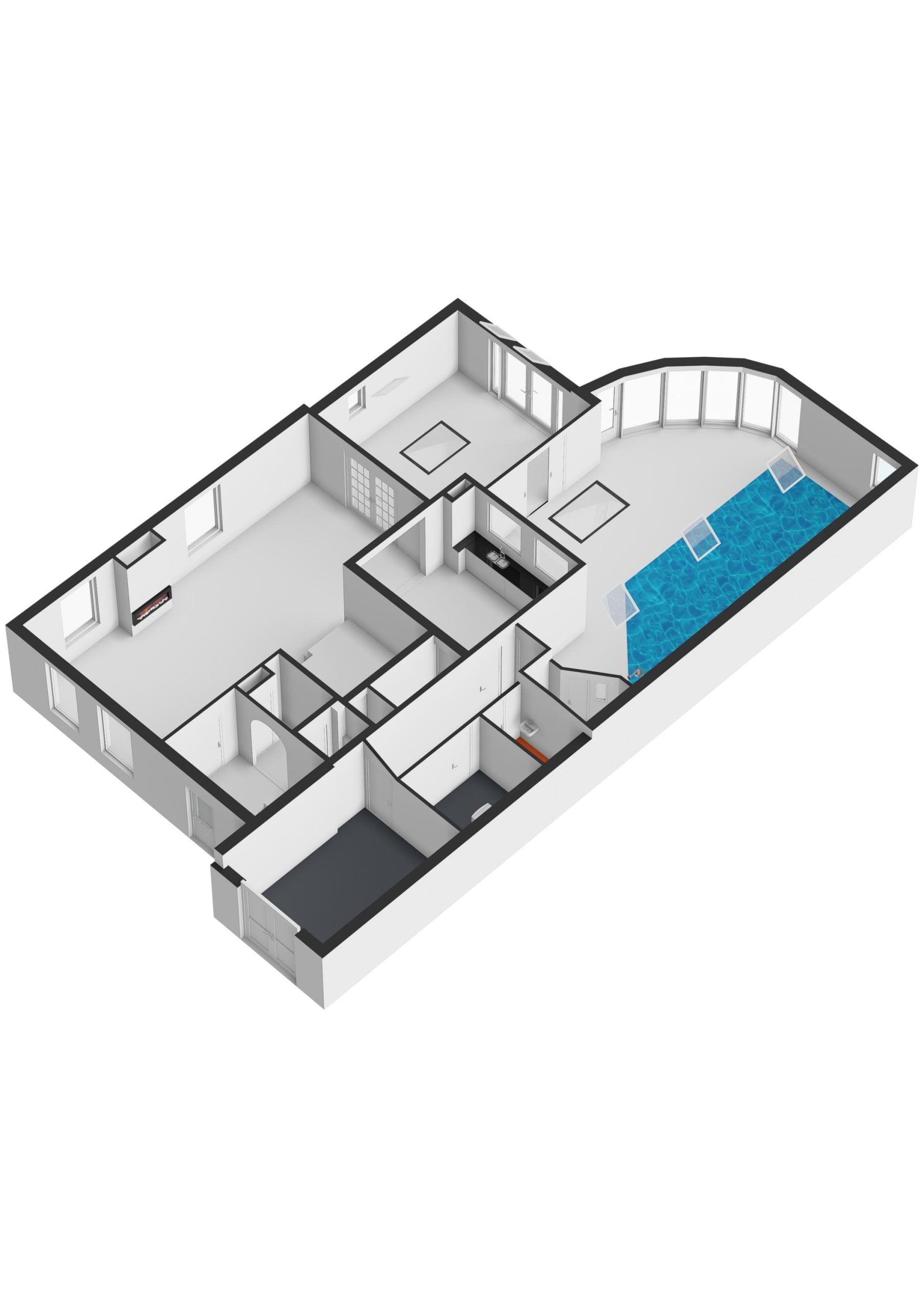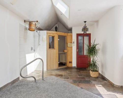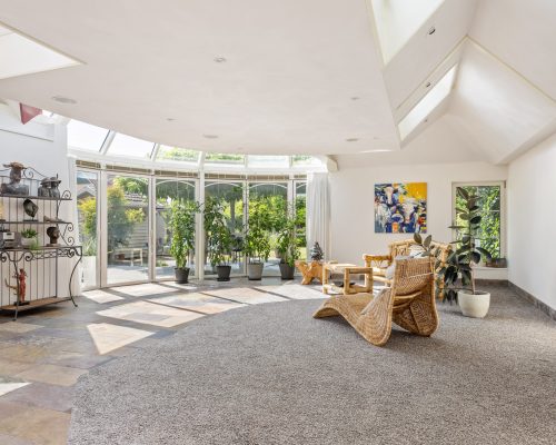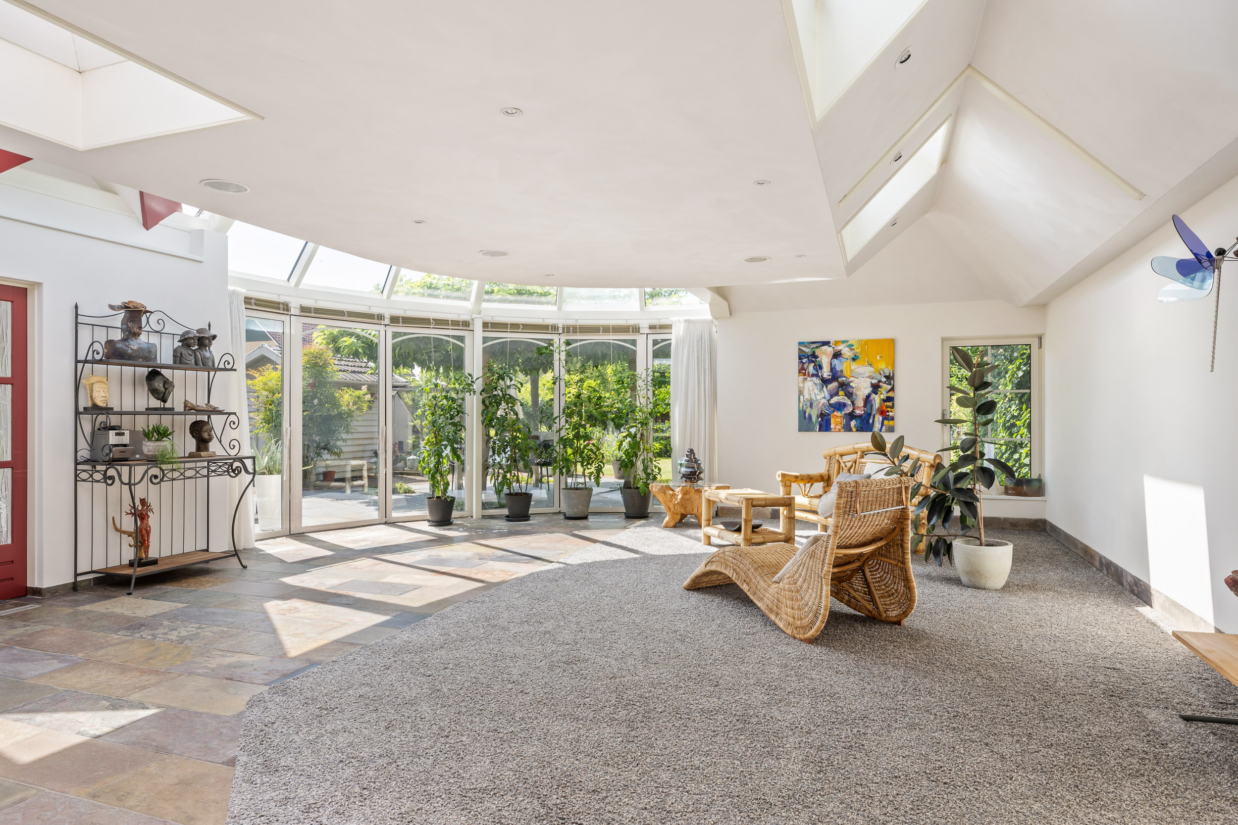 Vanuit de eetkamer/serre leiden openslaande deuren naar de indrukwekkende tuinkamer. De ronde contouren en bijzondere vormgeving geven deze ruimte een unieke uitstraling. Dankzij de ligging op het zuidwesten, de glazen pui naar de tuin en de lichtkoepels geniet je ook hier altijd van veel natuurlijk licht. Deze ruimte deed oorspronkelijk dienst als wellnessruimte, compleet met zwembad (Zwedak), sauna en (stort)douche. Het zwembad is niet meer in gebruik, maar nog wel aanwezig. Wie het zwembad wil herstellen, dient rekening te houden met renovatiewerkzaamheden.
