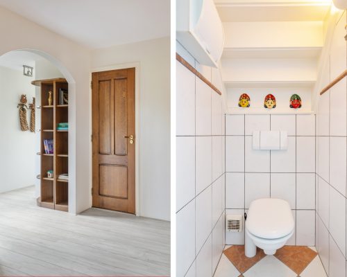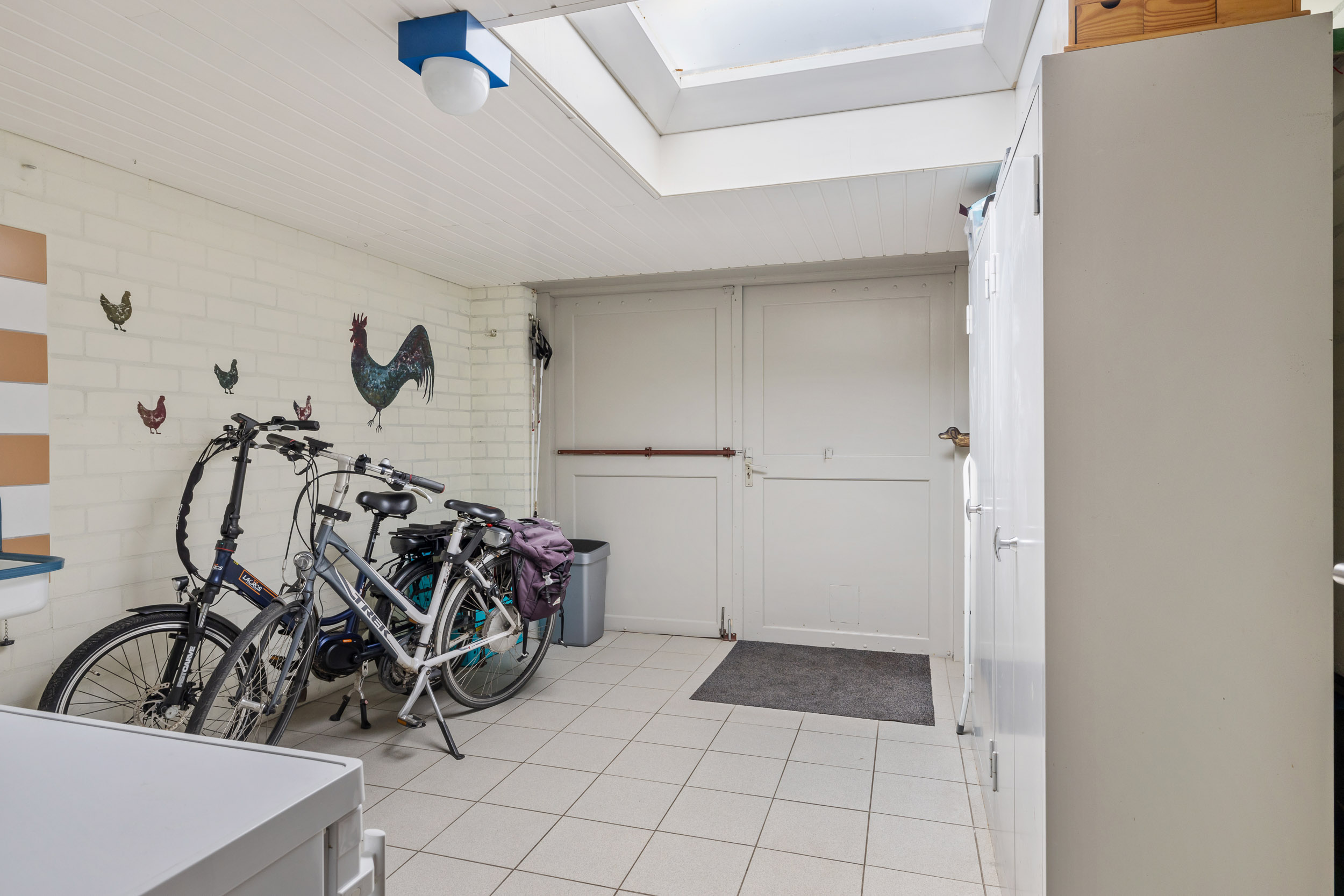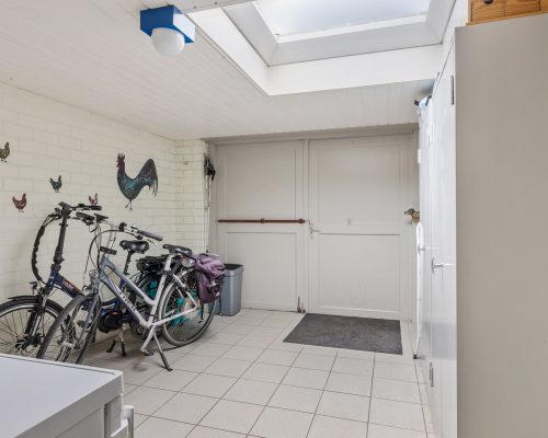 Vanuit deze ruimte bereik je de hal van waaruit je toegang hebt tot het toilet/kleedruimte, de technische installatieruimte/berging (met zwembadinstallaties, de opstelplaats voor de HR ketel (Nefit Ecomline) en een 2e meterkast), de keuken en de voormalige garage. De garage ligt aan de voorzijde van de woning en is voorzien van openslaande garagedeuren, een tegelvloer, elektra en een uitstortgootsteen. Sinds de verbouwing in 1998 functioneert de garage als berging waar o.a. het witgoed staat opgesteld.