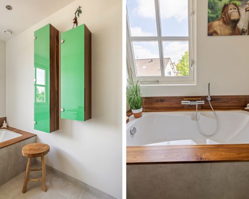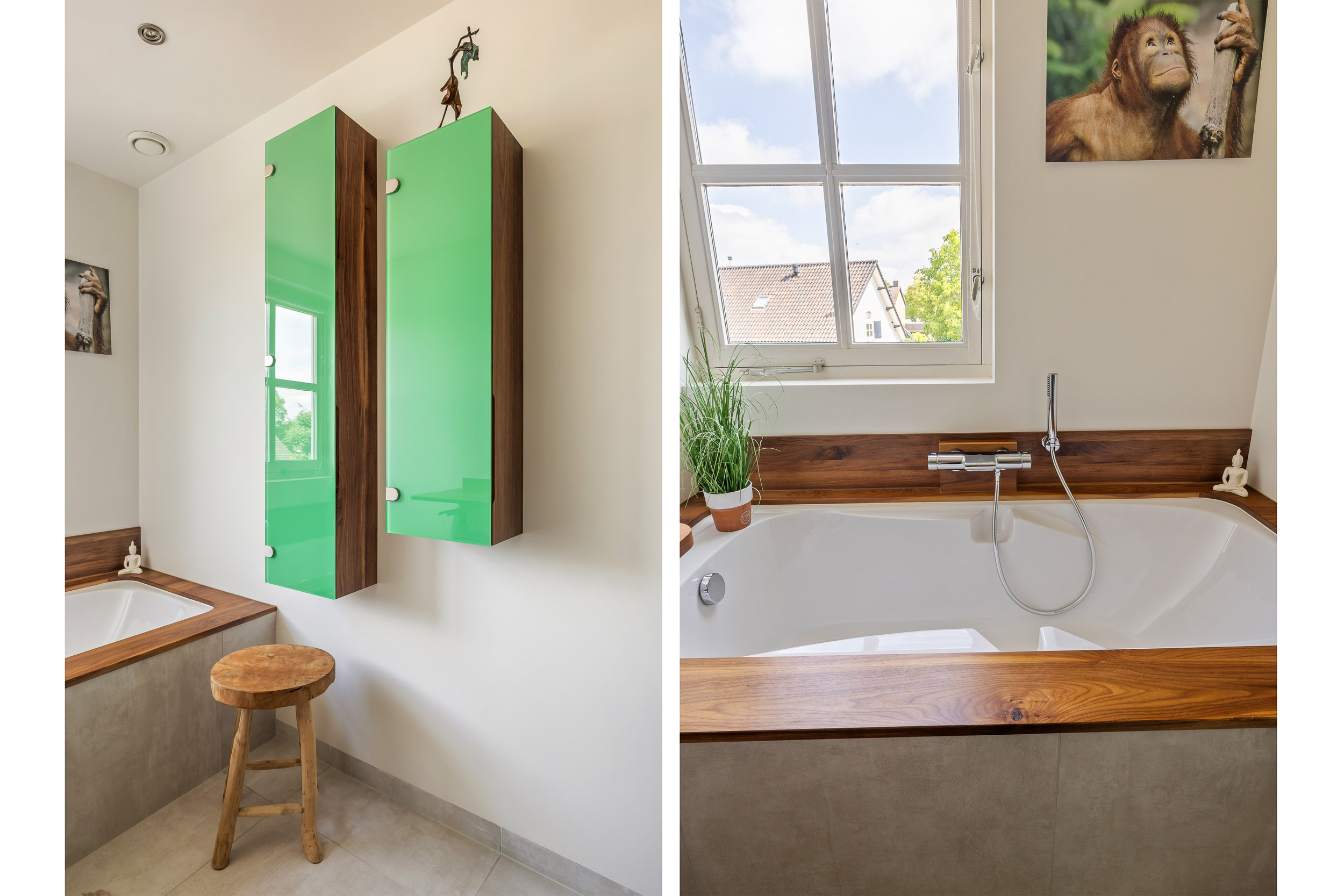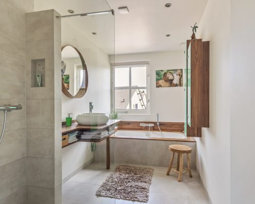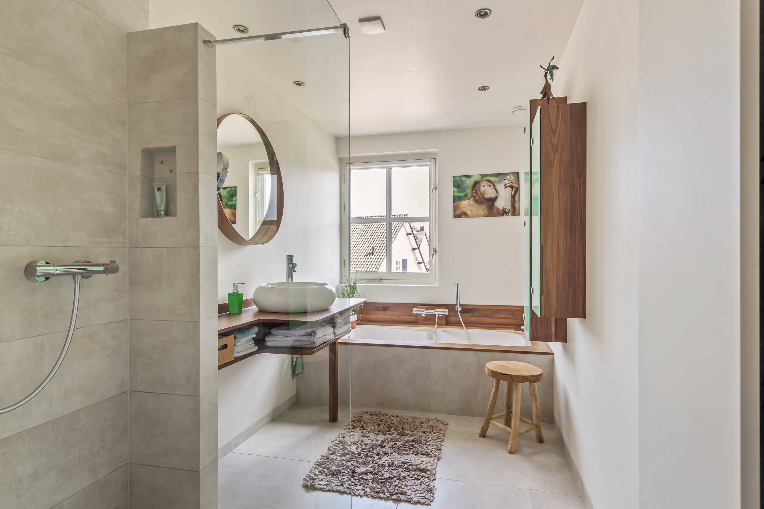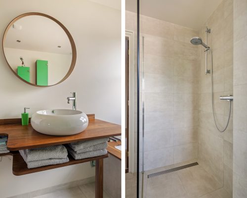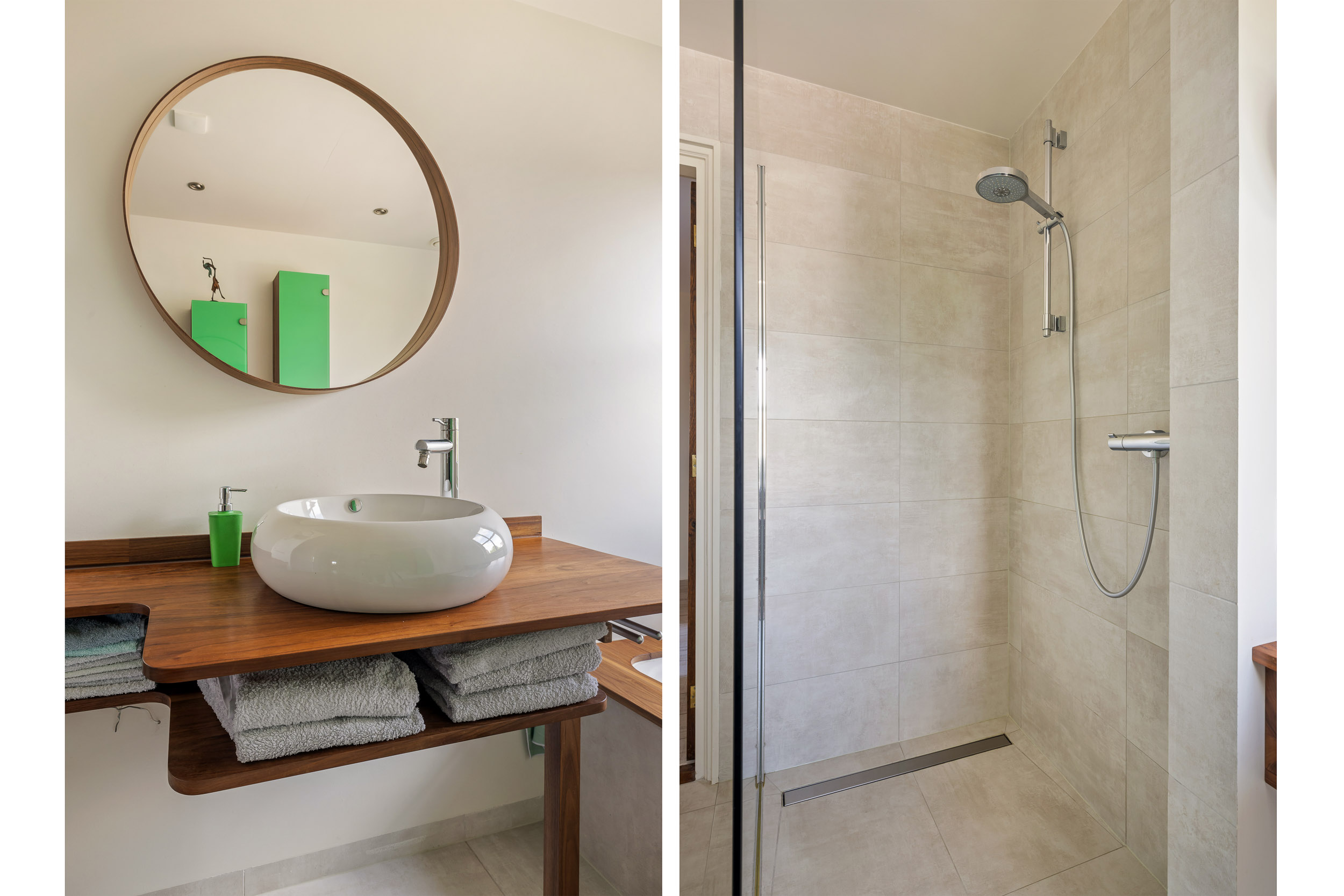 De badkamer is 4 jaar geleden vernieuwd. Resultaat is een moderne ruimte waar je helemaal tot rust komt, compleet ingericht met een ligbad, wastafel met meubel en inloopdouche. De houtaccenten in het ontwerp geven de badkamer veel sfeer en een bepaalde mate van exclusiviteit. De wanden van de inloopdouche zijn betegeld, de overige wanden zijn strak gestuukt. De badkamer beschikt over vloerverwarming.