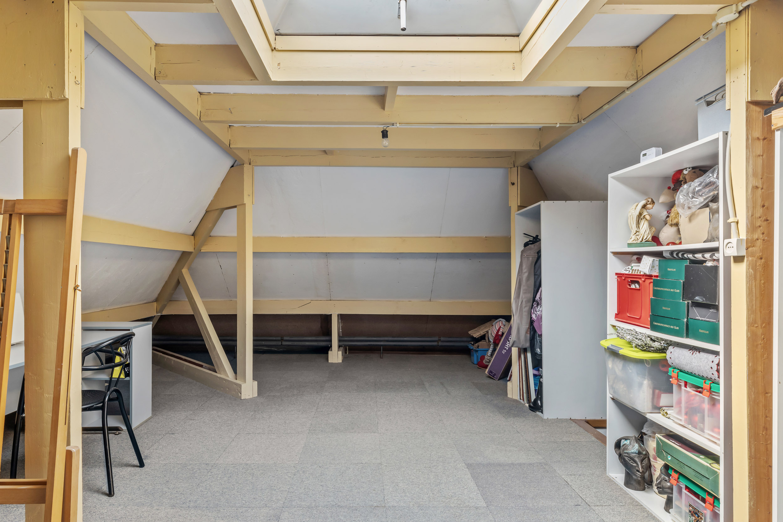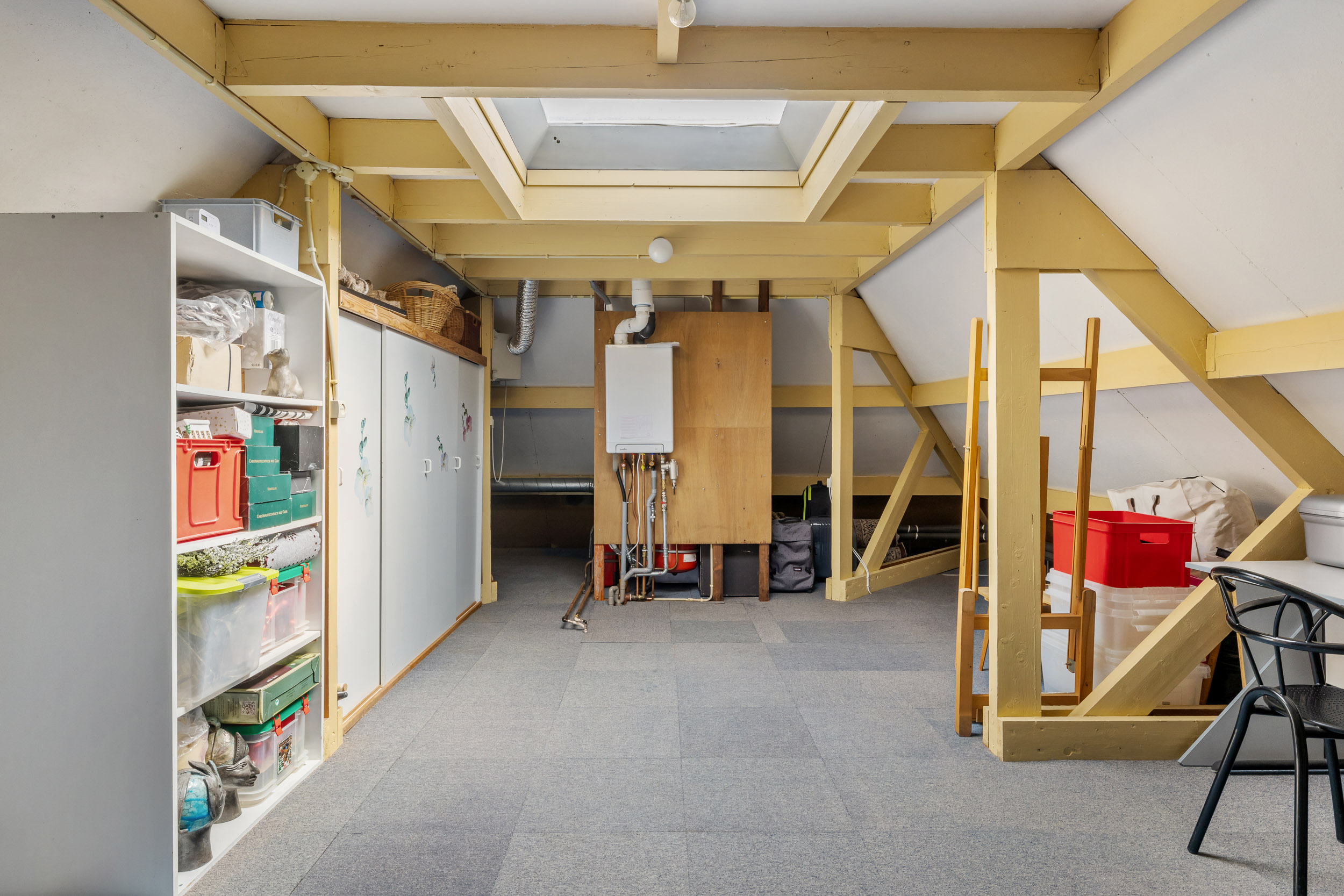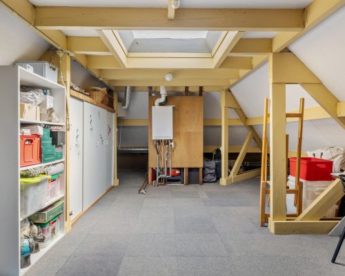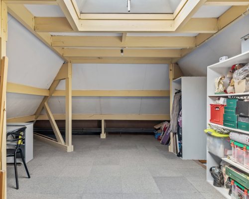 Via de vaste trap ga je naar de zolder. Dit is de opstelplaats voor een 2e CV ketel (Intergas) en daarnaast is deze verdieping in gebruik als bergzolder. Er is volop ruimte om hier een extra kamer, kantoor of speel/chillruimte voor de kinderen te realiseren. Ook hier valt daglicht binnen door de lichtkoepel in het dak. Op de vloer ligt een tapijttegel.
