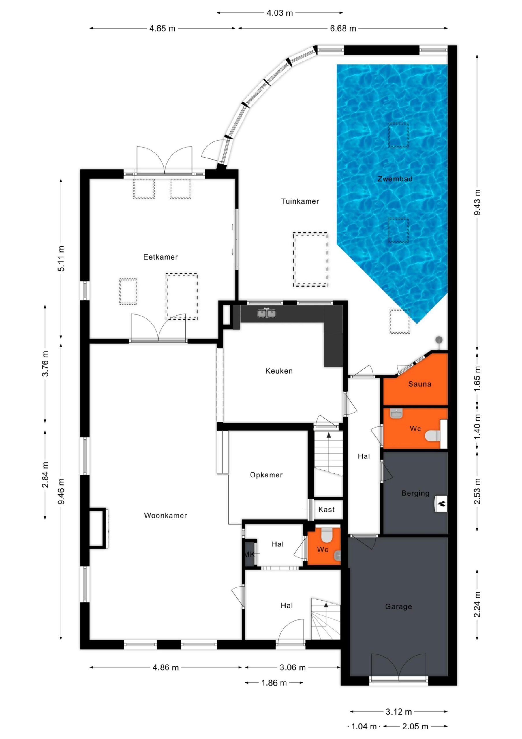 – Eetkamer/serre, tuinkamer met inpandig zwembad en sauna volop mogelijkheden om naar eigen wens in te richten