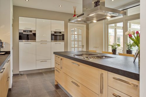 Vanuit de hal lopen we de keuken in, die uitkijkt op de serre en de tuin. De keuken is slim ingedeeld en kent een driedelige opstelling; een kookeiland met barkrukken, kastenwand en aanrecht met klepkastjes. Hier geniet je van de perfecte mix tussen comfort en functionaliteit. Dit uit zich in de slimme opbergmogelijkheden, de hoogwaardige apparatuur en het massief hardstenen aanrechtblad.