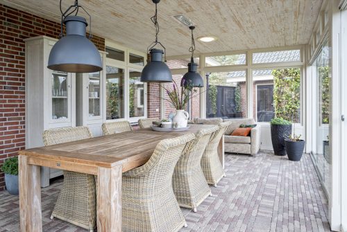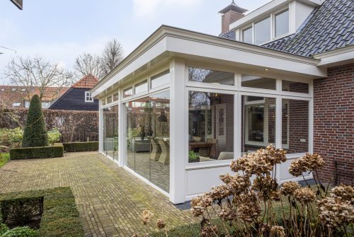 De keuken heeft een open verbinding met de woonkamer, een sfeervolle ruimte met zithoek en eettafel. Dankzij de airco is het hier altijd aangenaam. Aan de achterzijde van de woonkamer kun je via de tuindeuren naar de serre. Dit is zowel een prettige als functionele plek, waar de bewoners vooral in de zomer vele uurtjes doorbrengen. Dankzij de heaters in het plafond is het hier ook op koelere avonden goed vertoeven.