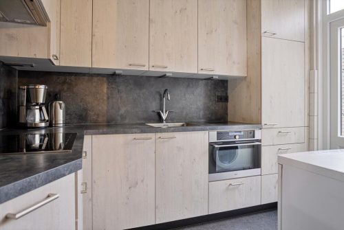 We gaan de woning via de achterdeur binnen. Hier bevindt zich de keuken, die in 2016 is vernieuwd. De hoekopstelling is in een lichte kleurstelling uitgevoerd en voorzien van een kunststof aanrechtblad. De keuken is uitgerust met een combi oven/magnetron, afzuigkap, 4 pits inductiekookplaat, allen van het merk Pelgrim, en een koelkast. In de keuken staat ook de wasmachine en een diepvries opgesteld. De vloer is afgewerkt met een donkergekleurde PVC.