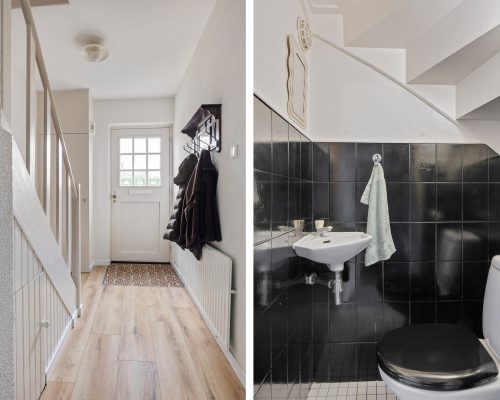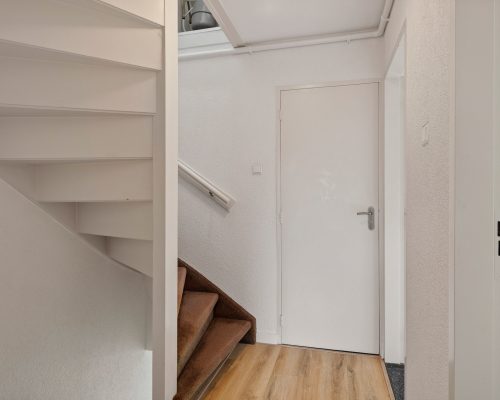 Je komt binnen in een nette en ruime hal met toilet, meterkast, trapkast en de trap naar de eerste verdieping.