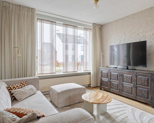 Via de hal bereik je de woonkamer: een sfeervolle en lichte ruimte waar je je meteen thuis voelt. De woonkamer is netjes afgewerkt met een laminaatvloer in eikendesign, gestuukte wanden en een plafond met sierlijst.