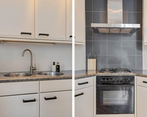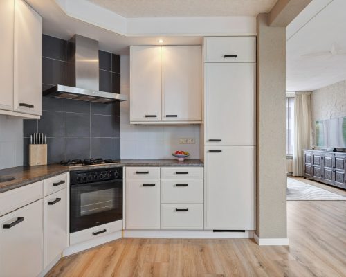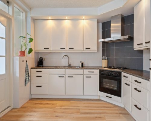 Aan de achterzijde van de woning bevindt zich de open keuken, geplaatst in een praktische hoekopstelling. De keuken is voorzien van: