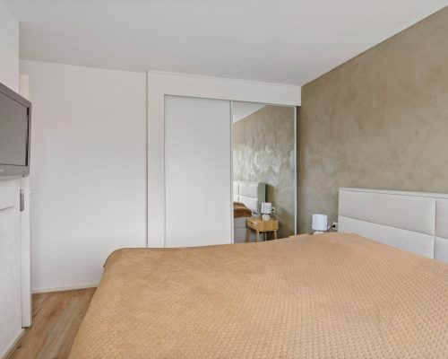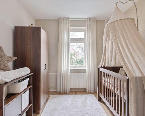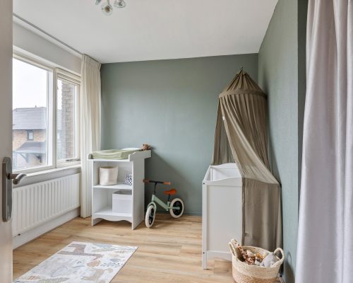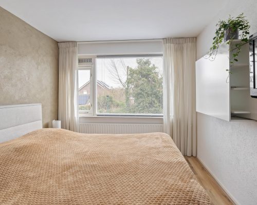 De overloop geeft toegang tot de badkamer en drie slaapkamers. De ouderslaapkamer ligt aan de achterzijde van de woning en is ruim van opzet. De ingebouwde kledingkast met schuifdeuren zorgt voor extra comfort. Dankzij het grote raam is dit een fijne, lichte kamer.