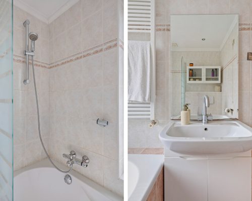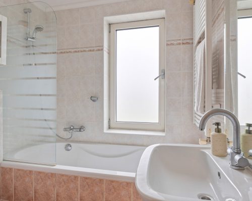 De tweede grootste slaapkamer bevindt zich aan de voorzijde van de woning en beschikt eveneens over een royale ingebouwde kast. De derde slaapkamer is ideaal als kinder-, werk- of logeerkamer. Alle slaapkamers zijn afgewerkt met een laminaatvloer en gestuukte wanden.