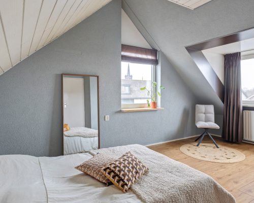 De kamer op deze verdieping biedt veel mogelijkheden, zoals een extra slaapkamer, kantoor of hobbyruimte. Dankzij het zijraam en de dakkapel aan de achterzijde is het een fijne lichte ruimte. De afwerking is netjes, met een laminaatvloer en gestuukte wanden.