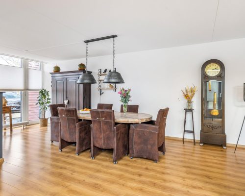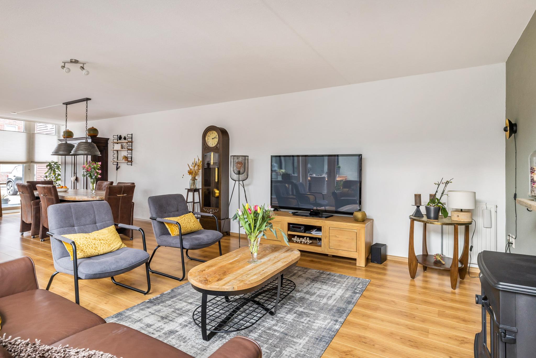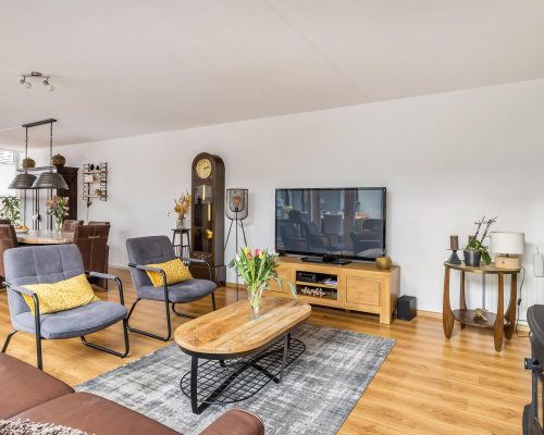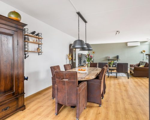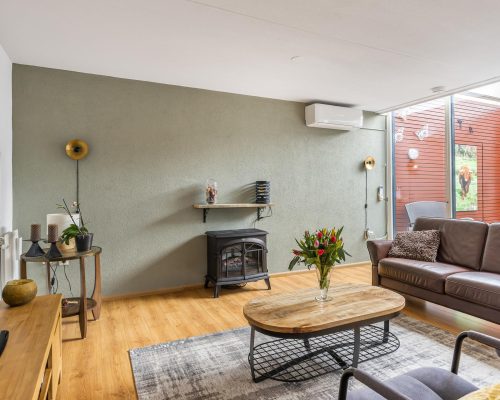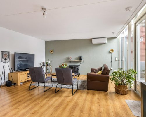 De woonkamer met open keuken ligt aan de linkerzijde van de woning. Een fijne lichte ruimte dankzij de royale raampartijen. Je kijkt vanuit de woonkamer uit op de patio. Dankzij de airco ben je altijd verzekerd van een comfortabel binnenklimaat.