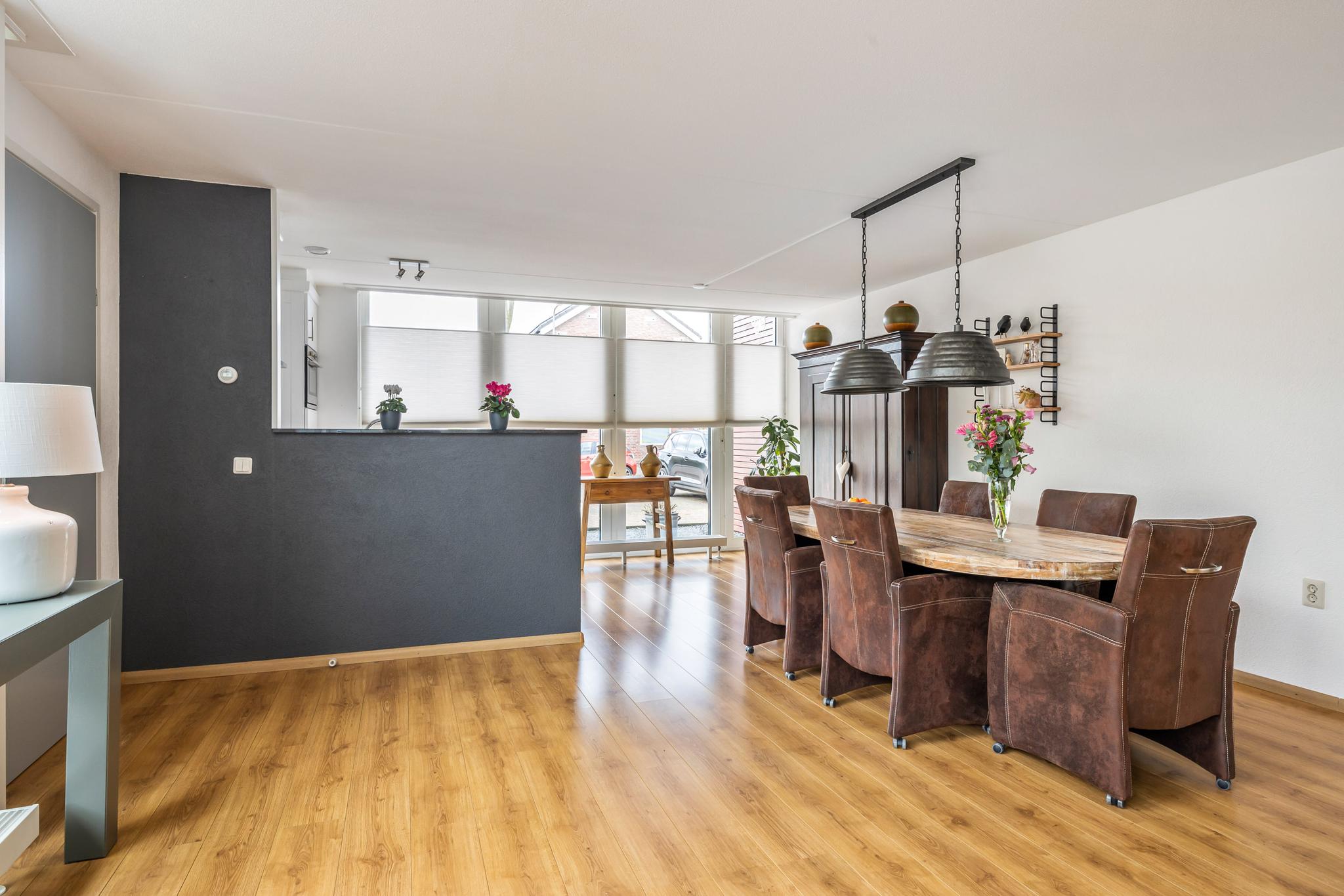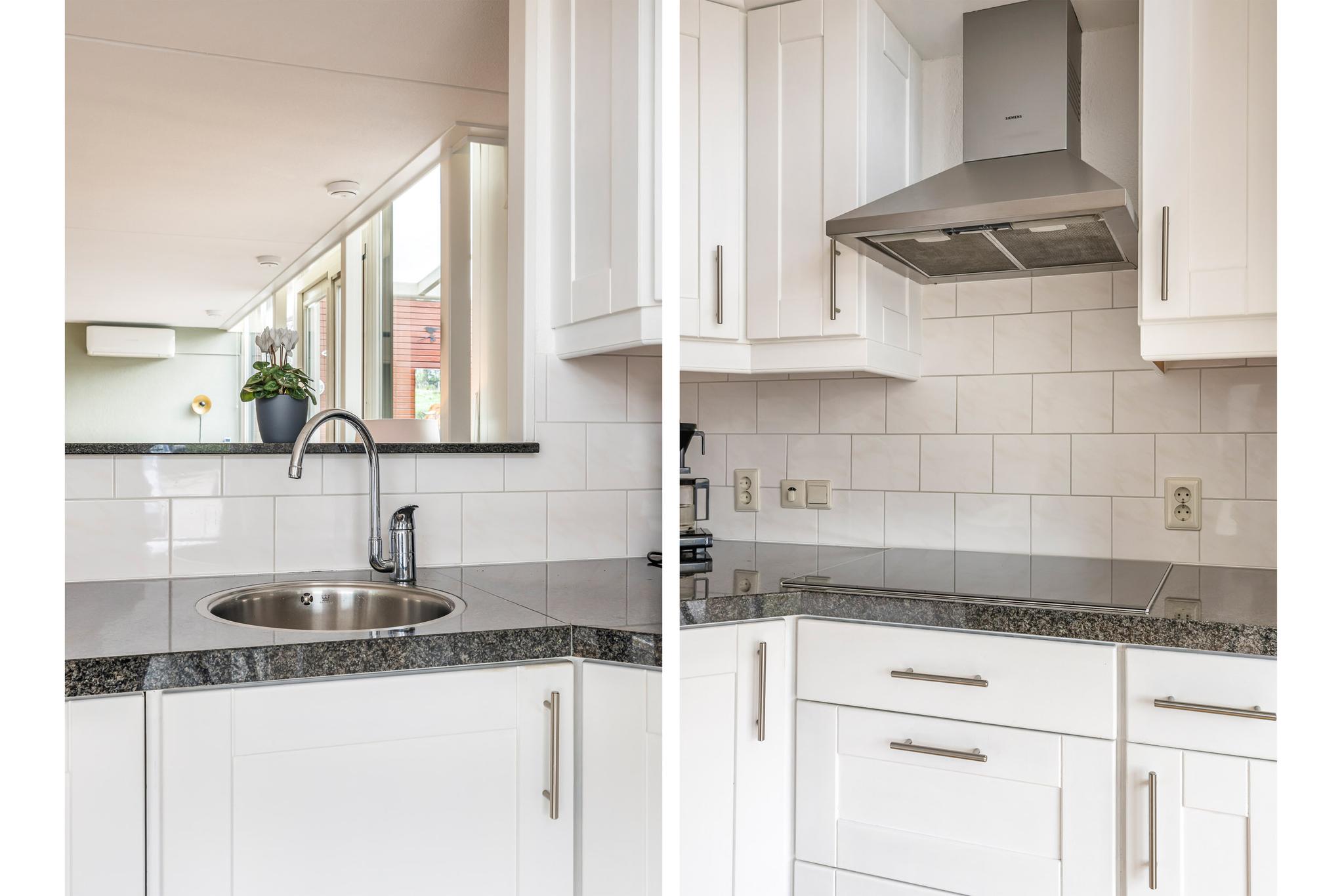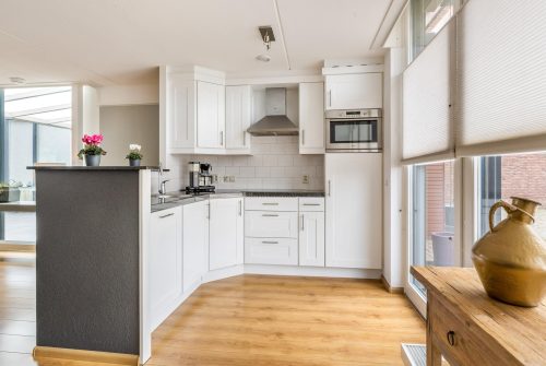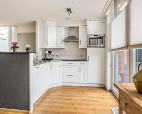 Aan de voorzijde van de woning ligt de keuken. Deze hoekkeuken combineert functionaliteit met een tijdloze uitstraling. De eiken keuken is in een witte kleurstelling uitgevoerd en biedt dankzij de bovenkasten veel bergruimte. Het grote raam zorgt voor volop licht op het werkblad en voor een ruimtelijk gevoel. De elektrisch bedienbare rolluiken bieden extra wooncomfort.