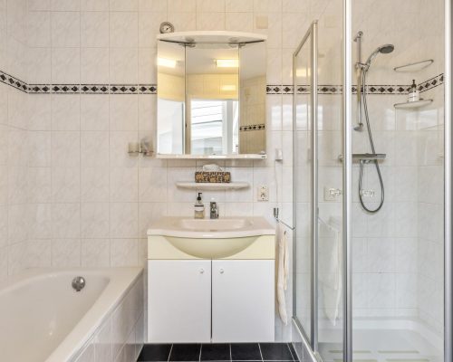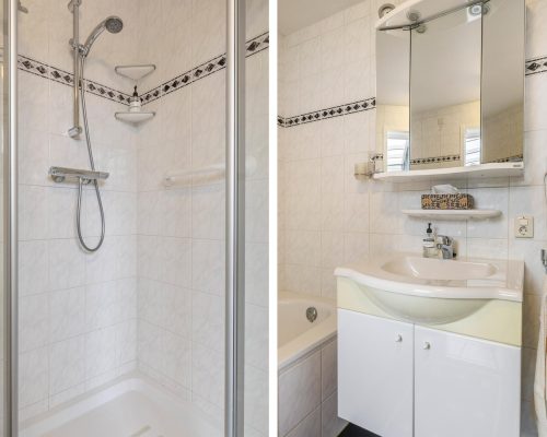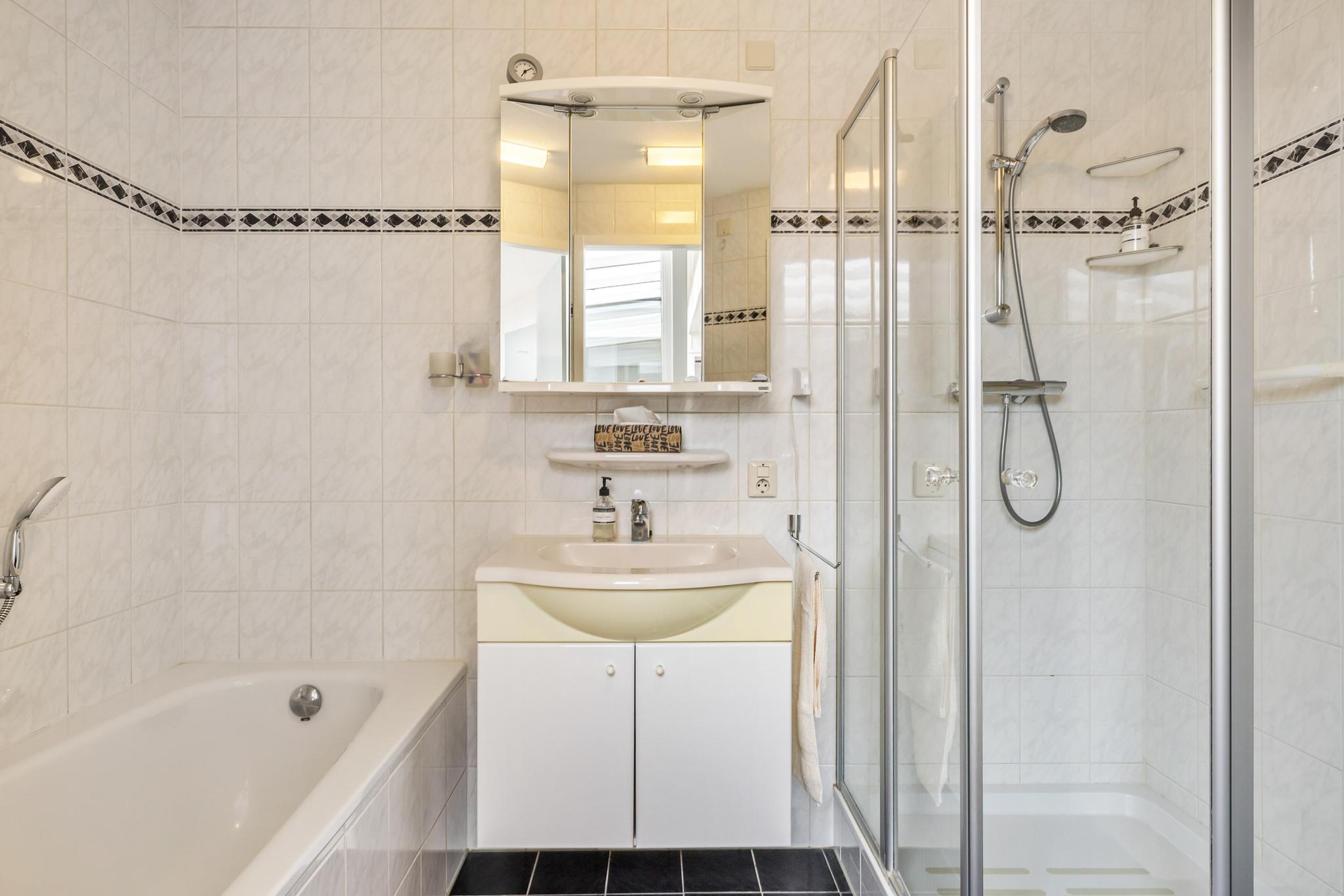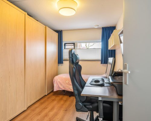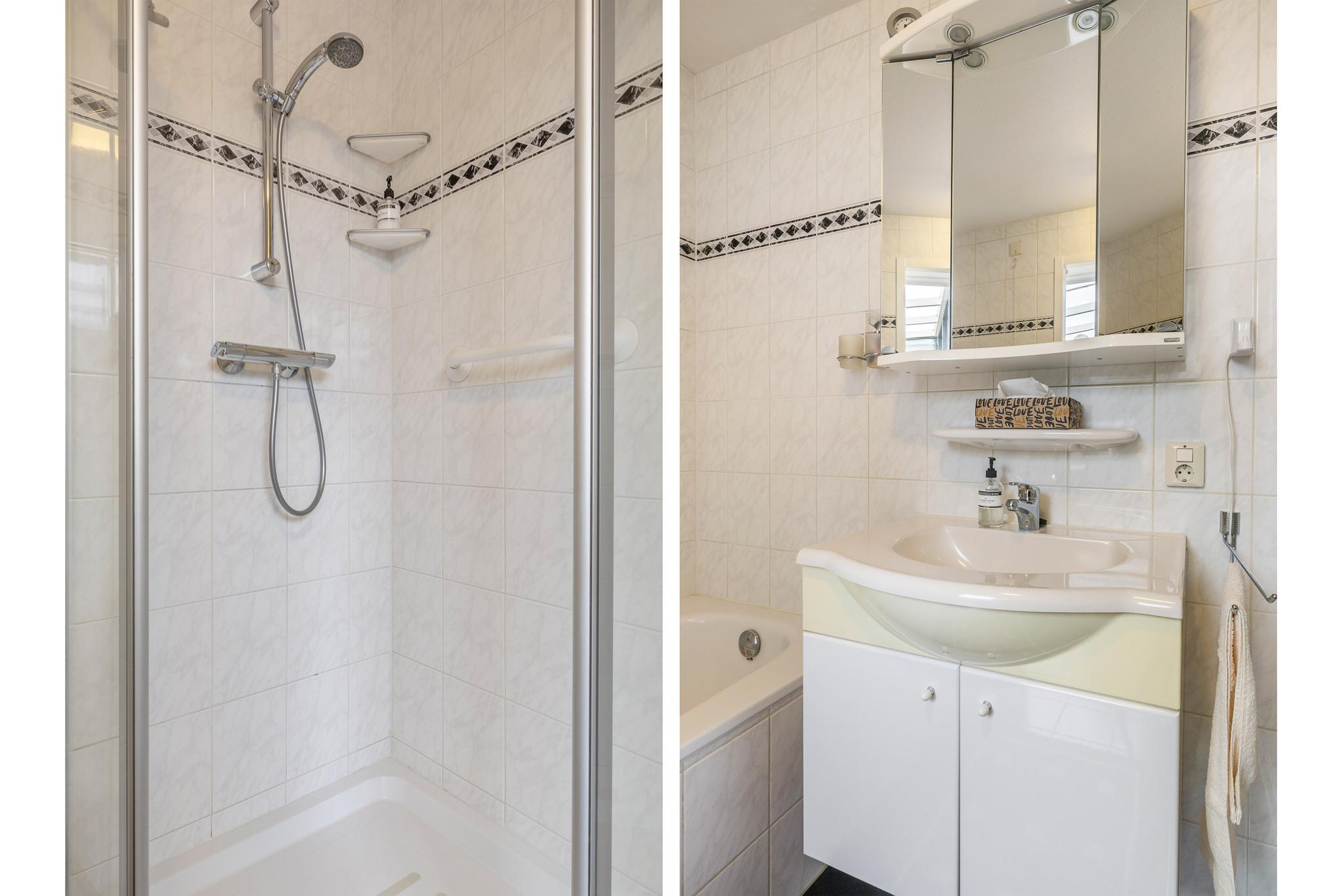 Het gehele woonprogramma bevindt zich op de begane grond. Via de gang, die de patio als het ware “omarmt” lopen we naar de slaapkamer. Deze bevindt zich aan de voorzijde van de woning. Een fijne ruimte die nu als logeerkamer en kantoor wordt gebruikt. Vervolgens komen we in de geheel betegelde badkamer in tijdloze kleurstelling. Compleet uitgerust met een ligbad, douchecabine en wastafel met wastafelmeubel. Op de vloer ligt een zwarte tegel.