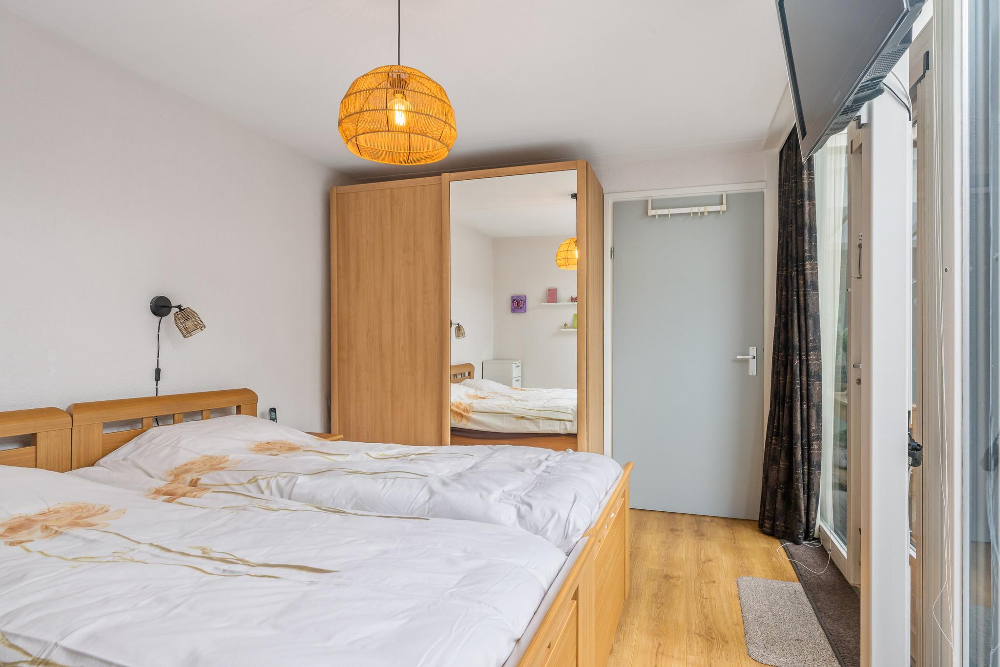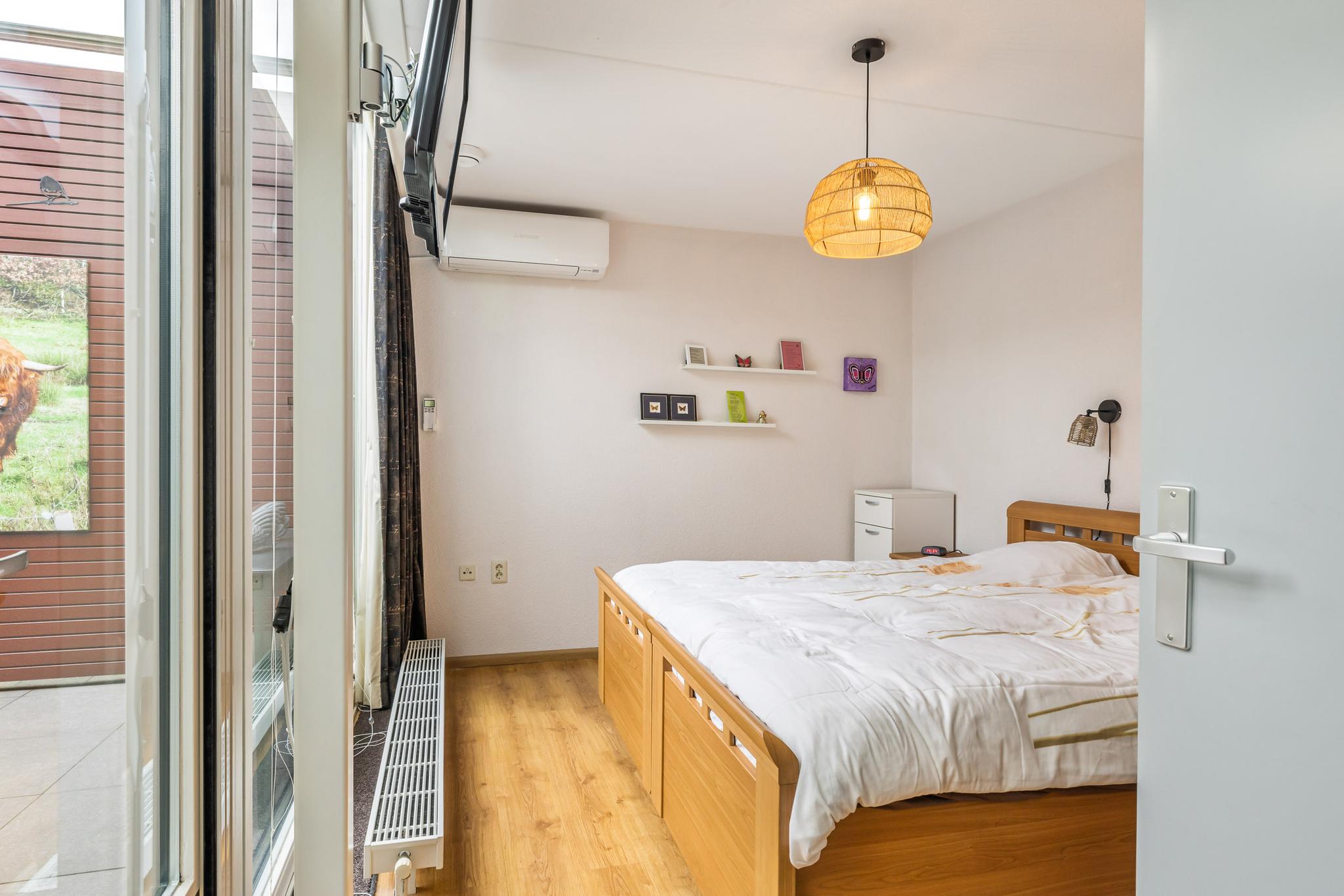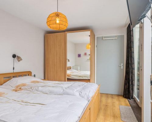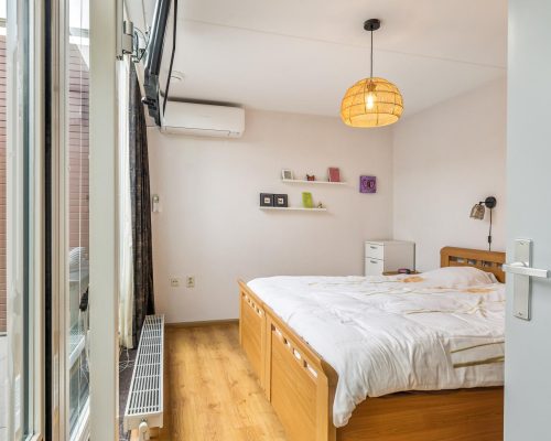 Aan het einde van de gang ligt de tweede slaapkamer. Dankzij de grote raampartijen is het een fijne lichte ruimte en heb je zicht op de patio. Vanuit de slaapkamer loop je zo naar buiten. Ook hier is een airco geïnstalleerd, zodat je verzekerd bent van een optimaal slaapklimaat.