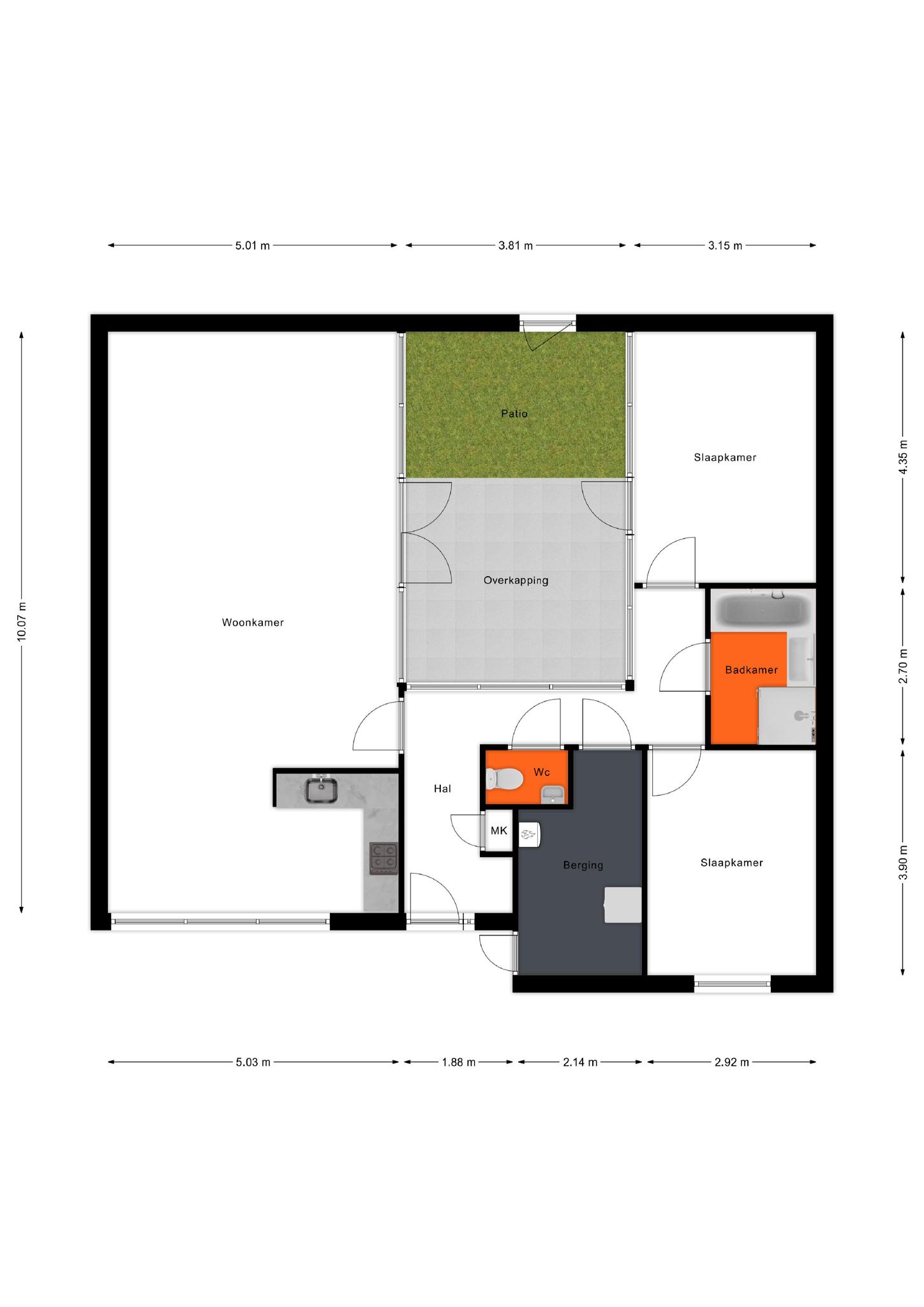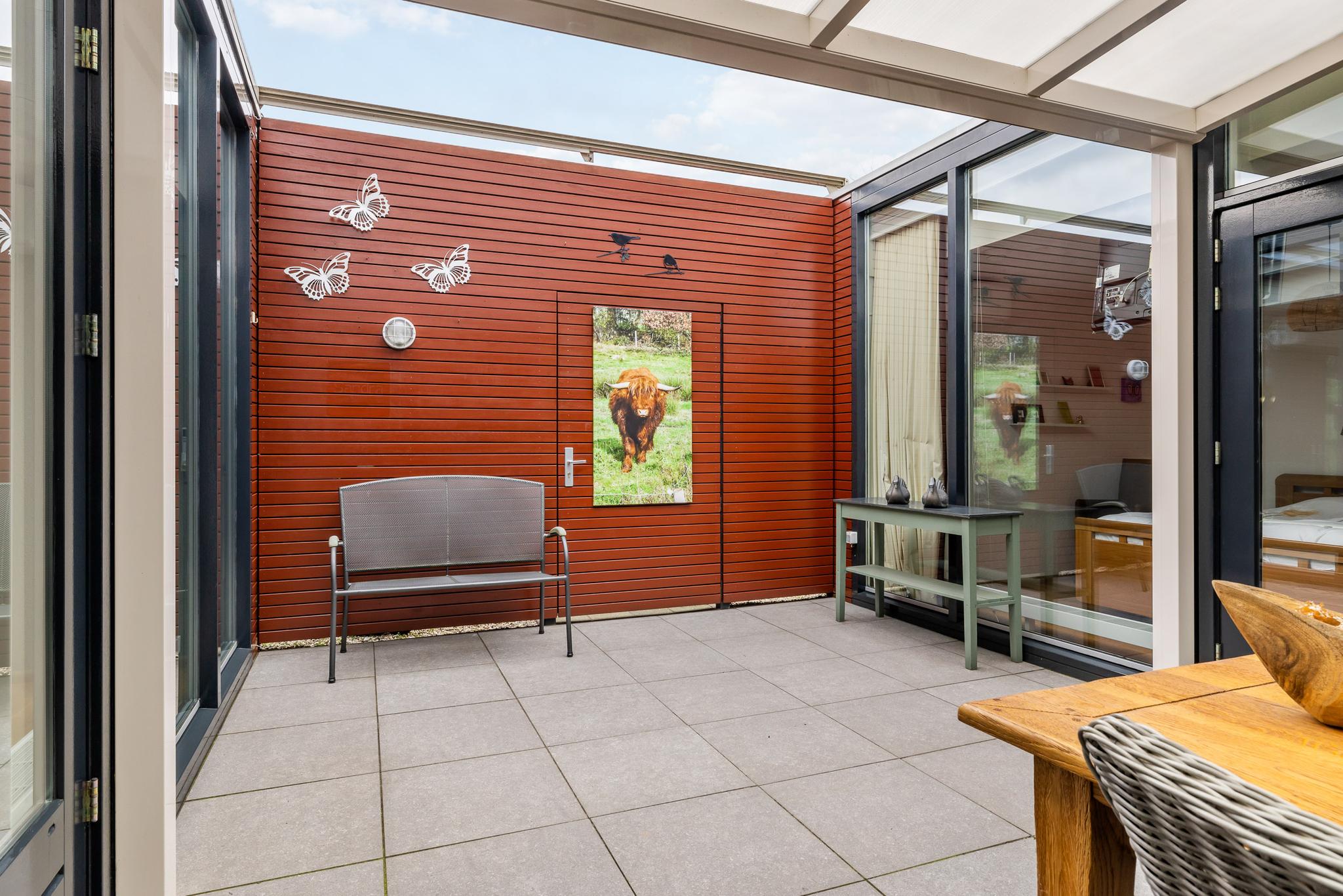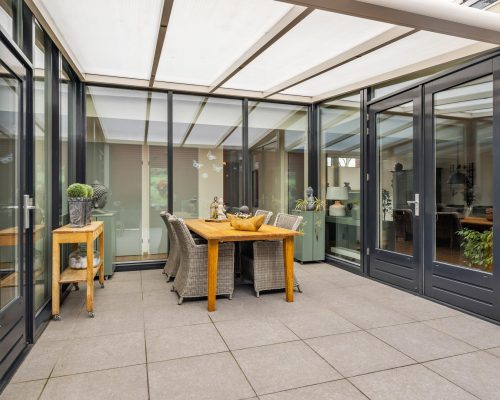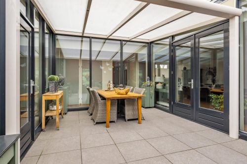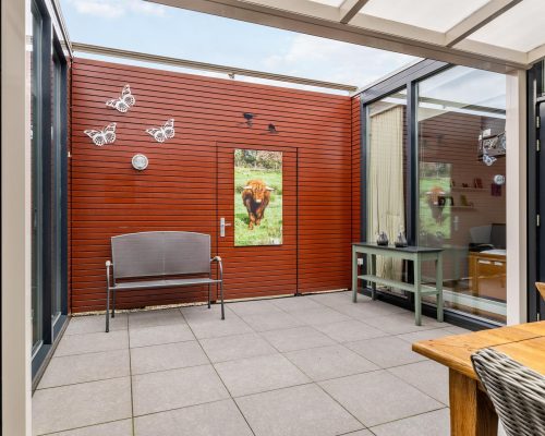 De patio is bereikbaar vanuit de woonkamer en de slaapkamer. Een heerlijke plek om te genieten van de buitenlucht en van je privacy. De buitenruimte is op het zuidoosten georiënteerd, je bent hier altijd verzekerd van een plekje in de zon of je zoekt dankzij de elektrisch bedienbare screen en de terrasoverkapping een fijn plekje in de schaduw op. Via de patio loop je naar de brandgang waar de containers staan opgesteld.