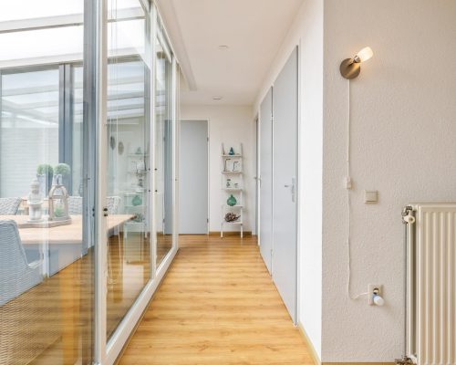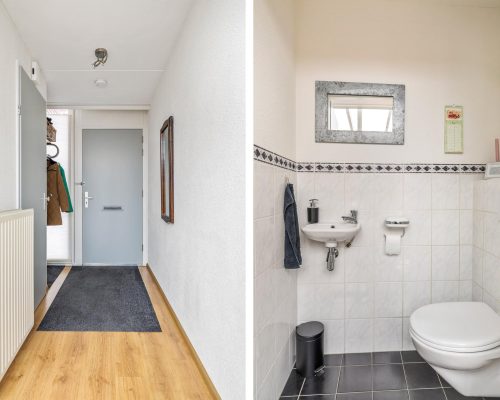 De hal loopt over in een gang die alle ruimtes met elkaar verbindt. Bij binnenkomst tref je de garderobe en de meterkast. Loop je verder door dan bevindt zich “om de hoek” het toilet met fonteintje. Het toilet is deels betegeld en deels gestuukt. Daarnaast bevindt zich de berging/technische ruimte. Deze is ruim van opzet en geheel betegeld. Hier hangt de CV ketel, het WTW systeem (2024), de omvormer voor de zonnepanelen (2021) en is het witgoed opgesteld. Verder is er veel bergruimte beschikbaar en een groot praktisch voordeel is de loopdeur naar buiten. Hierdoor kunnen de fietsen in de berging worden gestald.