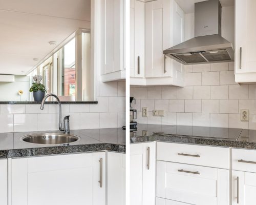 De achterwand is wit betegeld en het werkblad is uitgevoerd in stijlvol zwart graniet.