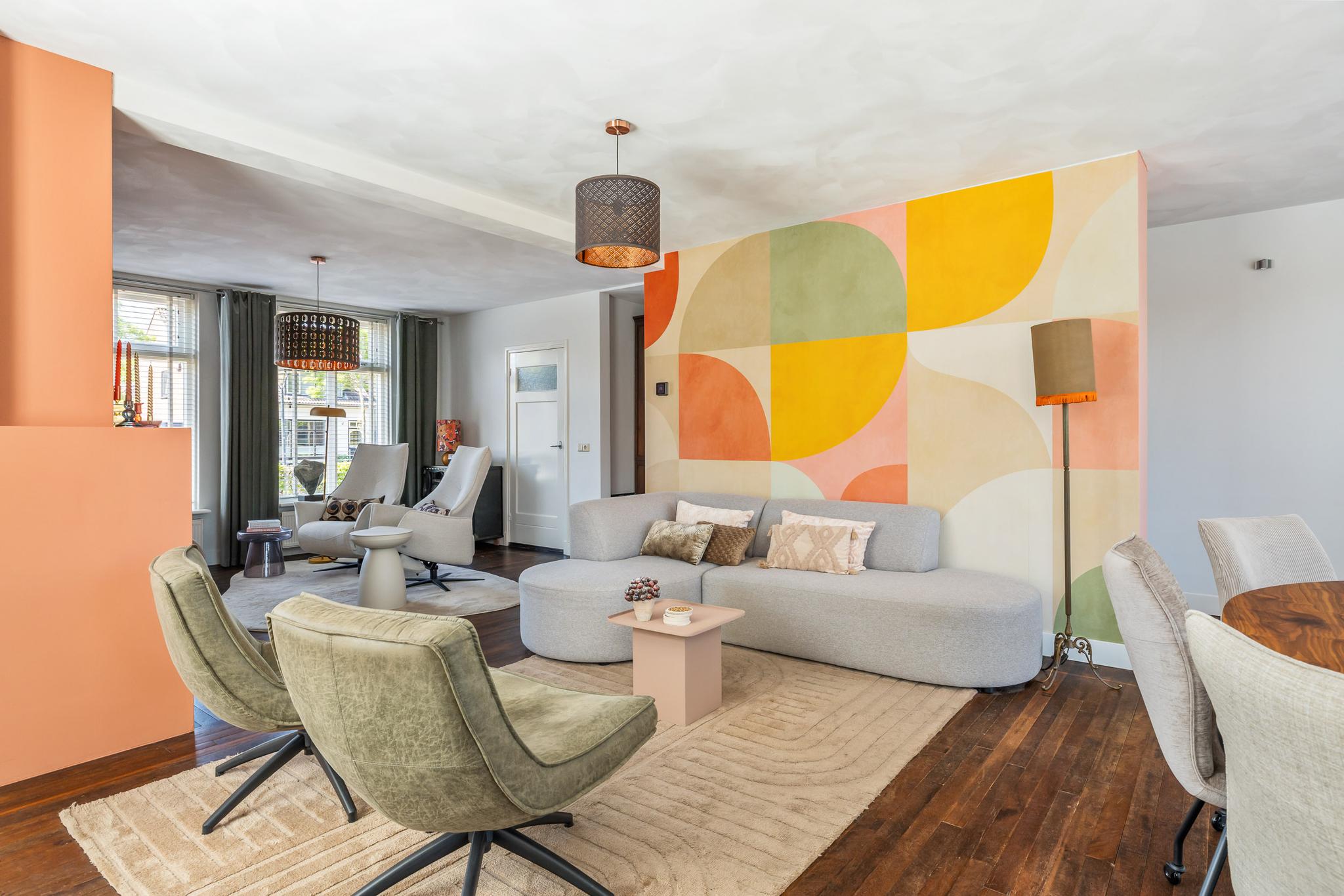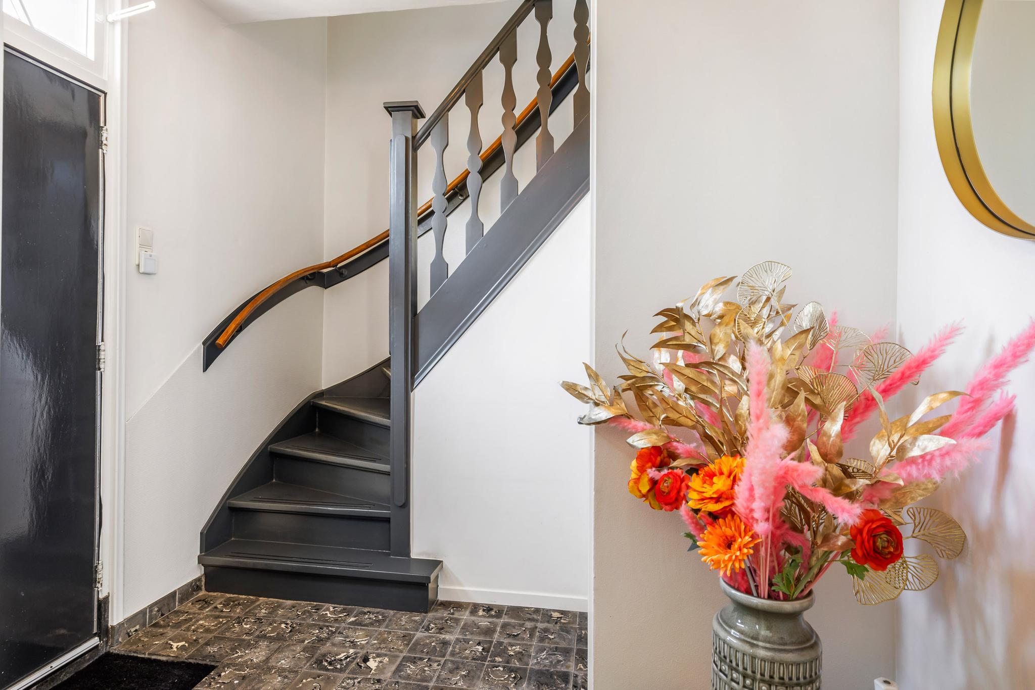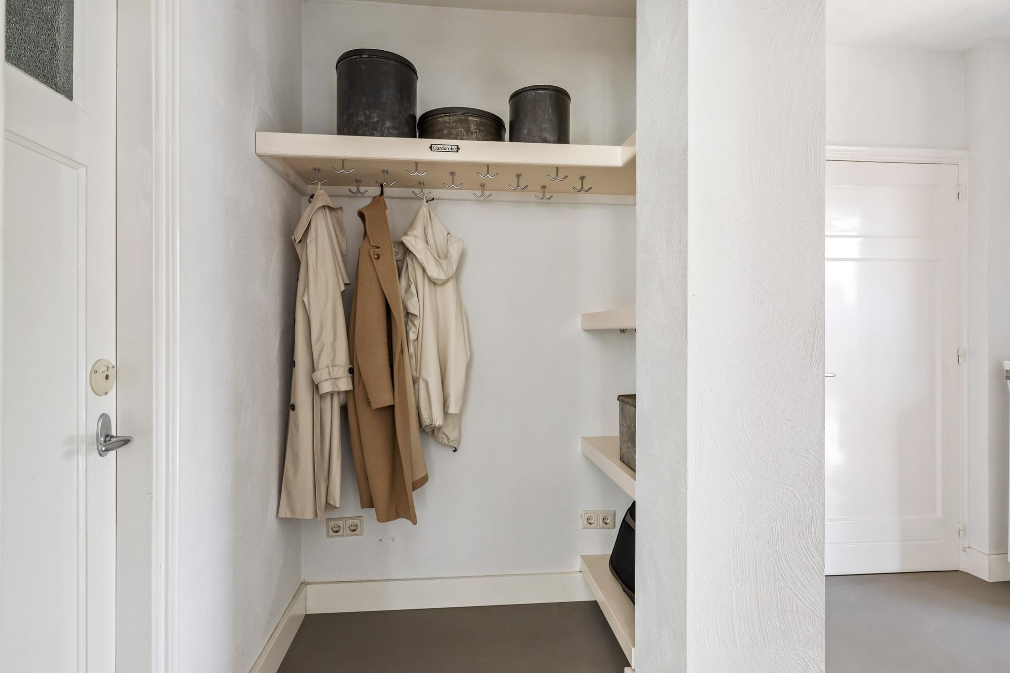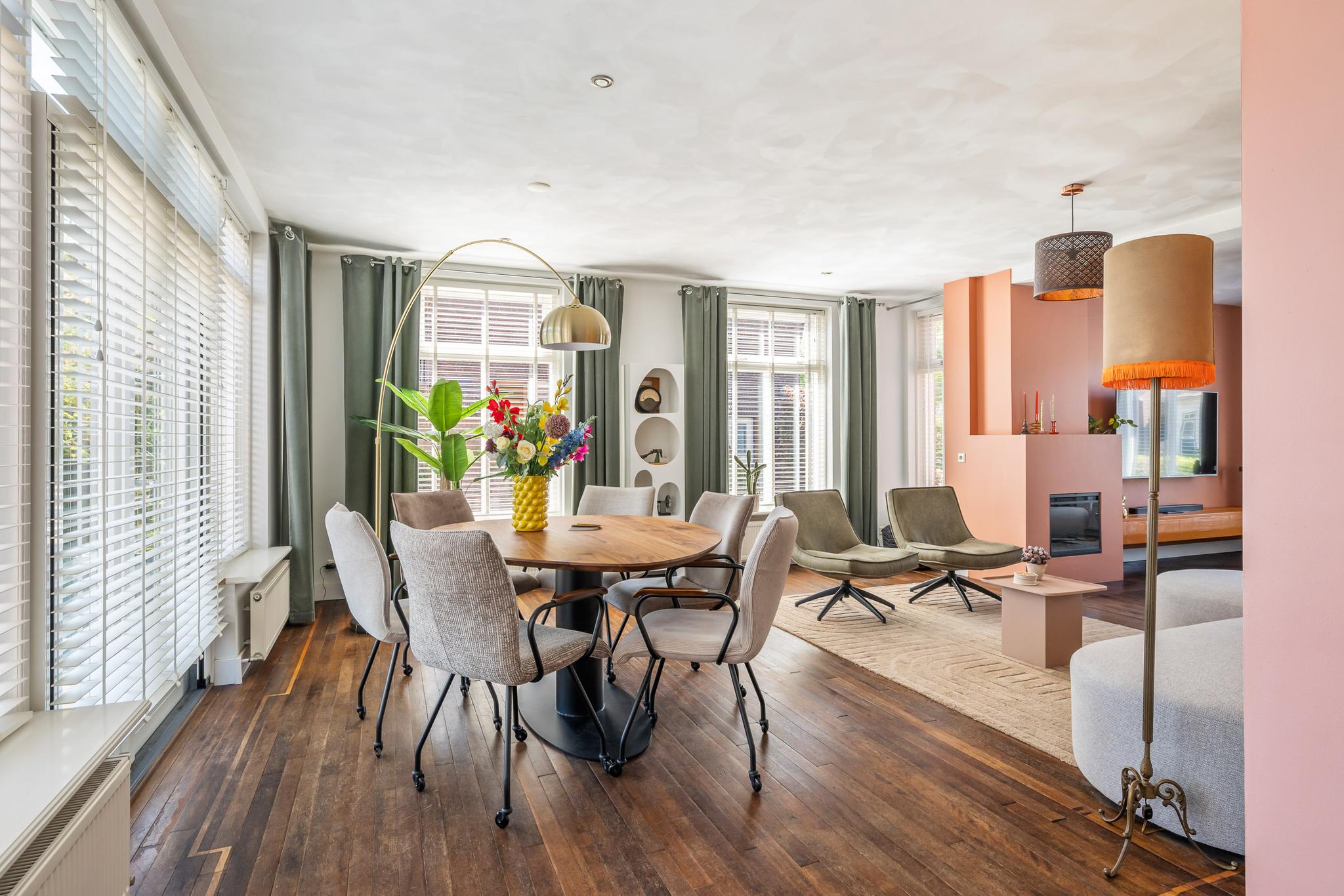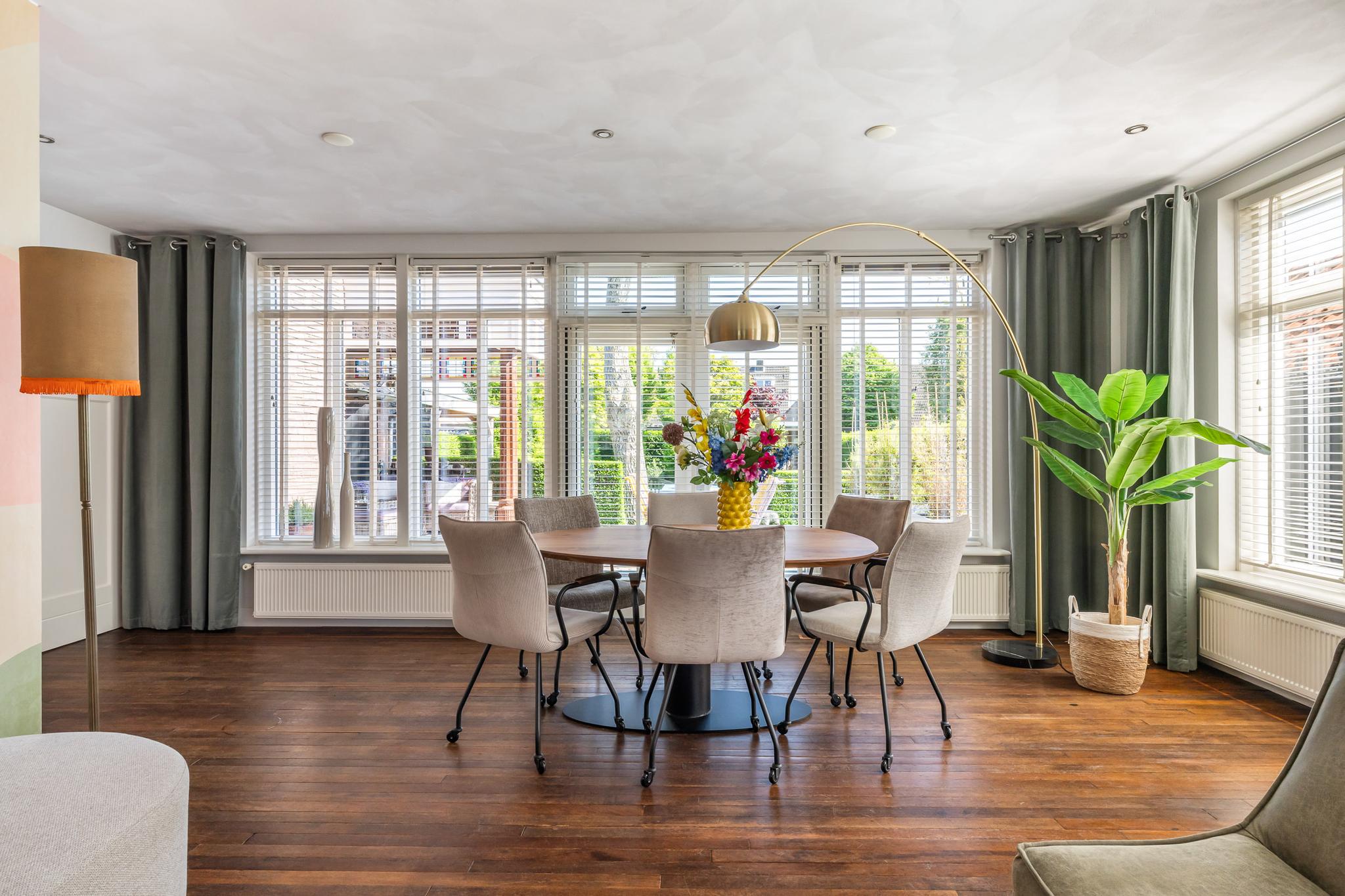 De royale hal, waar de originele tegelvloer is behouden, geeft toegang tot de trapopgang, de garderobe, de vernieuwde meterkast (2024) en de woonkamer. De sfeervolle woon- en eetkamer verrast je met een creatieve indeling en volop lichtinval. Dankzij de stijlvolle shutters bepaal je zelf de sfeer en hoeveelheid daglicht.