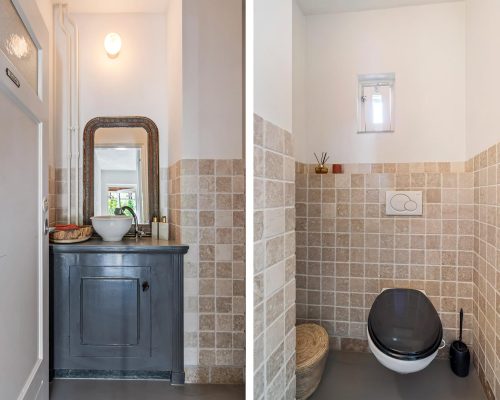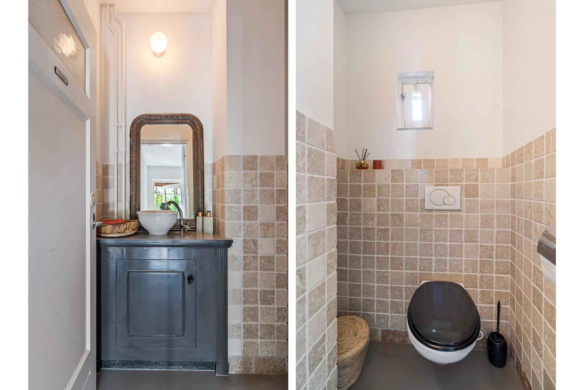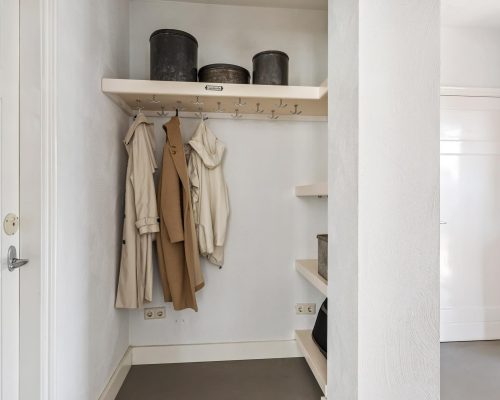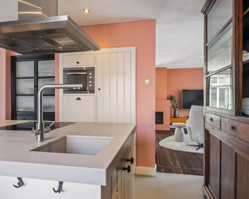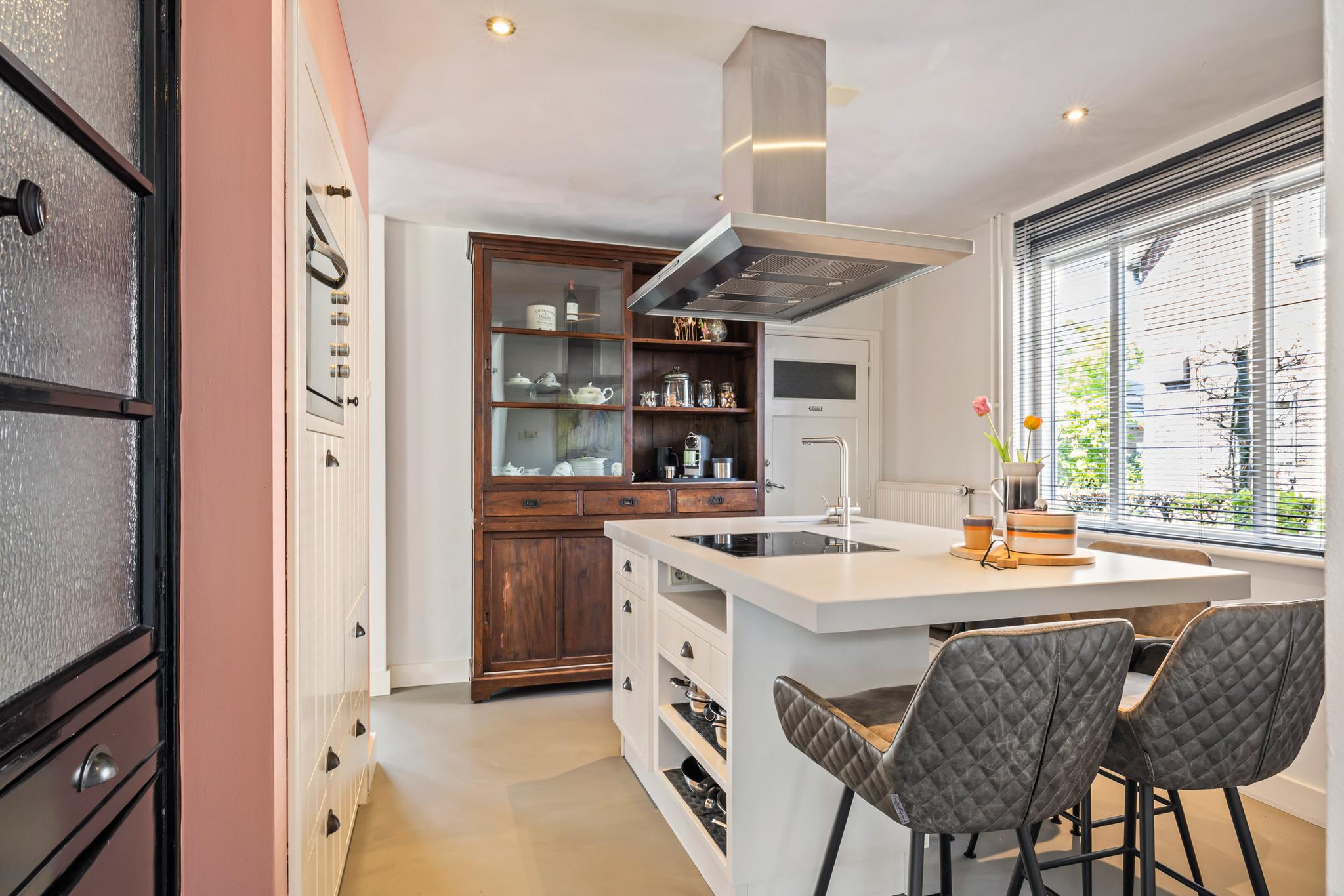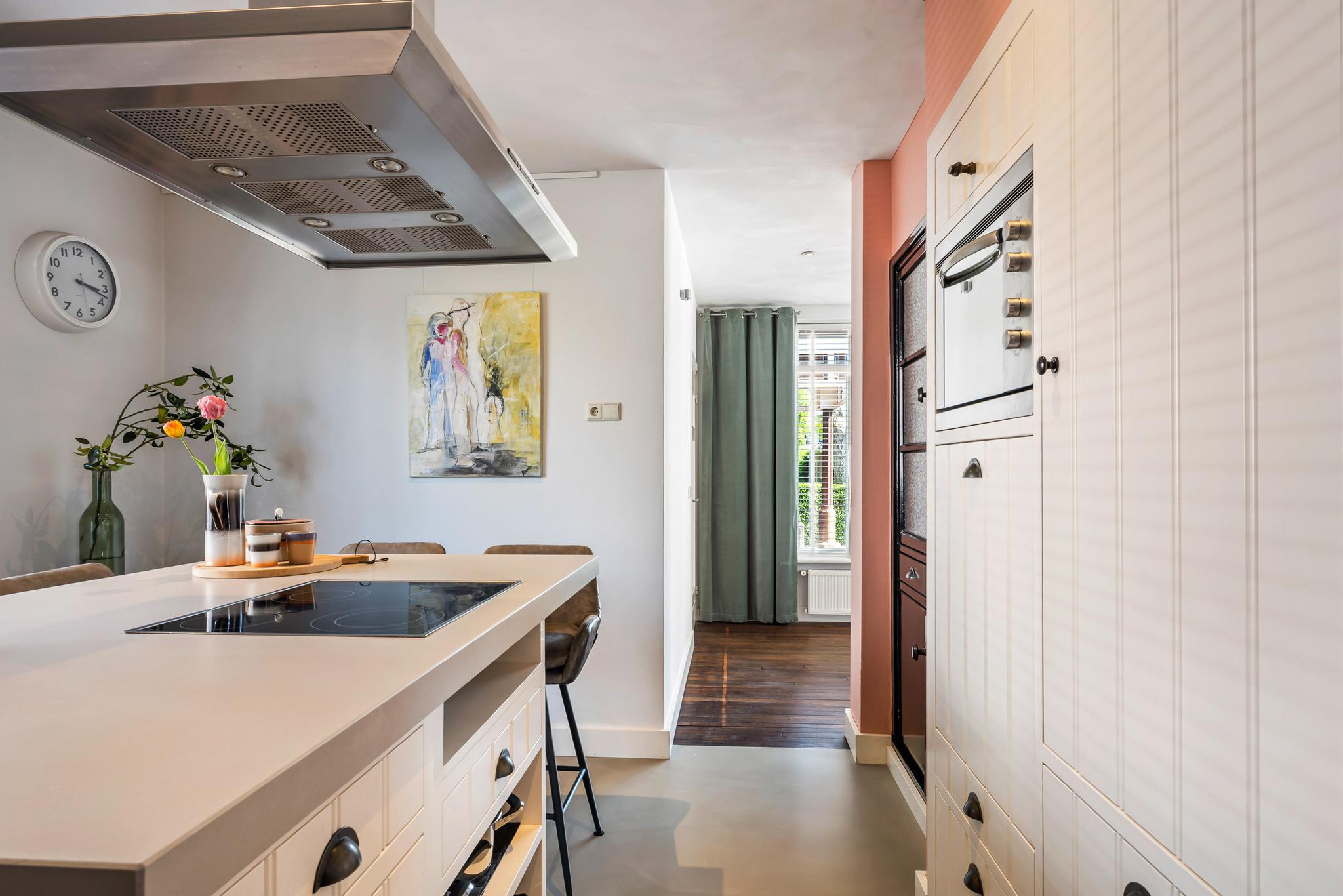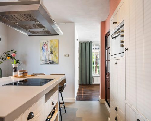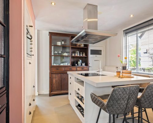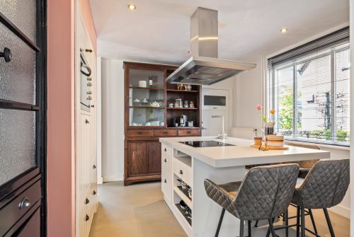 De originele servieskast is bewaard gebleven en vormt een mooi contrast door de donkere kleurstelling. Samen met de strakke gietvloer maakt dit de keuken tot een gezellige ruimte, temeer omdat door het grote raam volop daglicht binnenvalt. Praktisch detail: de keuken beschikt over een sta-hoge, geheel betegelde kelder met daglichttoetreding, perfect voor extra opslag en ideaal om je (drank)voorraad koel te houden. Hier staat ook de vrieskast opgesteld.