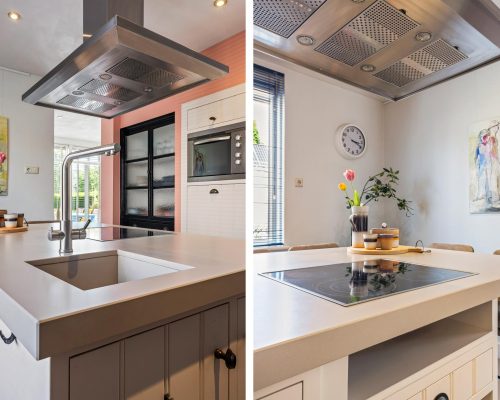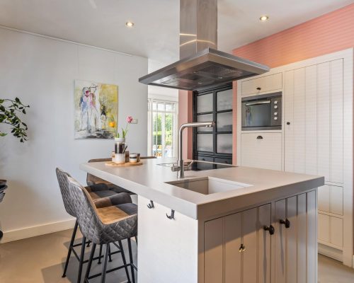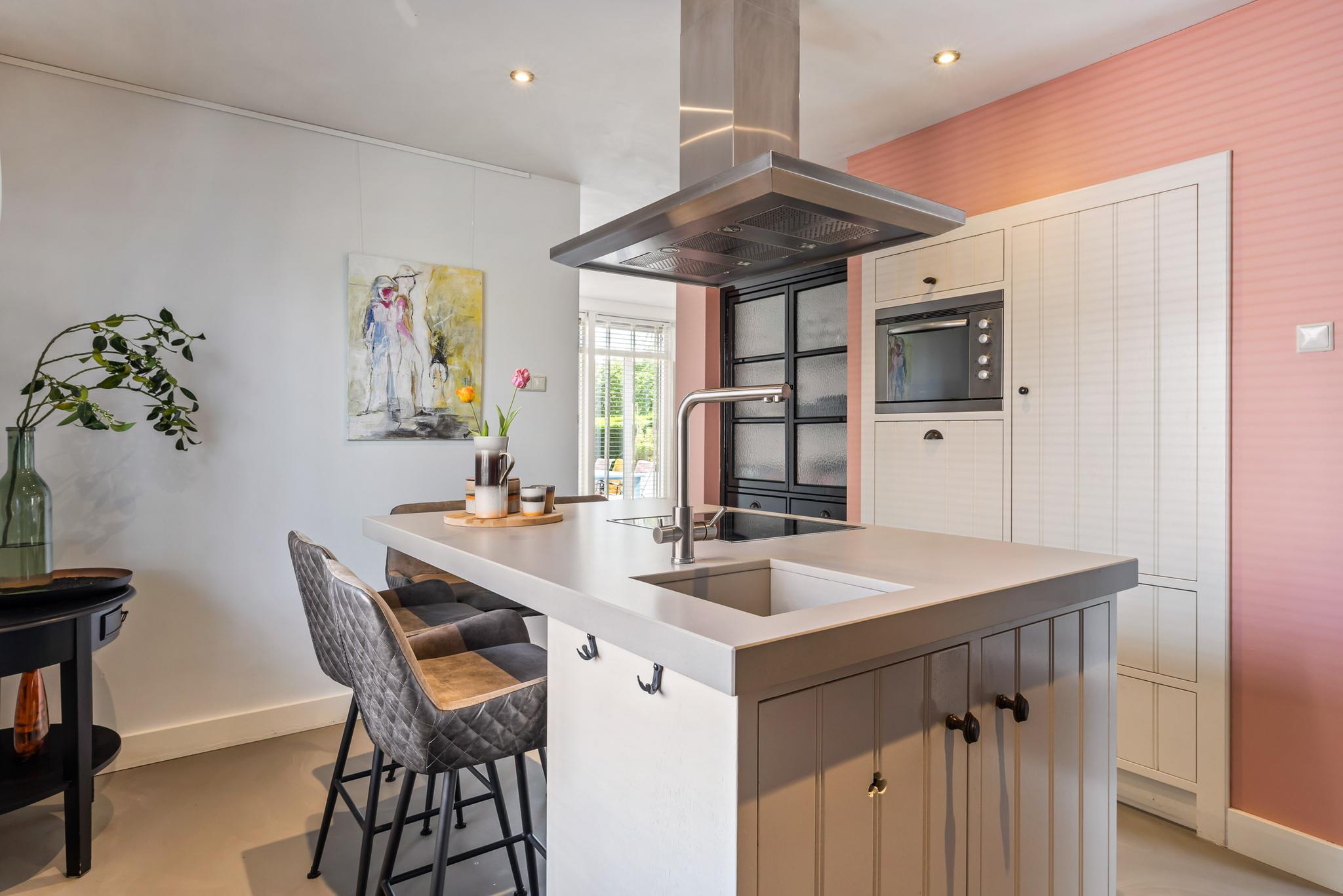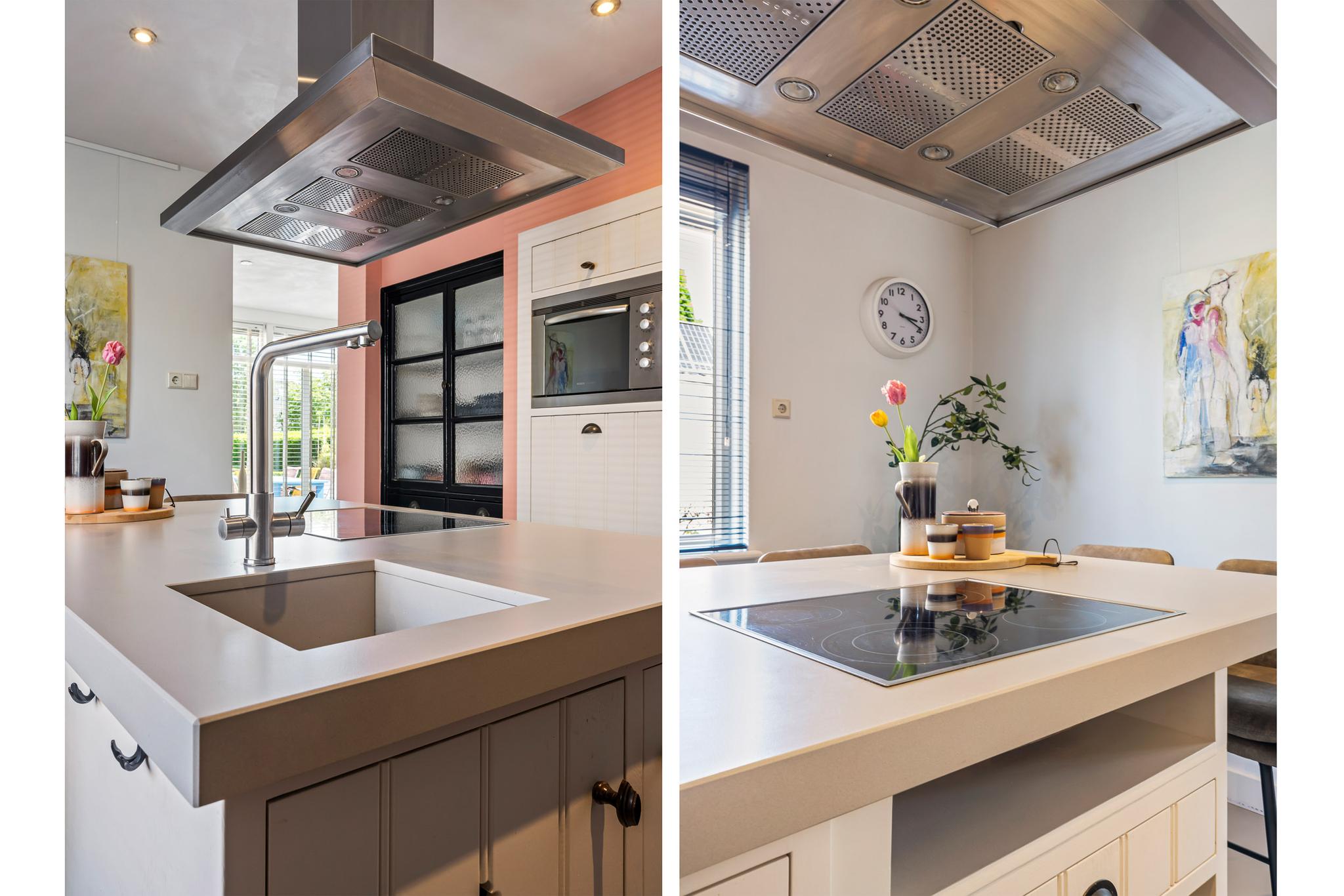 Via de woonkamer loop je naar de halfopen keuken, in stijl ingericht met een kastenwand in lichte kleurstelling en een spoel/kookeiland met ruimte voor vier stoelen. Het eiland is afgewerkt met een composiet werkblad. Uiteraard is de keuken voorzien van alle benodigde apparatuur: