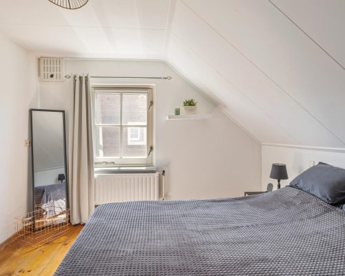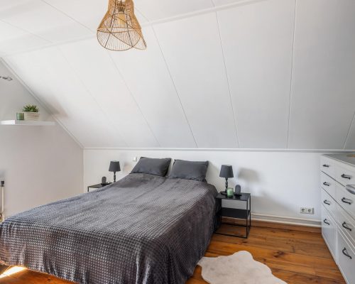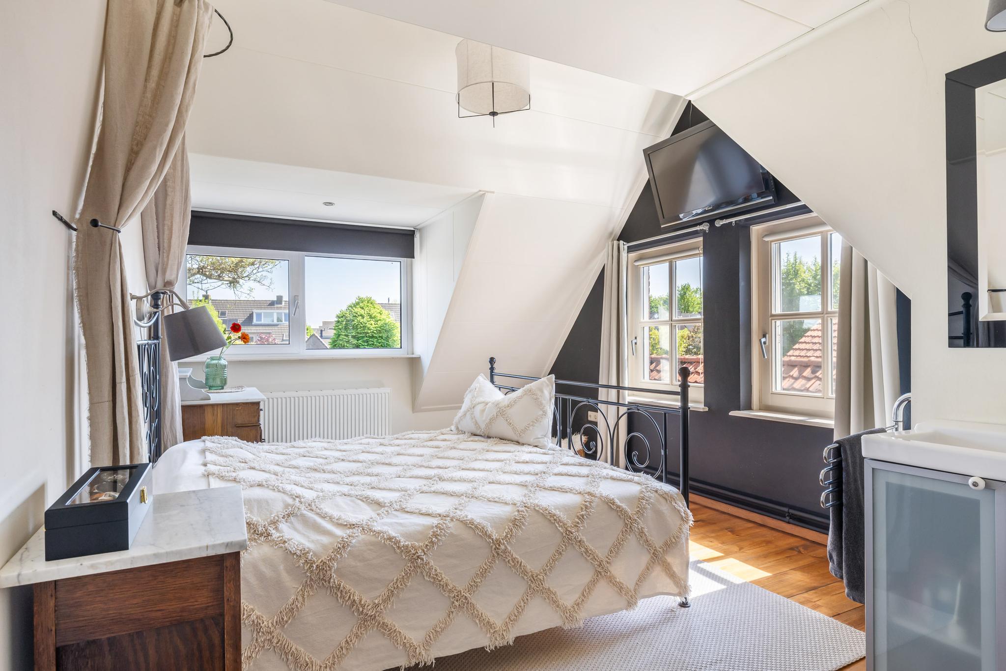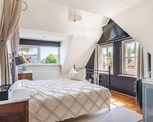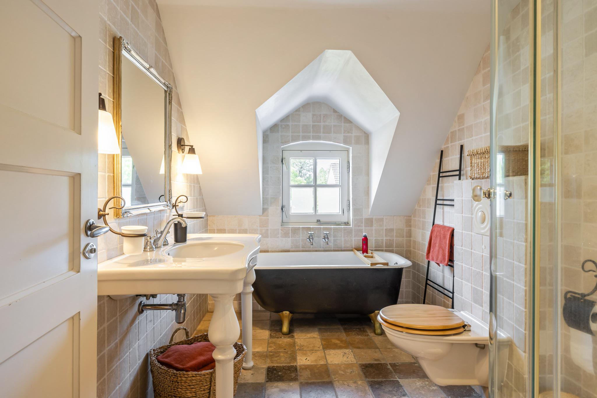 De badkamer is stijlvol uitgevoerd in neutrale bruin/beigetinten en beschikt over een klassiek bad op pootjes, douchecabine, wastafelmeubel, toilet, designradiator en comfortabele vloerverwarming. De mooie vormgeving van de dakkapel geeft de woning karakter en zorgt voor extra lichtinval en ventilatie.