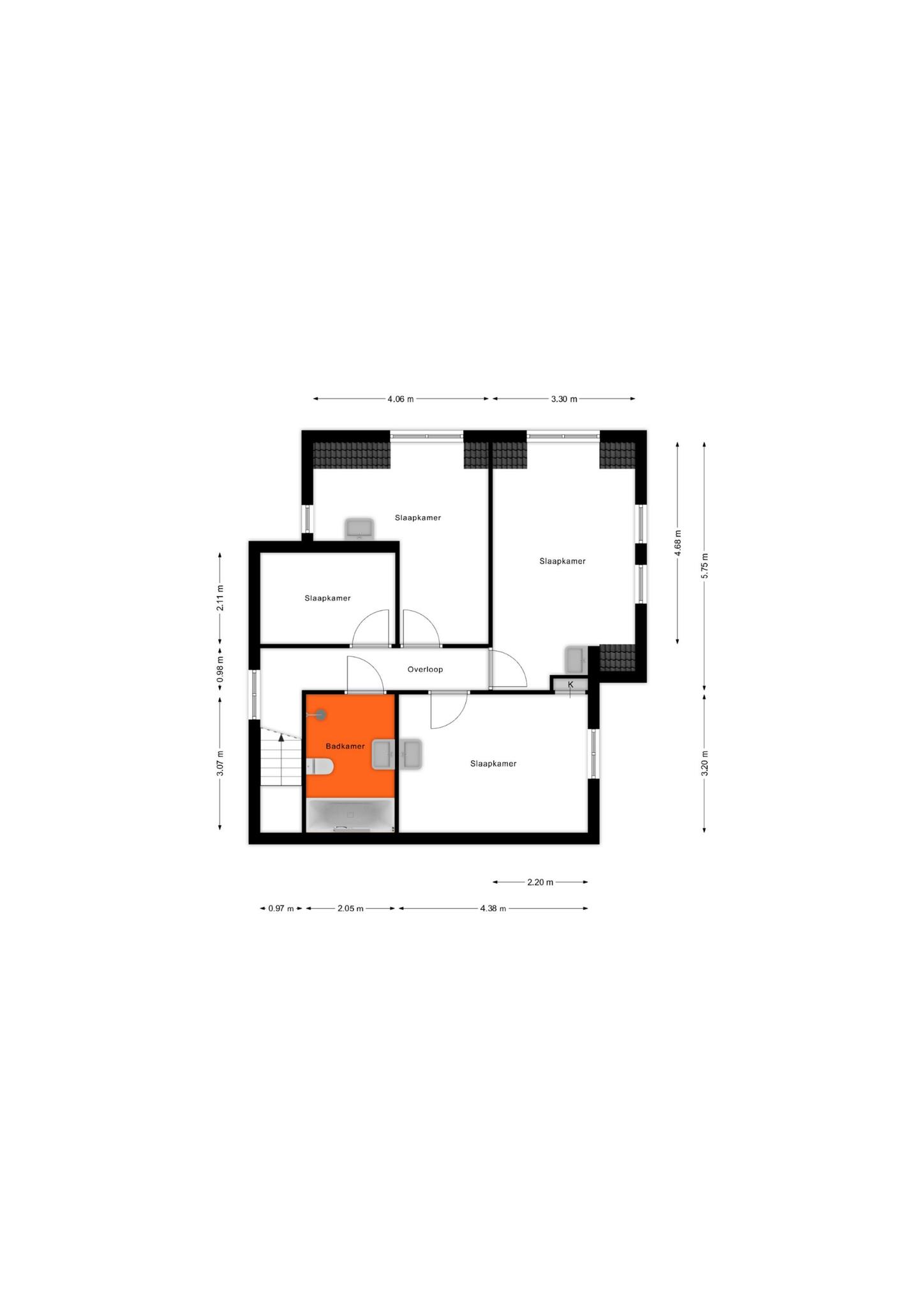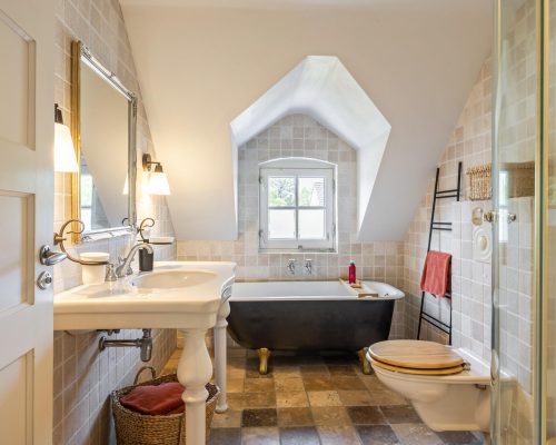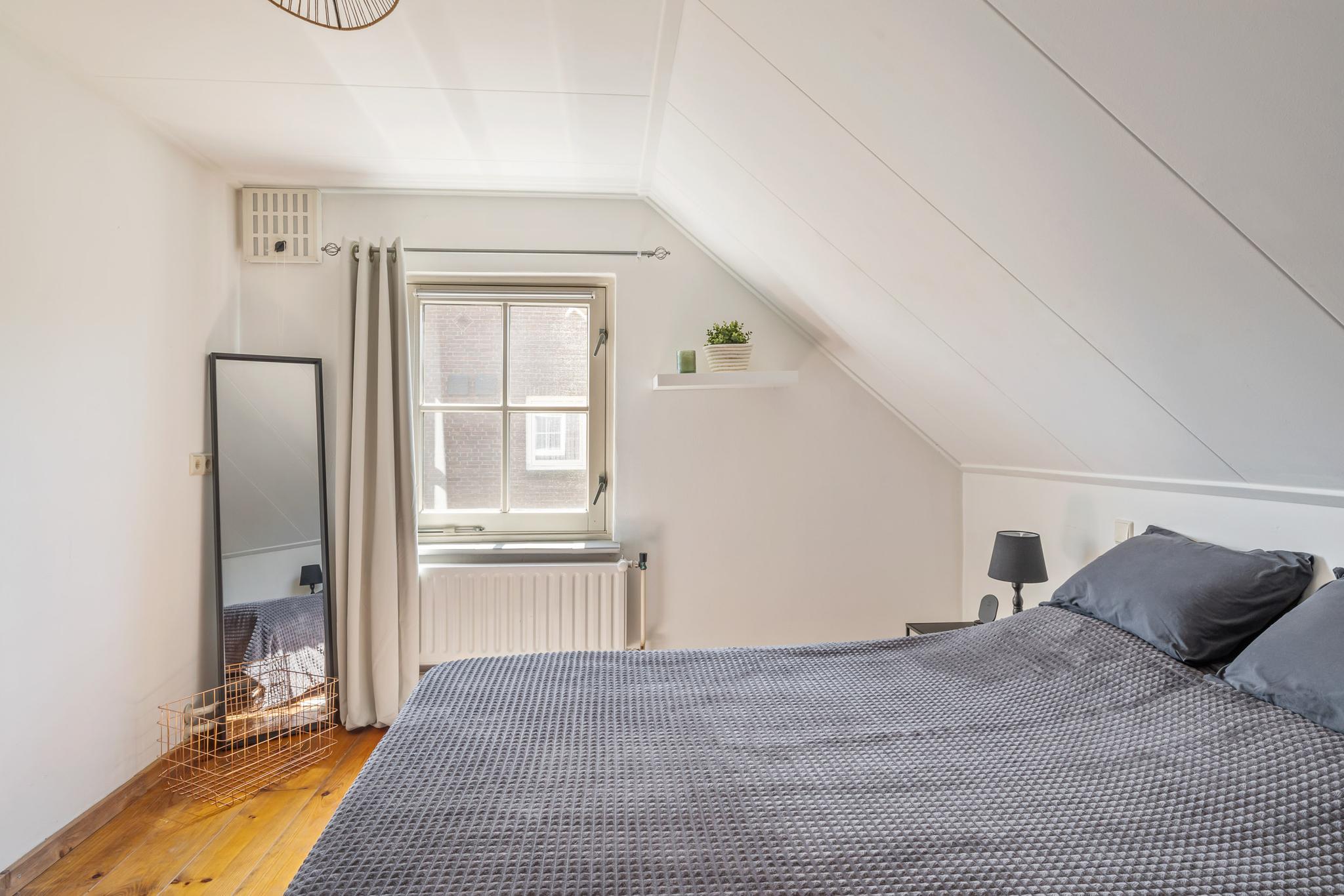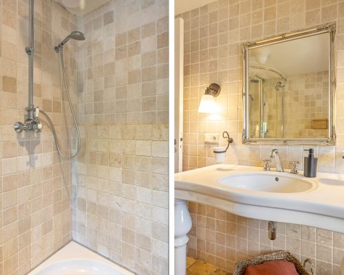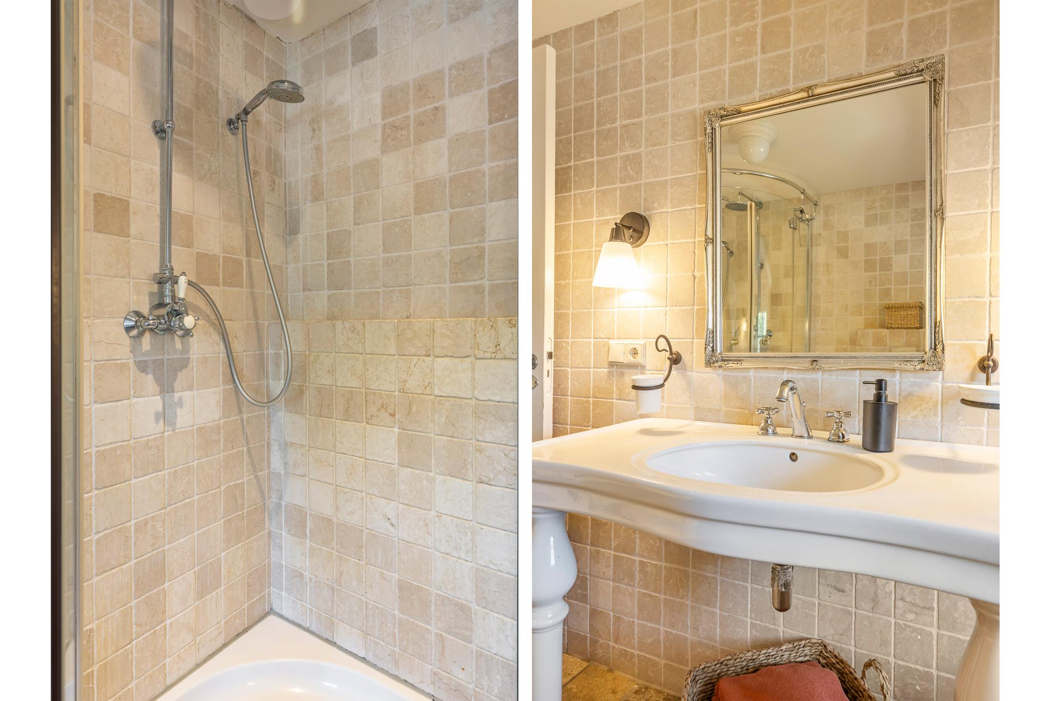 De badkamer is stijlvol uitgevoerd in neutrale bruin/beigetinten en beschikt over een klassiek bad op pootjes, douchecabine, wastafelmeubel, toilet, designradiator en comfortabele vloerverwarming. De mooie vormgeving van de dakkapel geeft de woning karakter en zorgt voor extra lichtinval en ventilatie.
