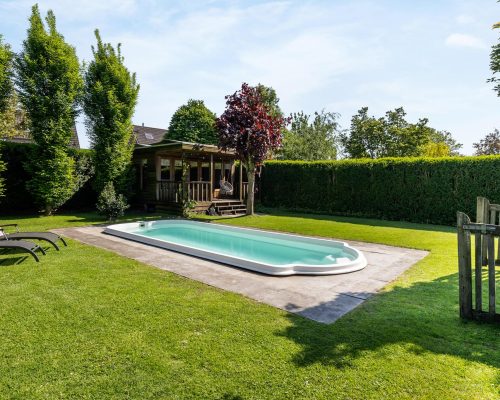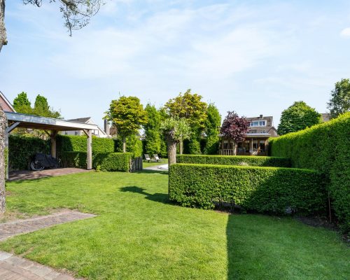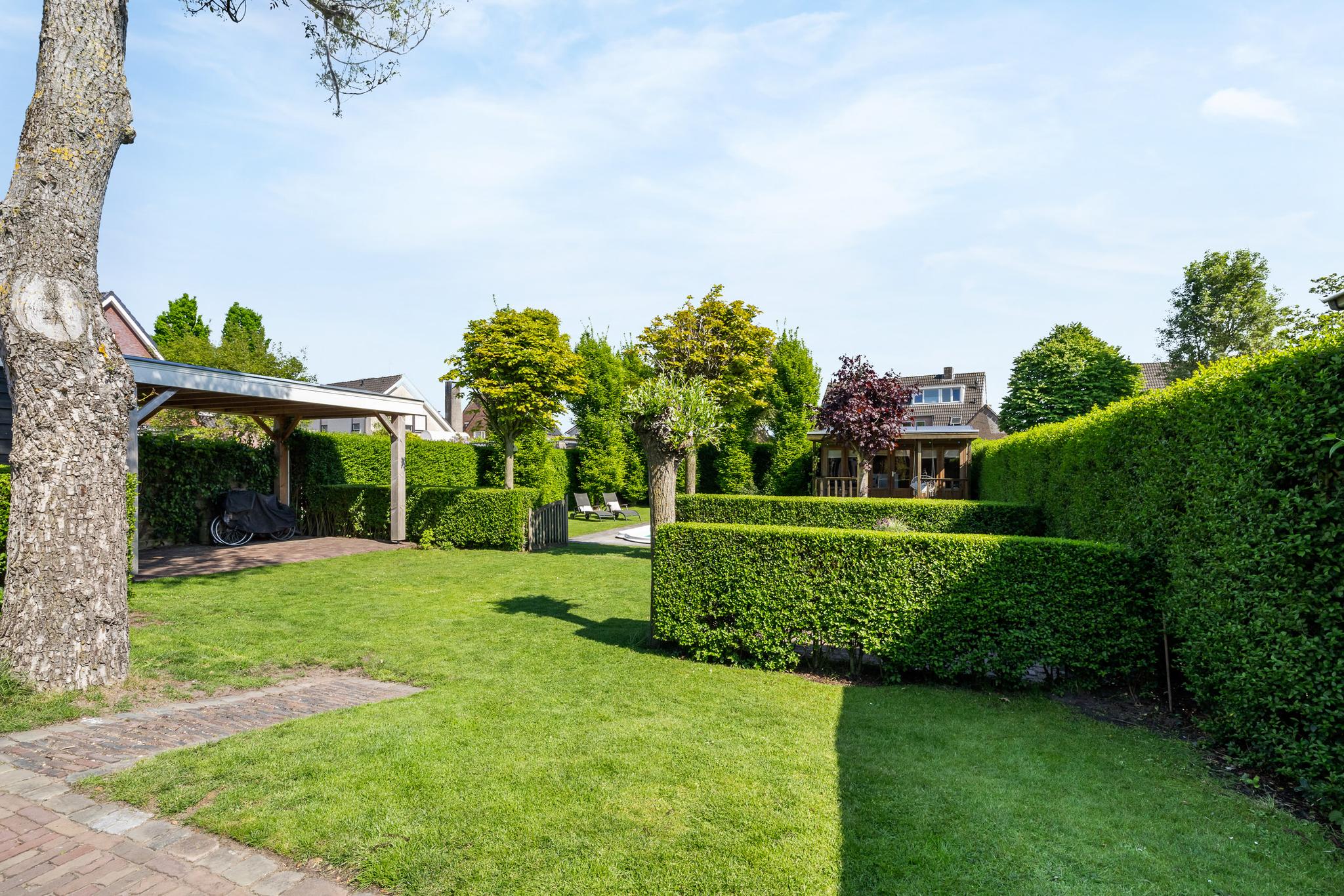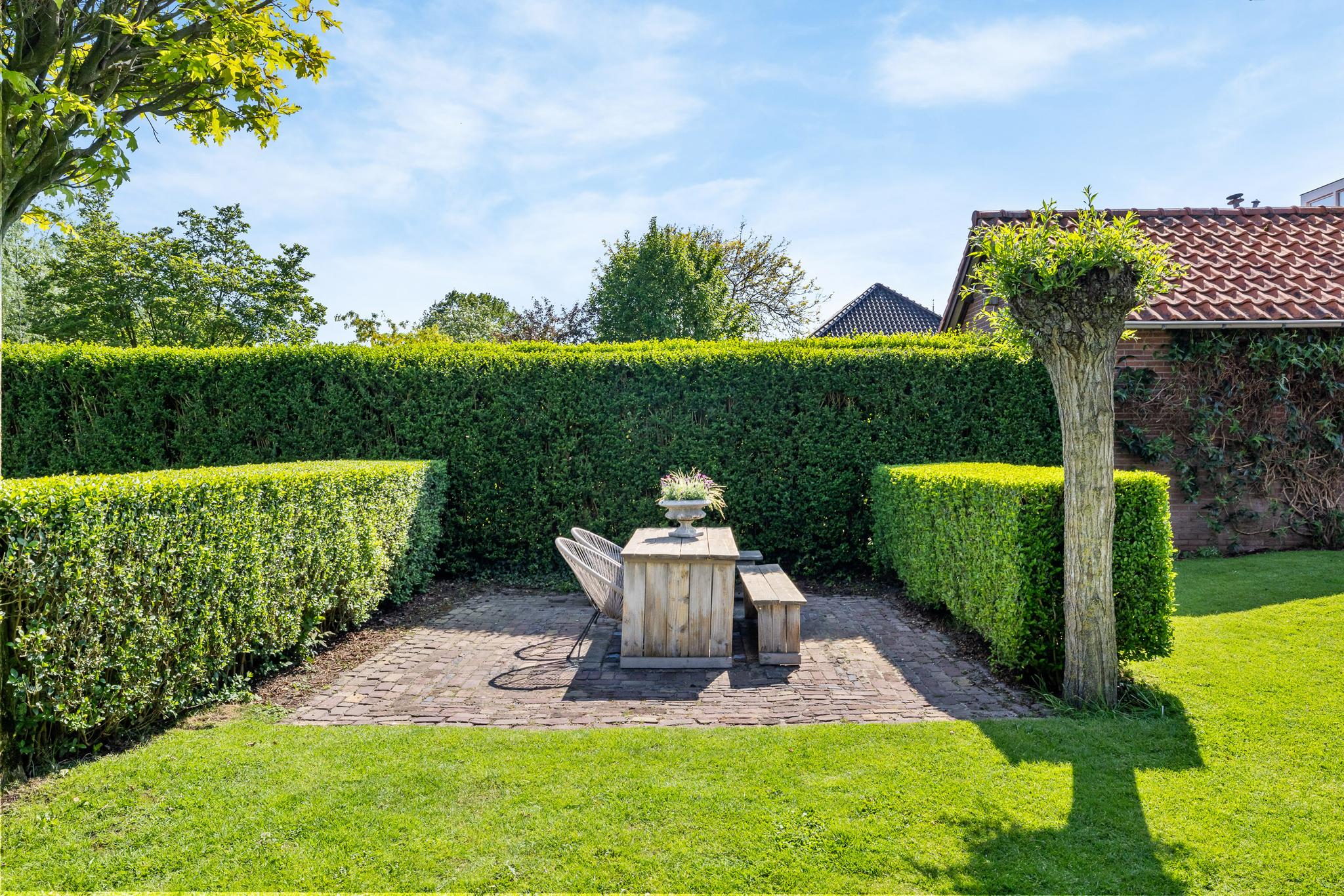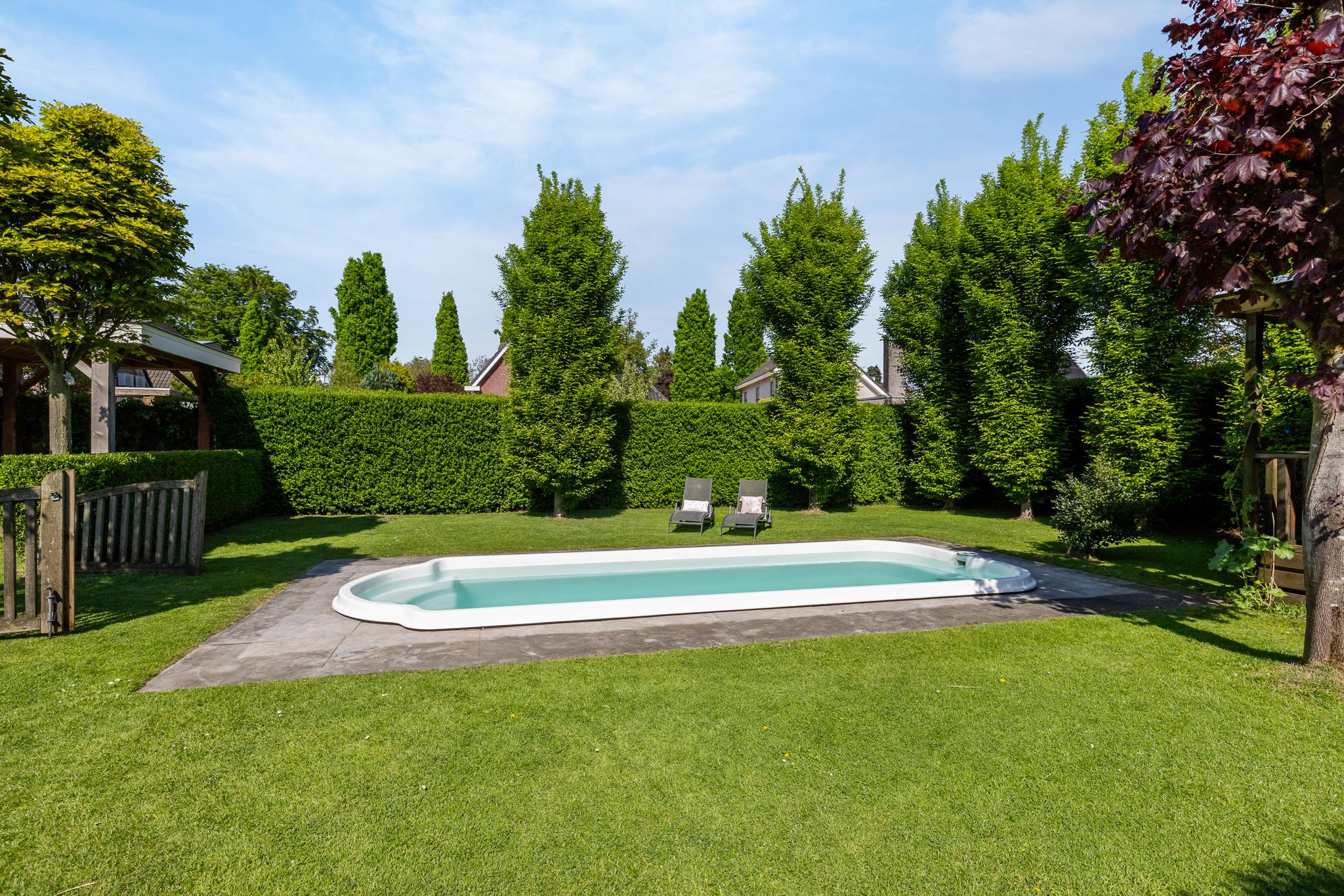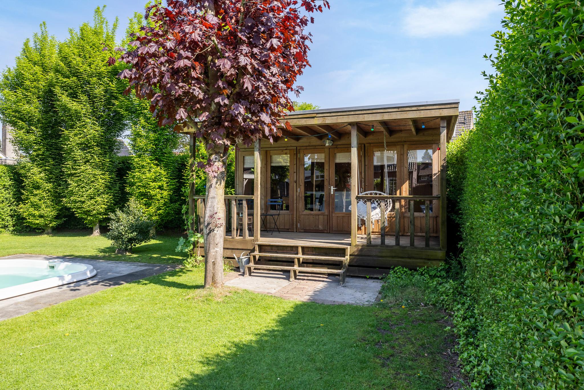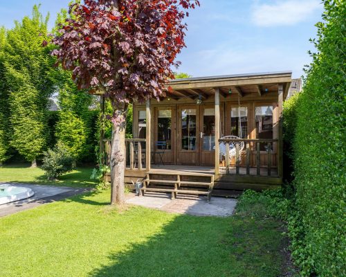 Achter de woning ligt een prachtige tuin, georiënteerd op het zuidoosten. De tuin is omzoomd met groenblijvende, strak geschoren ligusterhagen. Dankzij het ruime perceel ben je hier altijd verzekerd van een plekje in de zon of je kiest juist voor een schaduwrijke plek. Bovendien geniet je hier optimaal van je privacy; of je nu relaxt bij het zwembad, samen dineert op het terras achter de woning of gezellig samenkomt onder de sfeervolle overkapping. Een heerlijke plek met kleurrijke glas-in-loodramen en houtkachel voor een sfeer verhogend effect. Tot slot staat achter op het perceel, naast het zwembad, een sfeervol tuinhuis met een veranda. Een heerlijke plek om in je hangmat weg te dromen tijdens de mooie zomerdagen en te genieten van de avondzon. Deze plek leent zich ook uitstekend voor opgroeiende kinderen, een ideale chillruimte waar dankzij de isolatie ook in de wintermaanden gebruik van gemaakt kan worden.