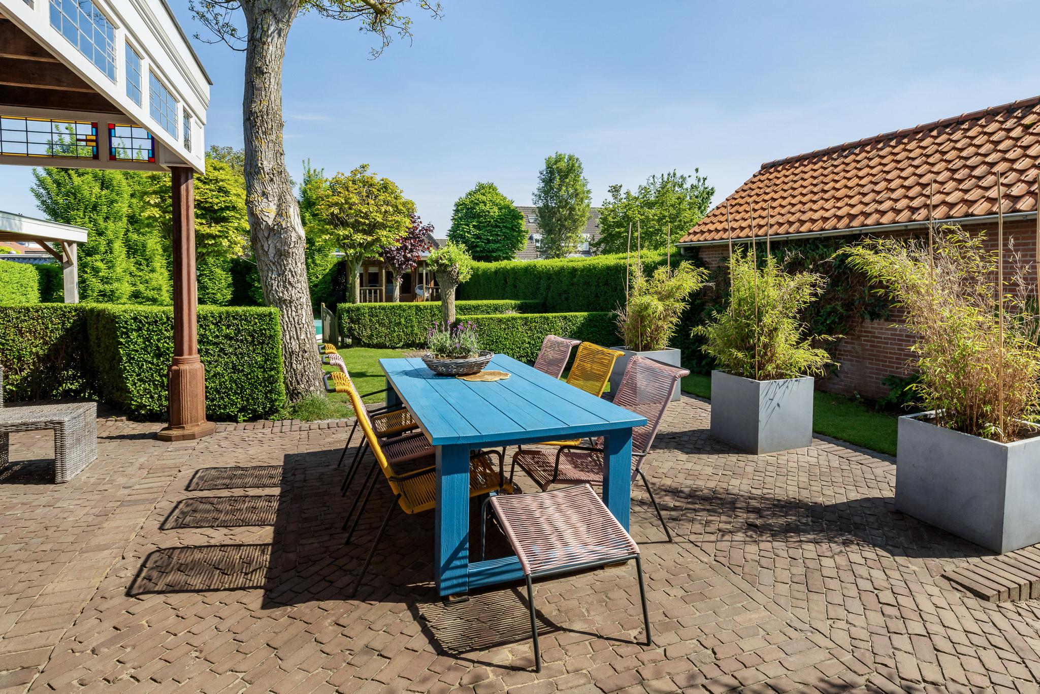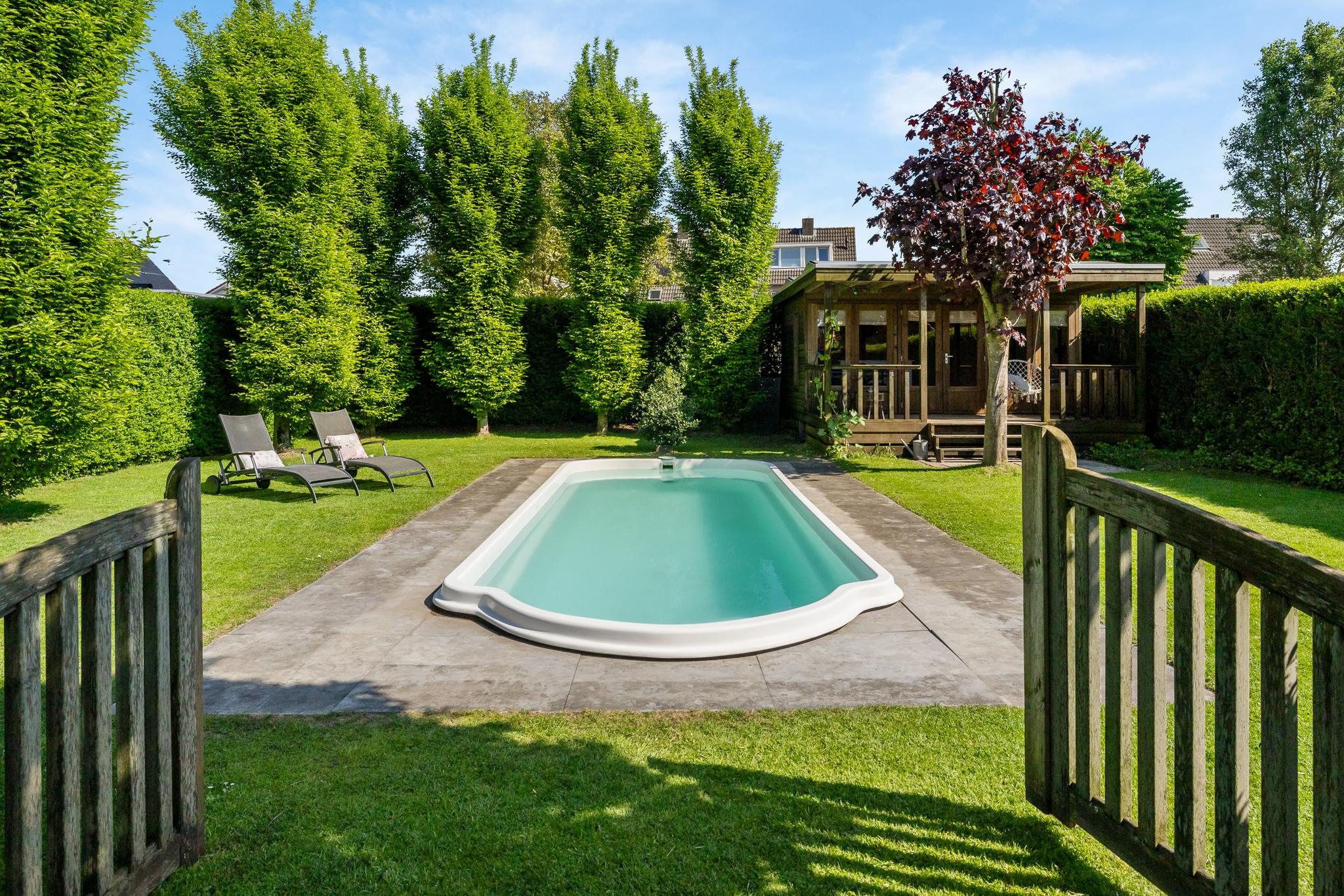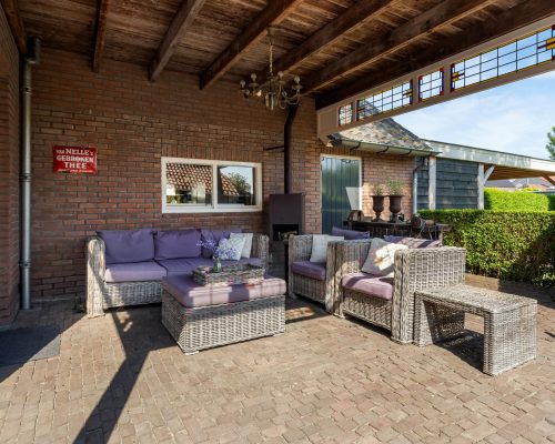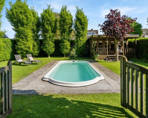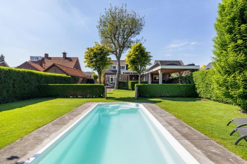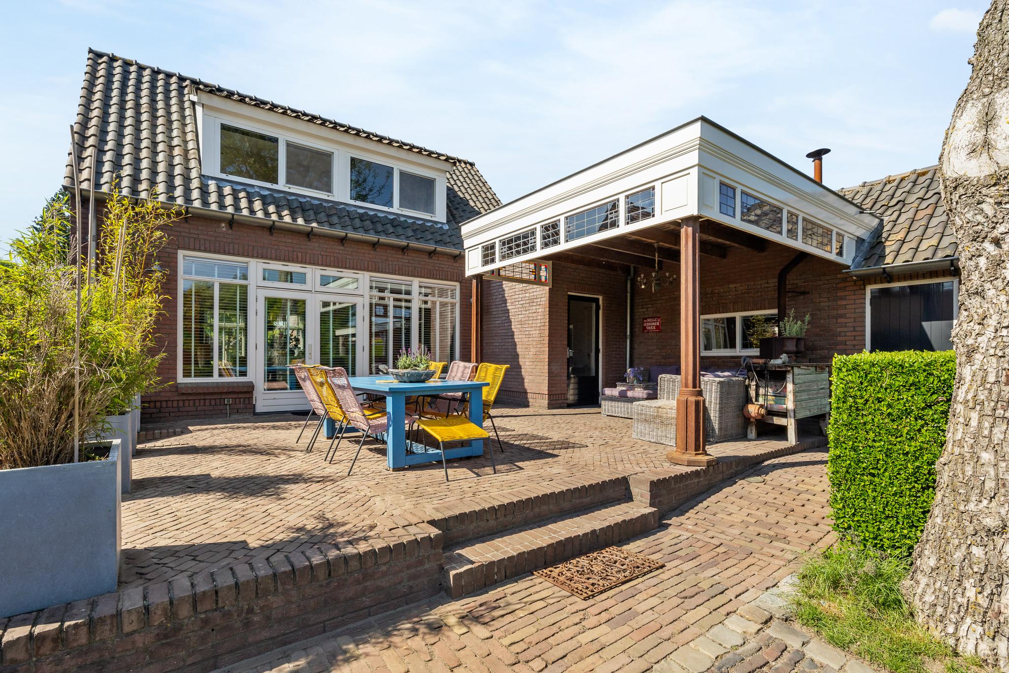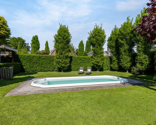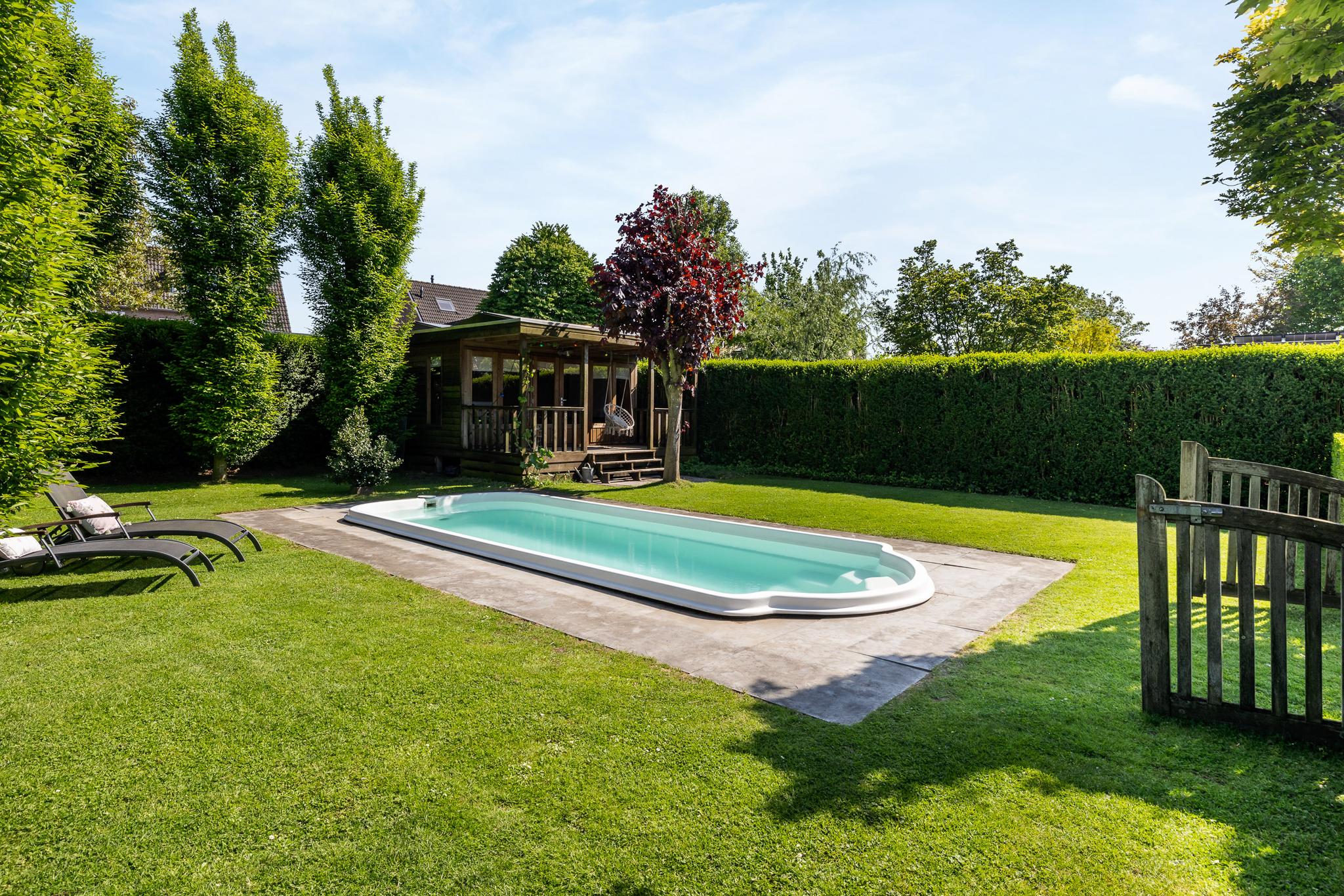 Achter de woning ligt een prachtige tuin, georiënteerd op het zuidoosten. De tuin is omzoomd met groenblijvende, strak geschoren ligusterhagen. Dankzij het ruime perceel ben je hier altijd verzekerd van een plekje in de zon of je kiest juist voor een schaduwrijke plek. Bovendien geniet je hier optimaal van je privacy; of je nu relaxt bij het zwembad, samen dineert op het terras achter de woning of gezellig samenkomt onder de sfeervolle overkapping. Een heerlijke plek met kleurrijke glas-in-loodramen en houtkachel voor een sfeer verhogend effect. Tot slot staat achter op het perceel, naast het zwembad, een sfeervol tuinhuis met een veranda. Een heerlijke plek om in je hangmat weg te dromen tijdens de mooie zomerdagen en te genieten van de avondzon. Deze plek leent zich ook uitstekend voor opgroeiende kinderen, een ideale chillruimte waar dankzij de isolatie ook in de wintermaanden gebruik van gemaakt kan worden.