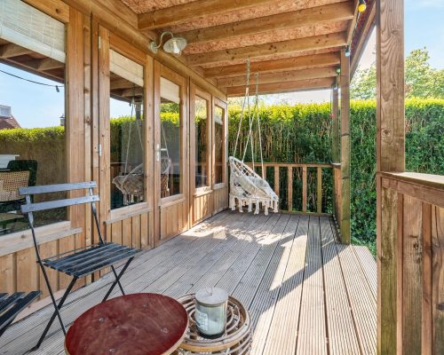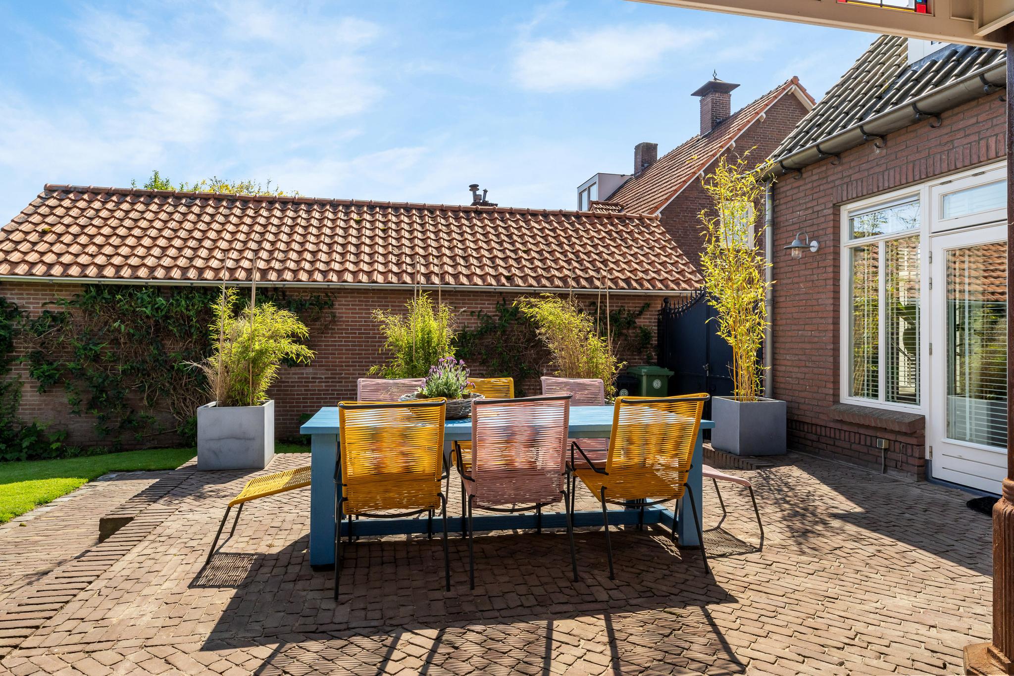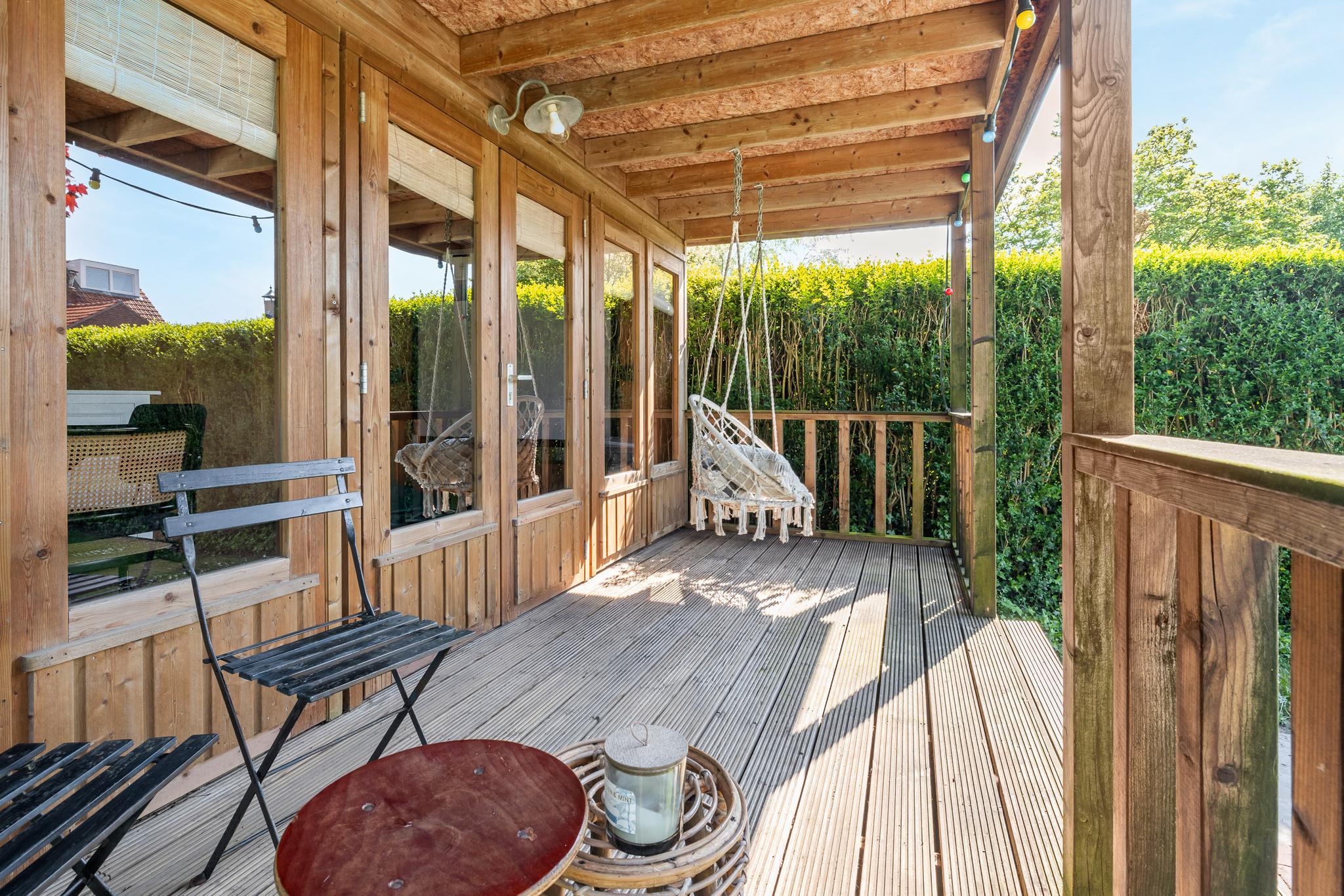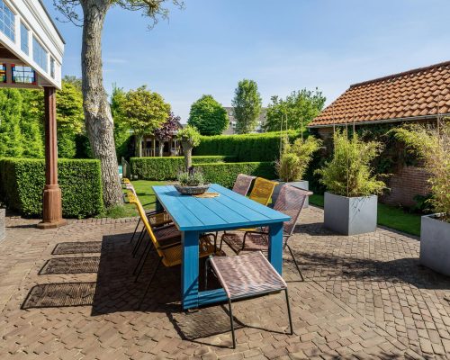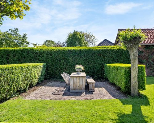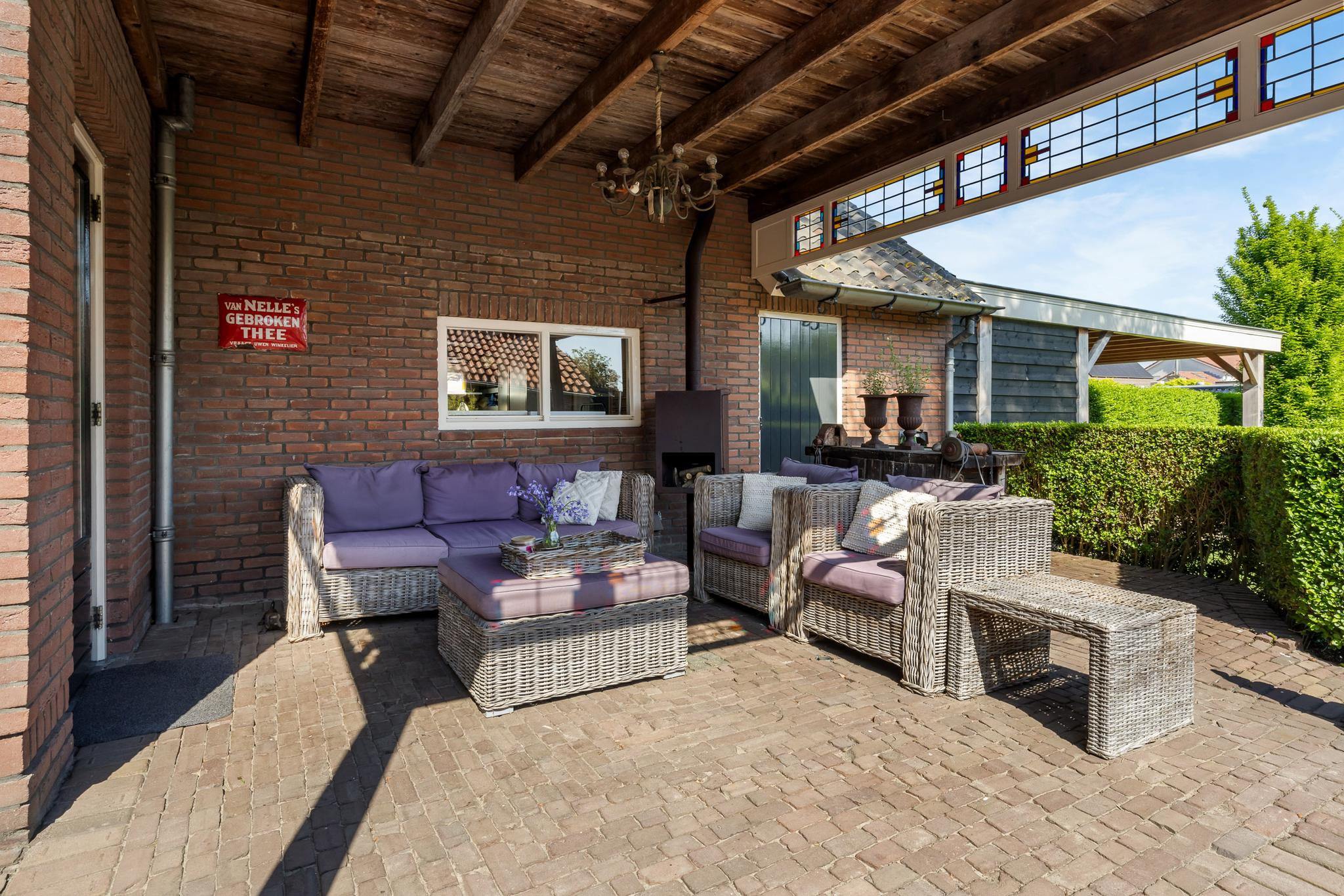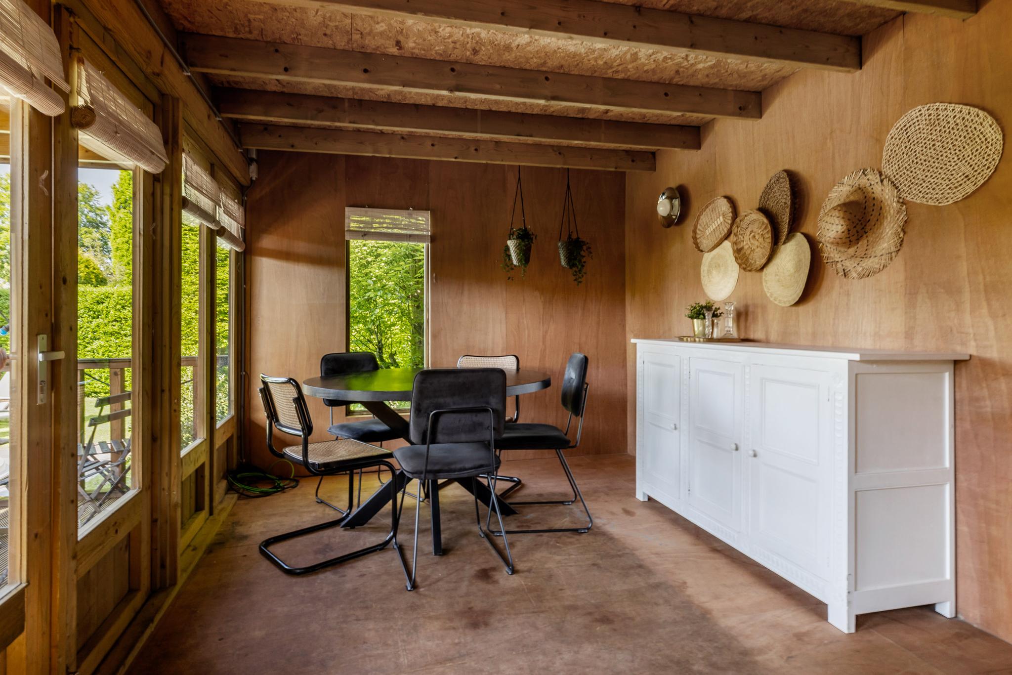 Achter de woning ligt een prachtige tuin, georiënteerd op het zuidoosten. De tuin is omzoomd met groenblijvende, strak geschoren ligusterhagen. Dankzij het ruime perceel ben je hier altijd verzekerd van een plekje in de zon of je kiest juist voor een schaduwrijke plek. Bovendien geniet je hier optimaal van je privacy; of je nu relaxt bij het zwembad, samen dineert op het terras achter de woning of gezellig samenkomt onder de sfeervolle overkapping. Een heerlijke plek met kleurrijke glas-in-loodramen en houtkachel voor een sfeer verhogend effect. Tot slot staat achter op het perceel, naast het zwembad, een sfeervol tuinhuis met een veranda. Een heerlijke plek om in je hangmat weg te dromen tijdens de mooie zomerdagen en te genieten van de avondzon. Deze plek leent zich ook uitstekend voor opgroeiende kinderen, een ideale chillruimte waar dankzij de isolatie ook in de wintermaanden gebruik van gemaakt kan worden.