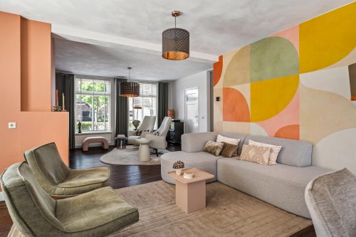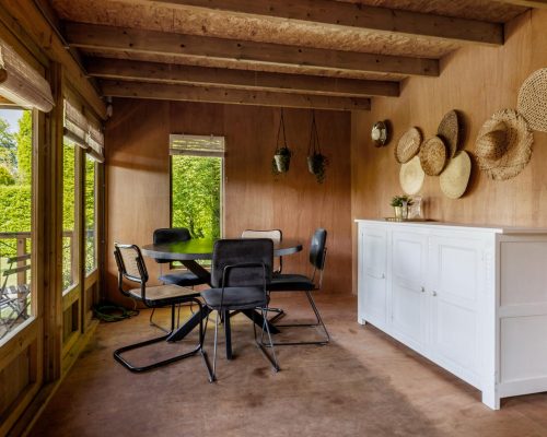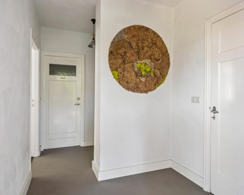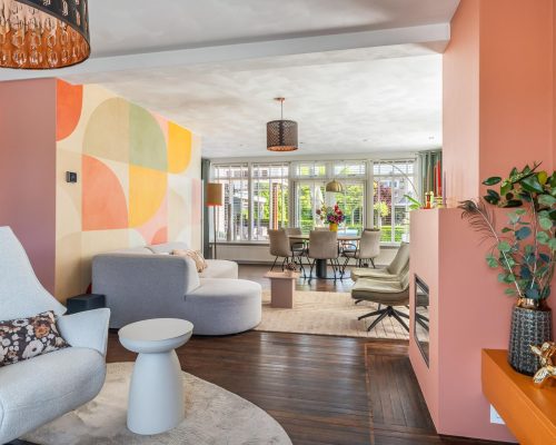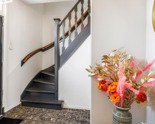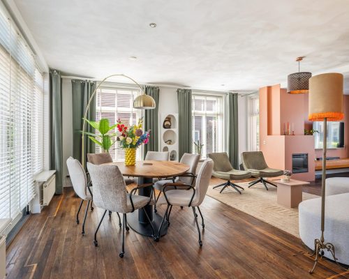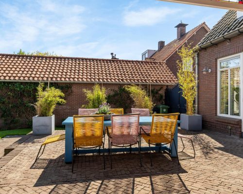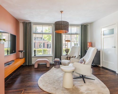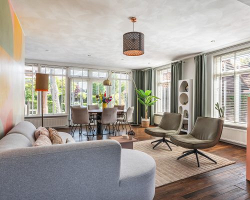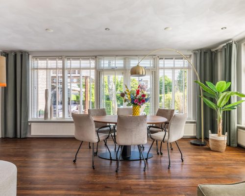 Aan de royale eettafel aan de tuinzijde kijk je uit over de prachtige tuin waar de imposante notenboom een echte blikvanger is. Via de openslaande tuindeuren stap je zó het gezellige terras op. De karakteristieke hardhouten vloer in de woonkamer – afkomstig uit een voormalige school in Veghel – vormt samen met het strakke stucwerk, de grote raampartijen en de moderne wandafwerking een stijlvol geheel. Een ruimte met karakter, warmte en een welkom gevoel. Je voelt je hier direct thuis.