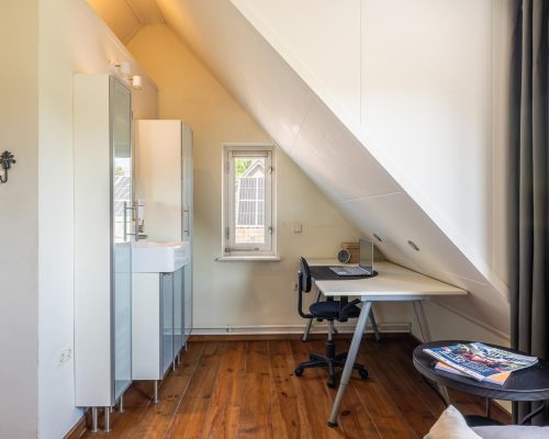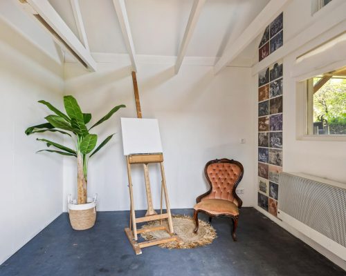 Aangrenzend aan de garage vind je het atelier. Een mooie plek voor hobbydoeleinden of om bijvoorbeeld een chillruimte of thuiswerkplek te realiseren. Deze ruimte wordt verwarmd met een gevelkachel. Hier vind je ook de techniek voor het zwembad en een loopdeur naar het terras.