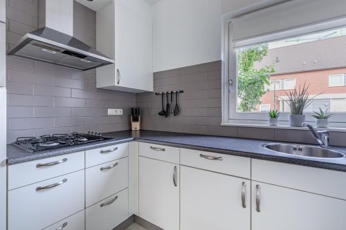 De keuken is uitgevoerd in een lichte kleurstelling en heeft een donkergrijs kunststof aanrechtblad.