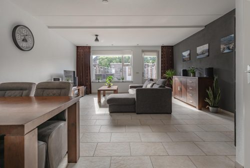 Via de hal loop je de woonkamer in. Deze is 2,5 meter uitgebouwd en daardoor royaal van opzet. Een ruime zit- en eethoek kun je hier prima kwijt. De open keuken ligt aan de voorzijde van de woning. Dankzij het raam boven het aanrecht krijg je hier lekker veel daglicht op je werkblad en heb je een mooi uitzicht op het speeltuintje dat schuin tegenover de woning ligt. De ruime voorraadkast onder de trap in de woonkamer is een praktische opbergplek.
